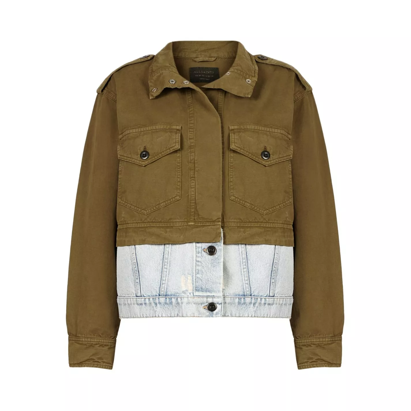 Elevate your collection with this All Saints Cadie Mil Jacket. Crafted with a folded collar and full button fastening for a secure fit, it features long sleeves with button cuffs and two chest pockets for a classic look. This jacket is a colour block design with a signature logo and is complete with All Saints branding.