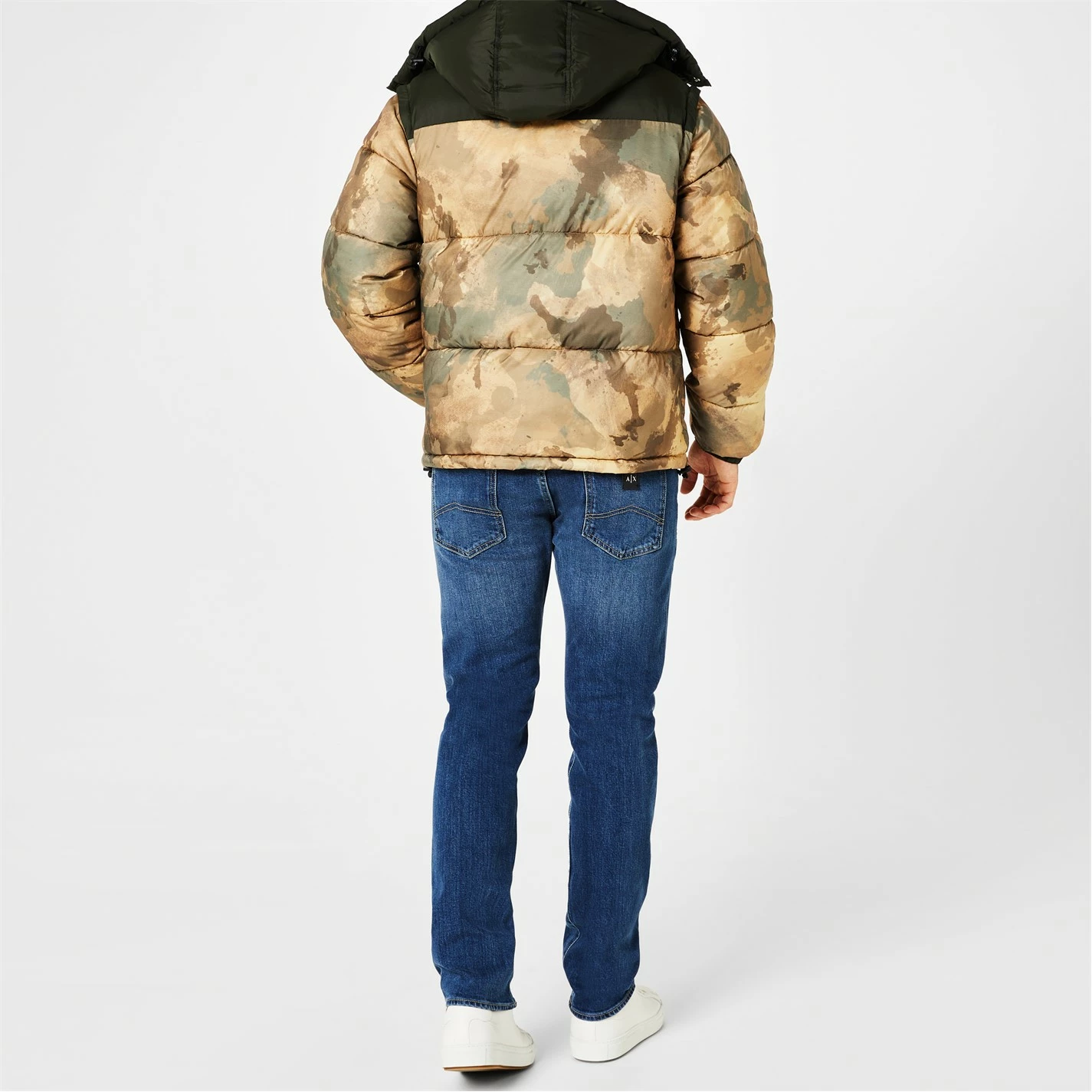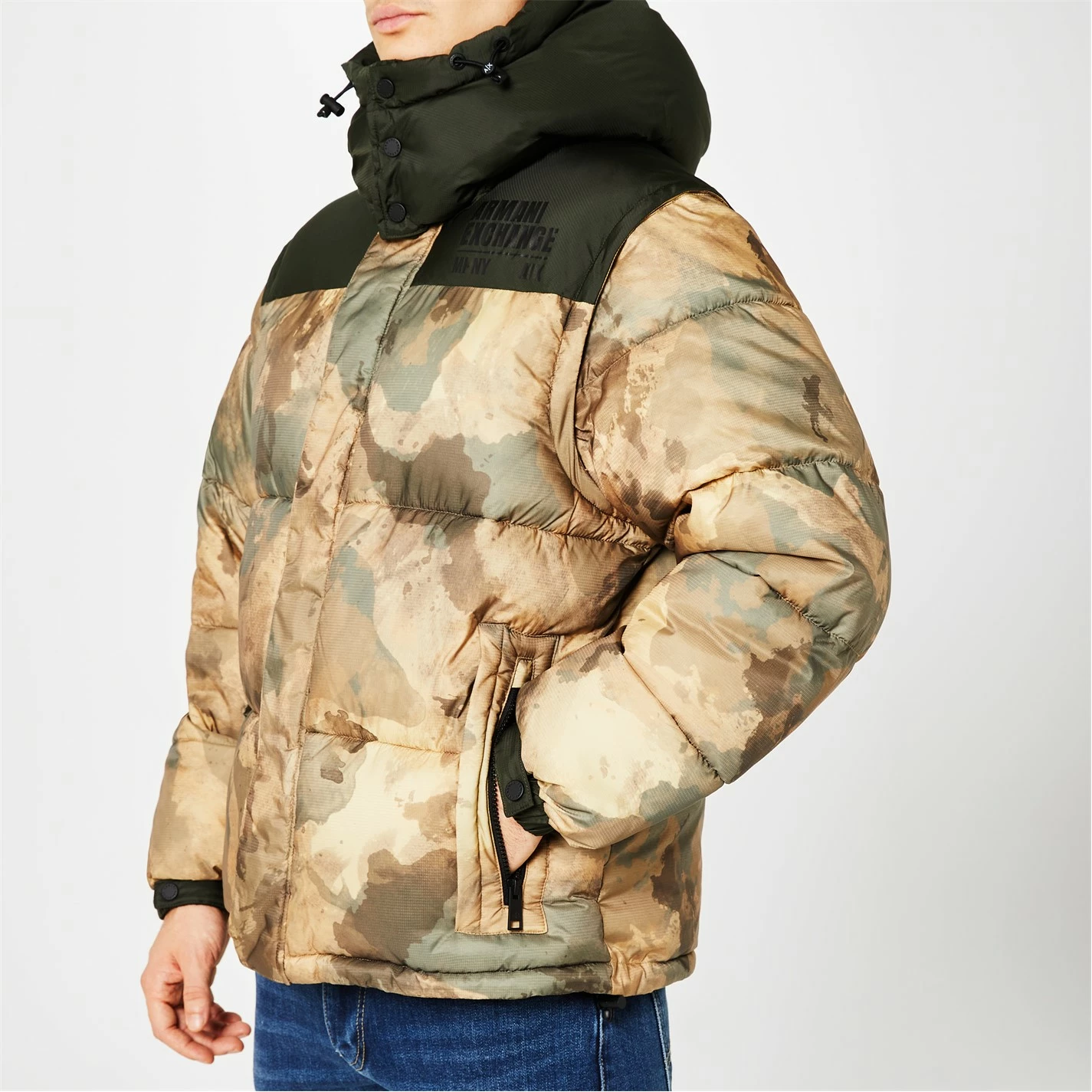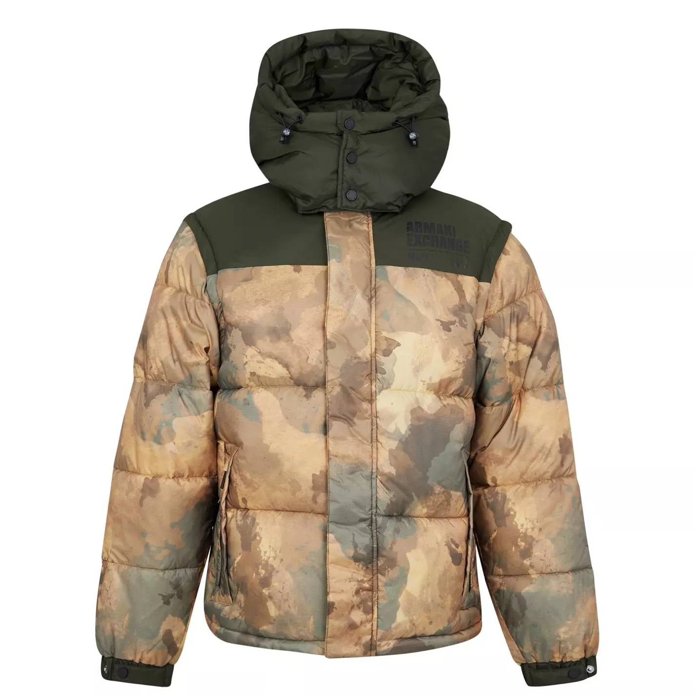 Elevate your outerwear with the Camouflage Puffer Jacket from Armani Exchange. Expertly crafted in a durable polyester fabrication, this jacket is cut in a regular fit for a classic style and features a detachable hooded neckline, detachable long sleeves with adjustable buttoned cuffs, a central two way zip fastening, additional popper fastenings and a straight hem with an adjustable drawstring fastening for comfort. The look is elevated with the Armani Exchange a contrast colourway for the hood and shoulders and a camouflage print to the rest of the body. Dry Clean Only.