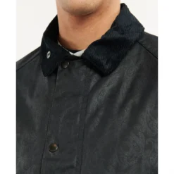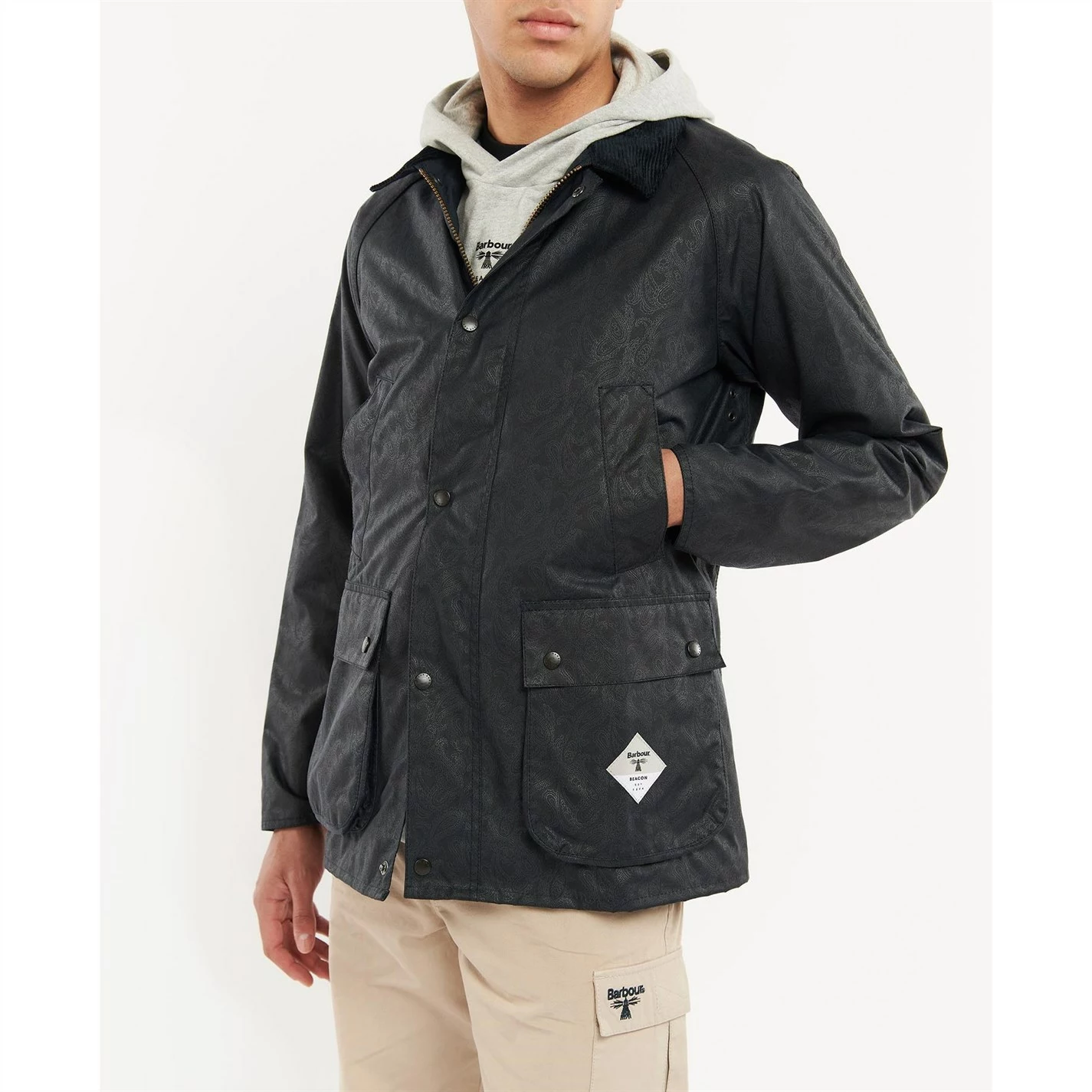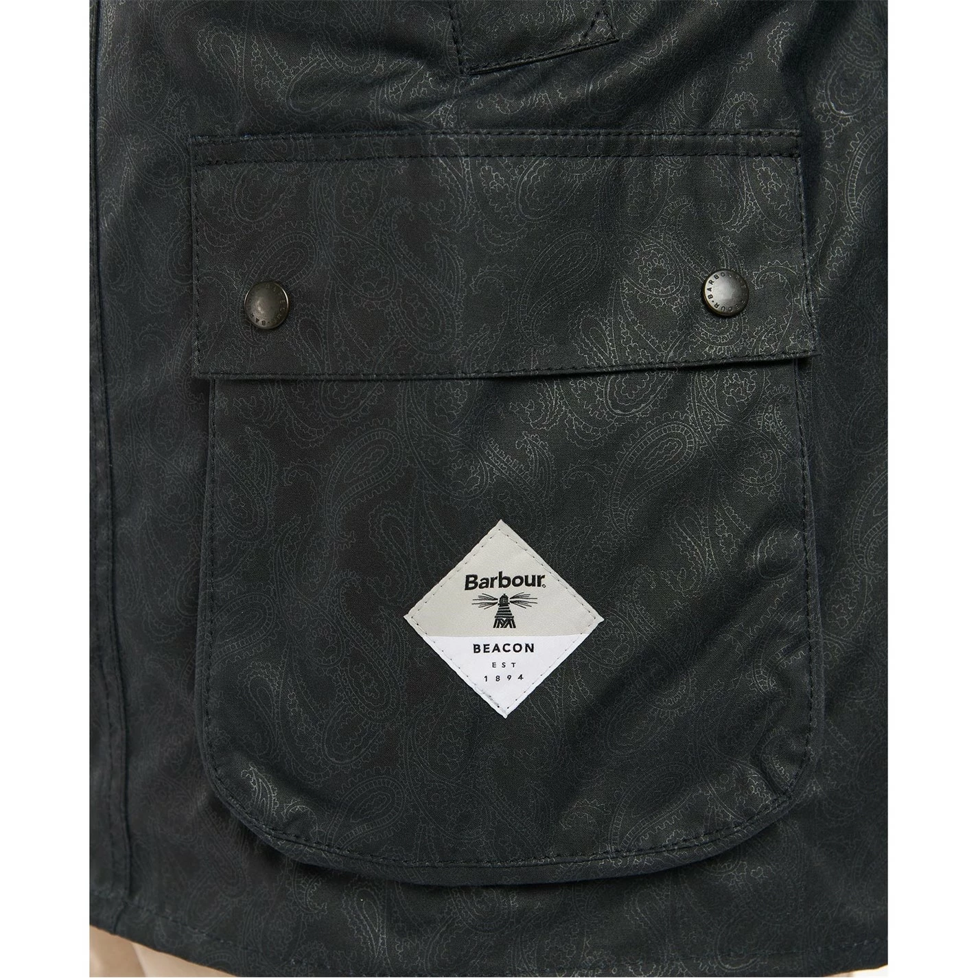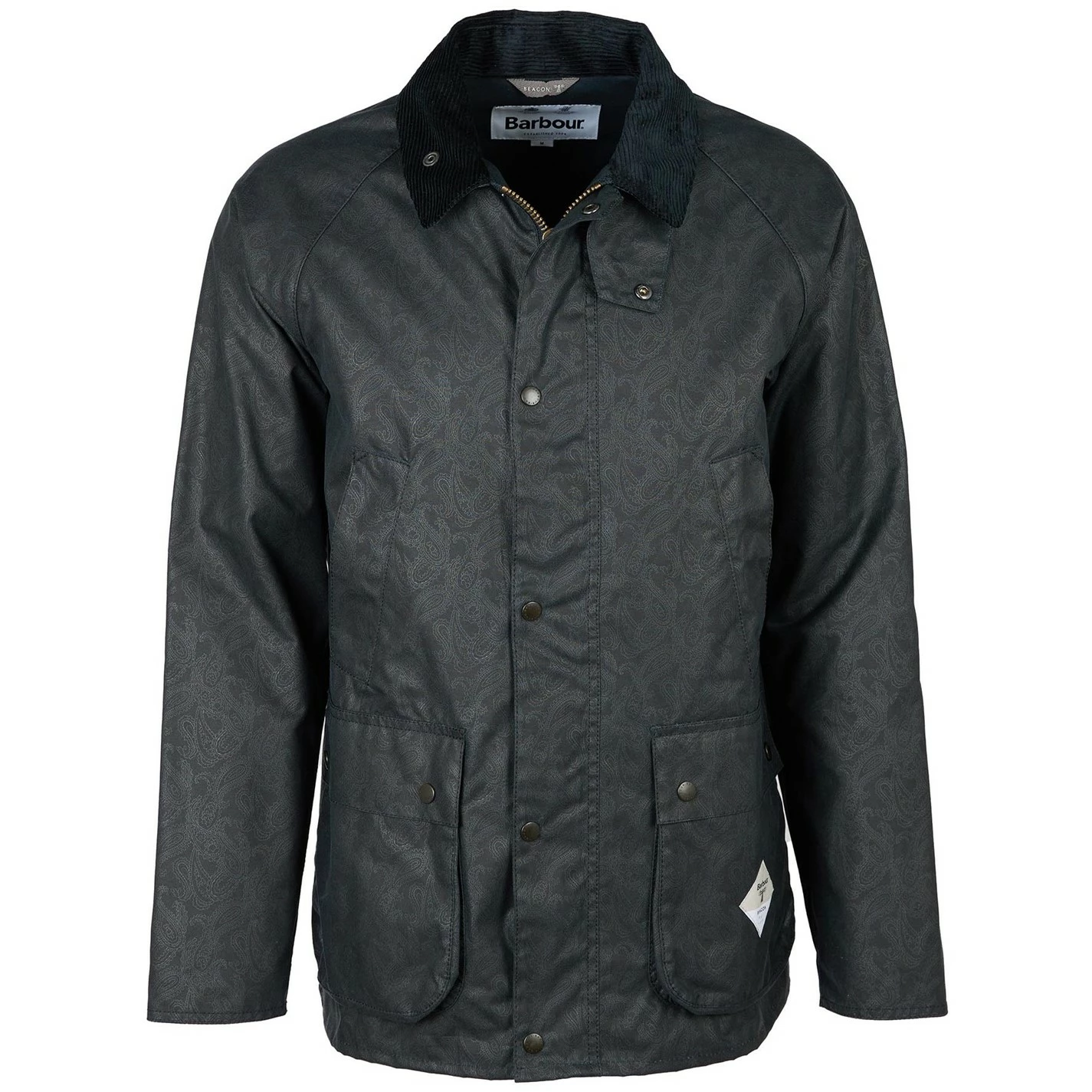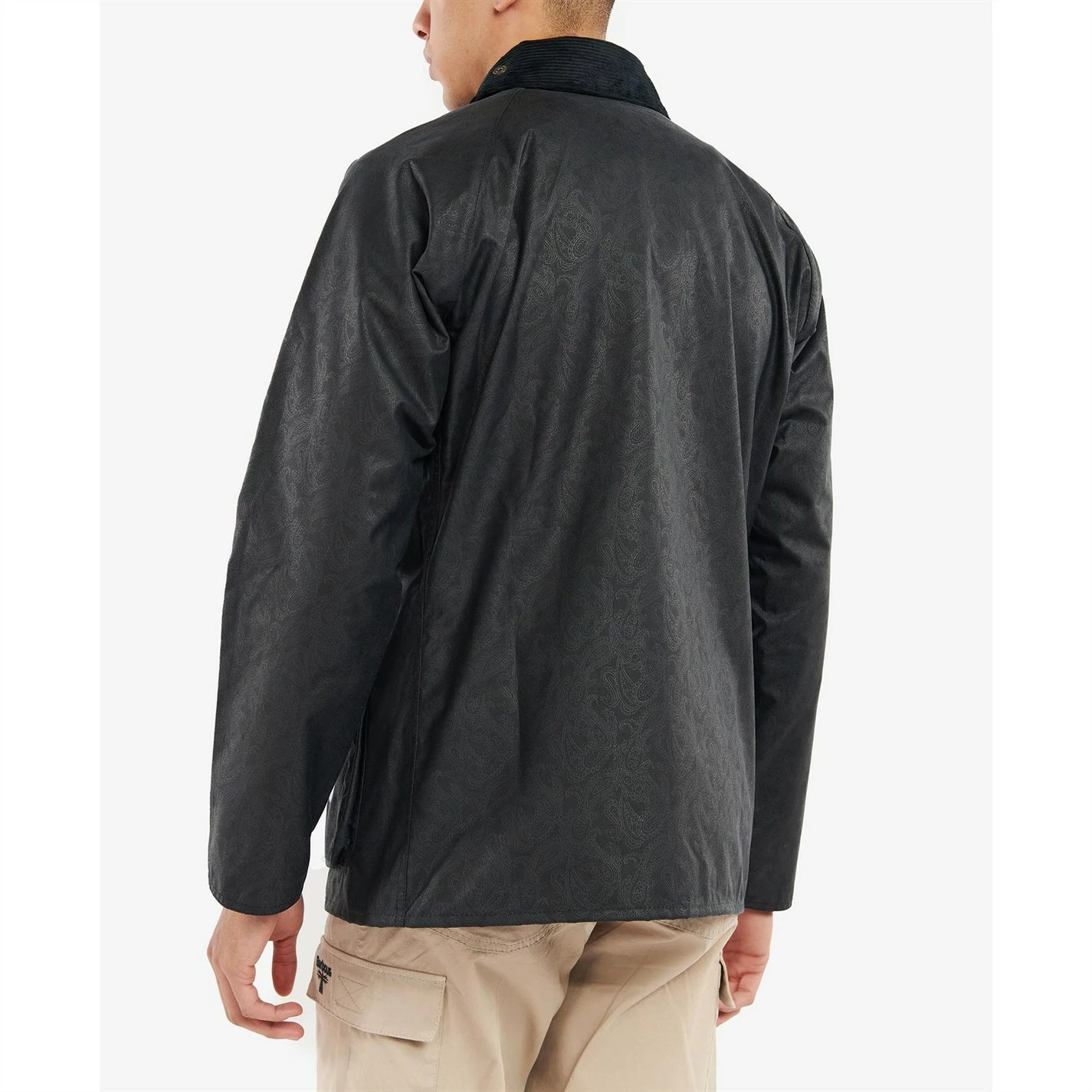 The Barbour Beacon Paisley Bedale Wax Jacket boasts an all over paisley print design with a classic cord collar. Showcasing a stud and zip front fastening, this jacket features a cotton lining for a breathable addition with hand warmer and lower bellows pockets. This jacket is effortlessly finished with a grey and white Beacon patch woven to the lower left pocket.