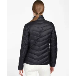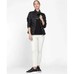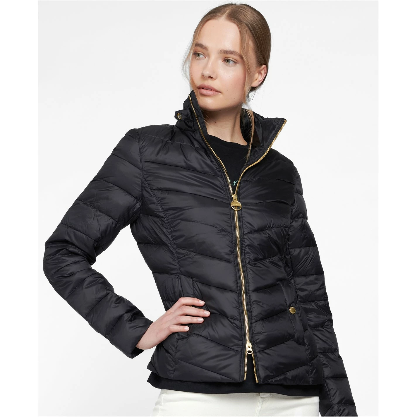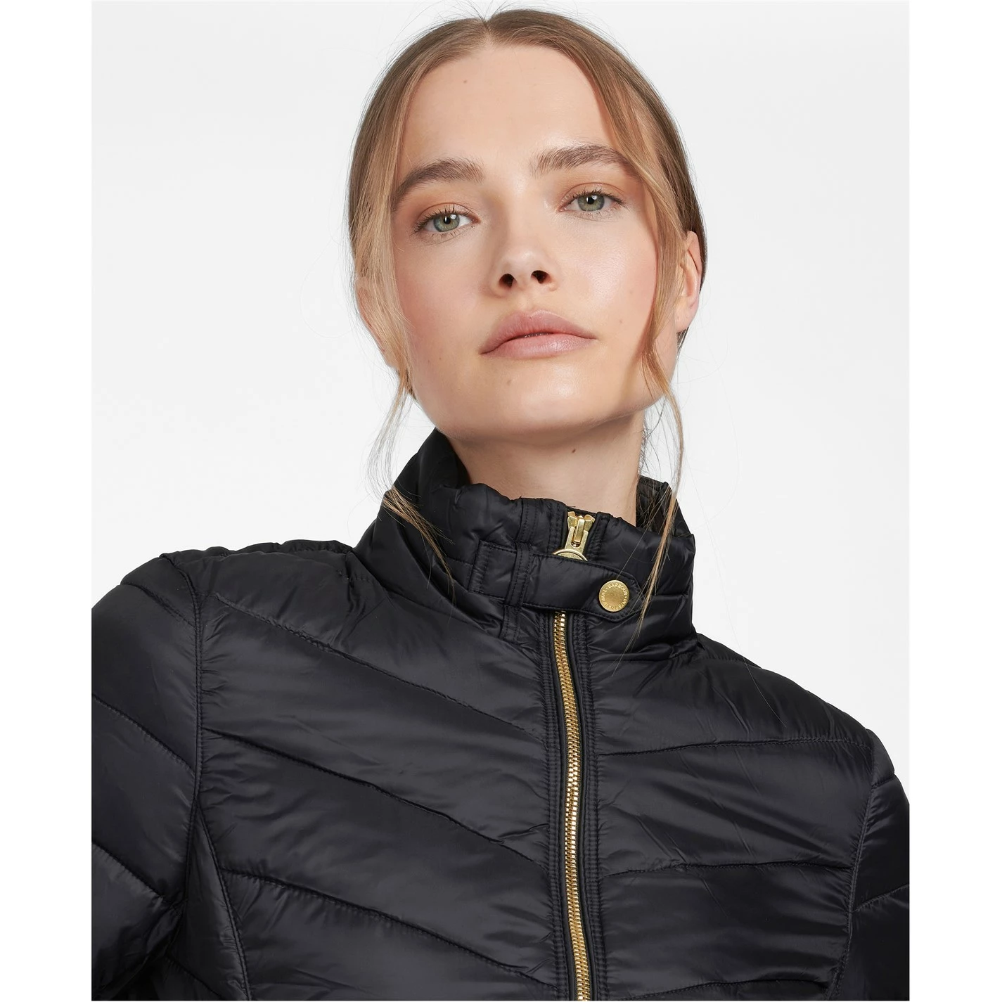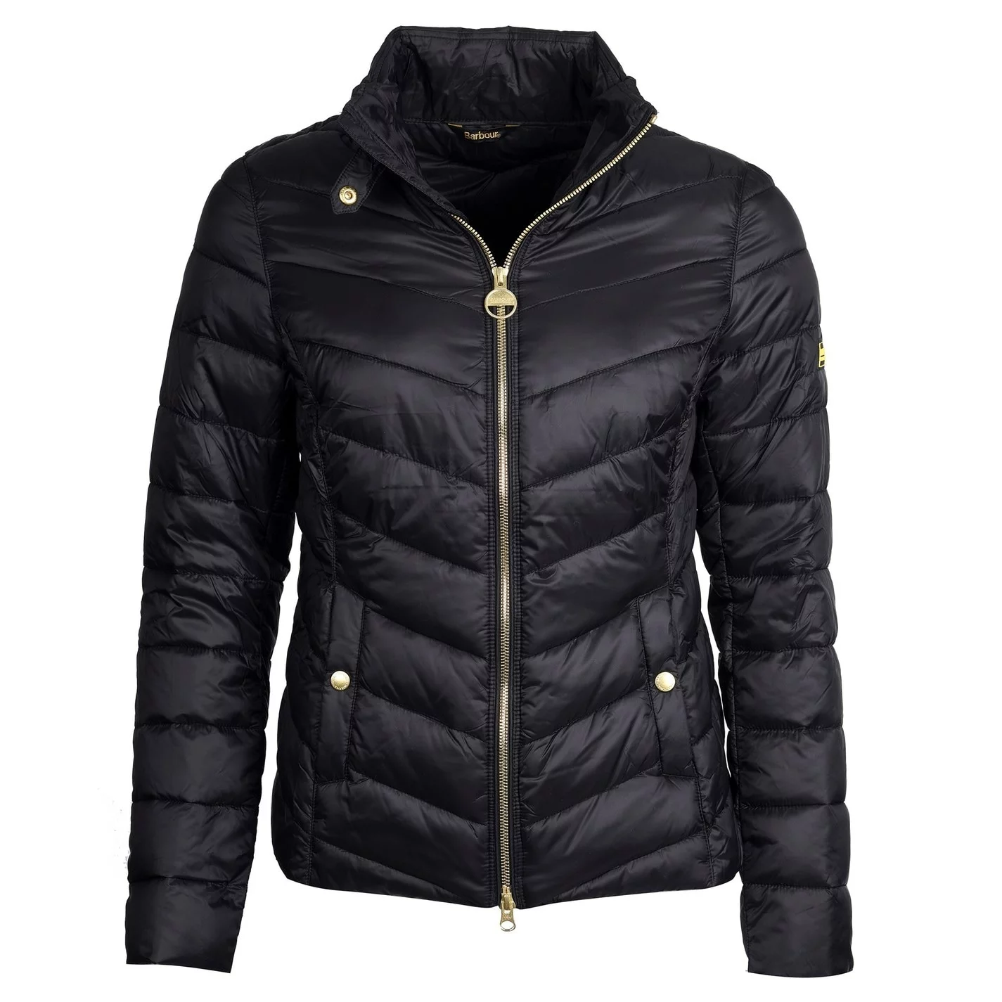 Featuring chevron quilting through the body and baffle-quilted sleeves, this cosy jacket is cut to a slim silhouette with a shorter length. The stand collar carries a biker-inspired strap, while an exposed two-way zip adds a flash of bright metal to round off the subtly luxurious aesthetic.