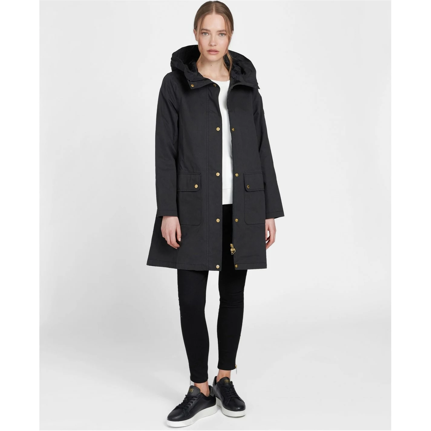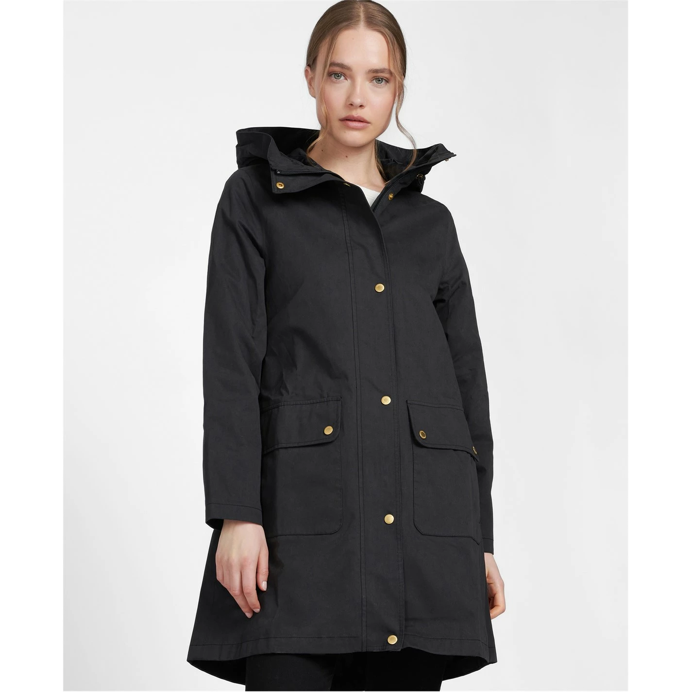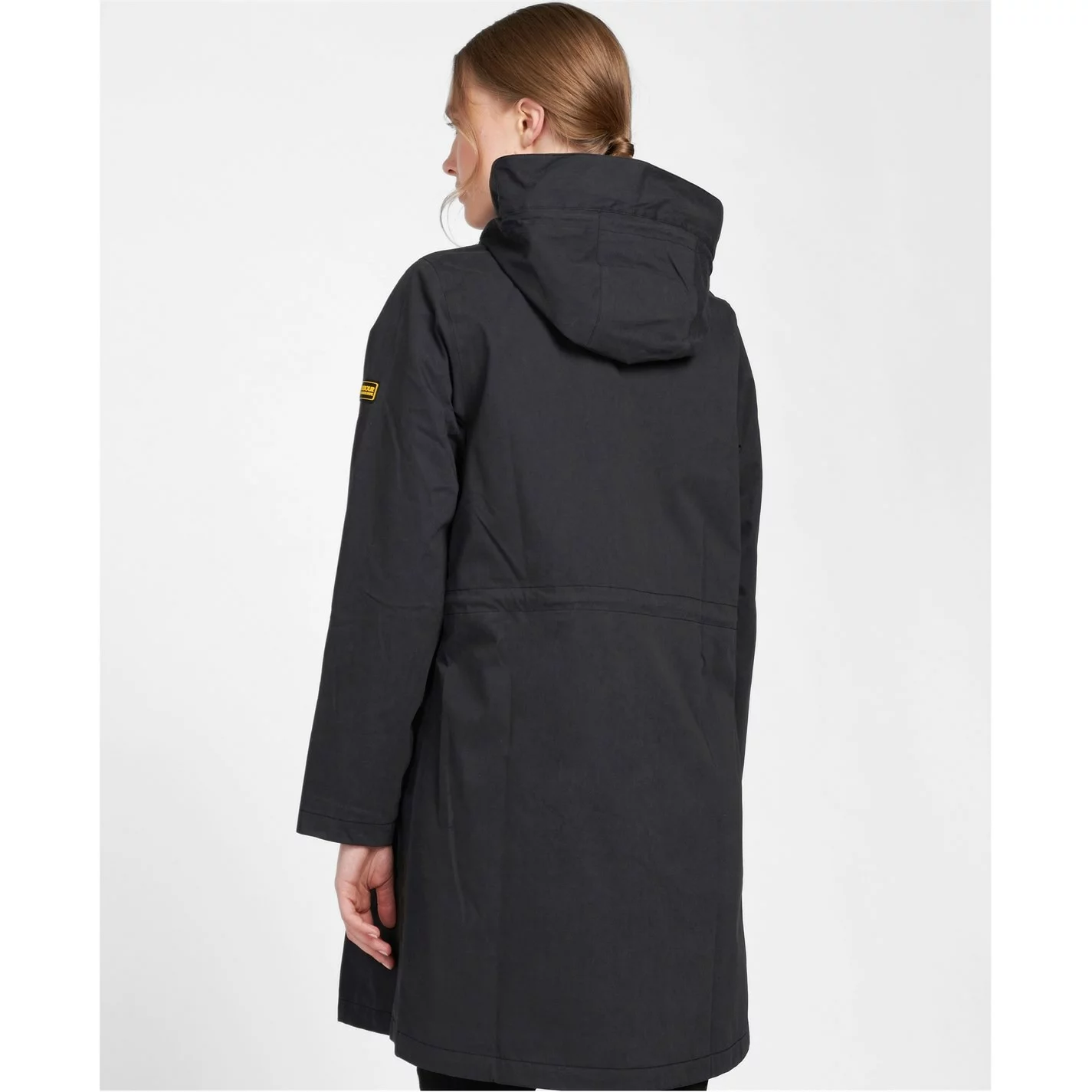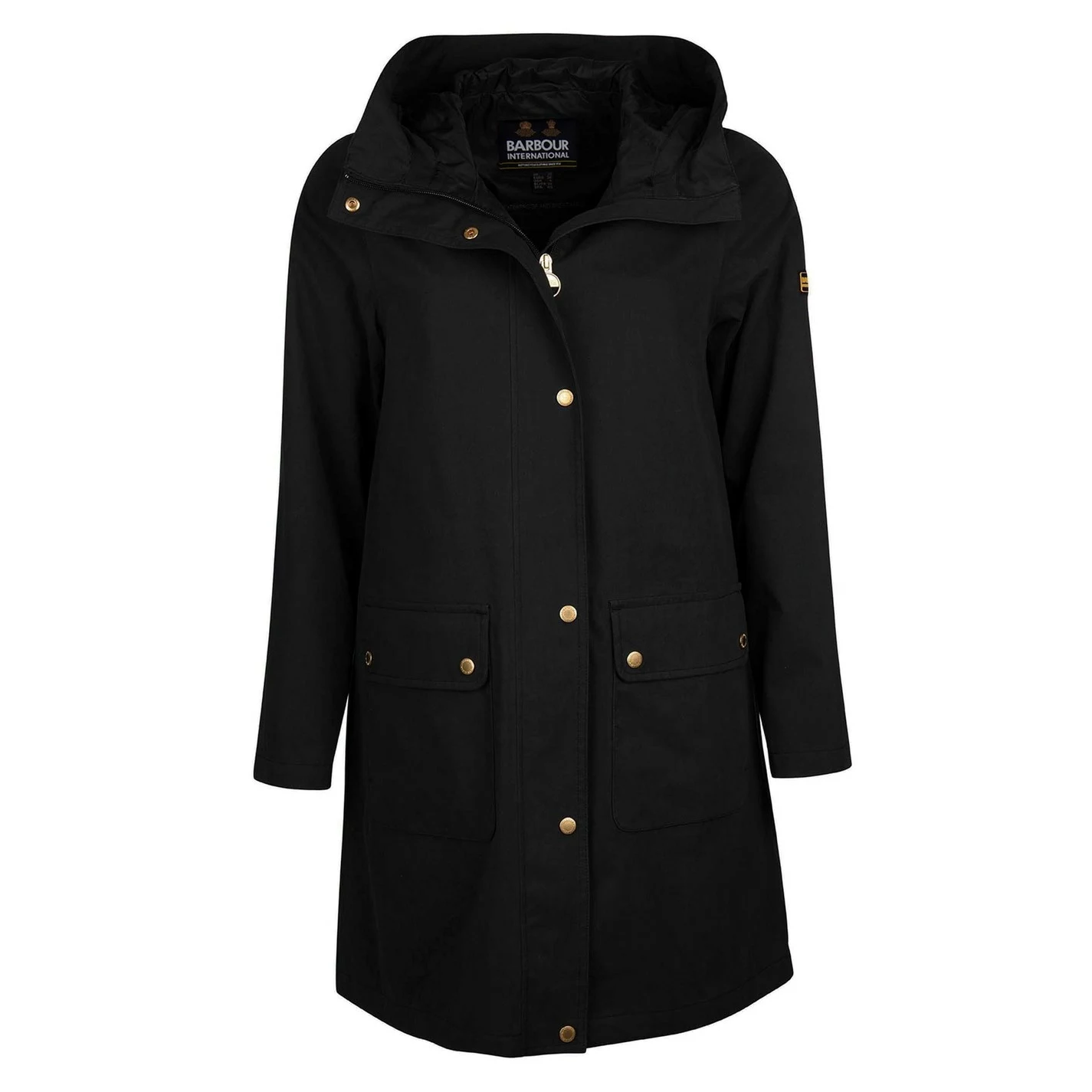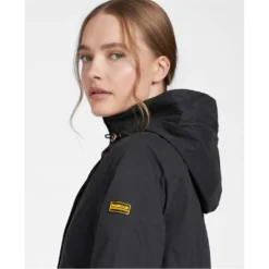 The Barbour International Clypse jacket boasts a longer line slim fit with a fixed hood for unpleasant weather. Boasting patch pockets with side entry and a waist drawcord to the back, this jacket is perfect for adding a stylish layer come rain or shine. Styled with a dipped hem and a press stud fastening, this jacket is finished with a Barbour Inernational branding to the left sleeve.