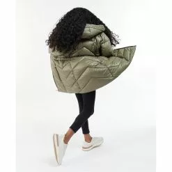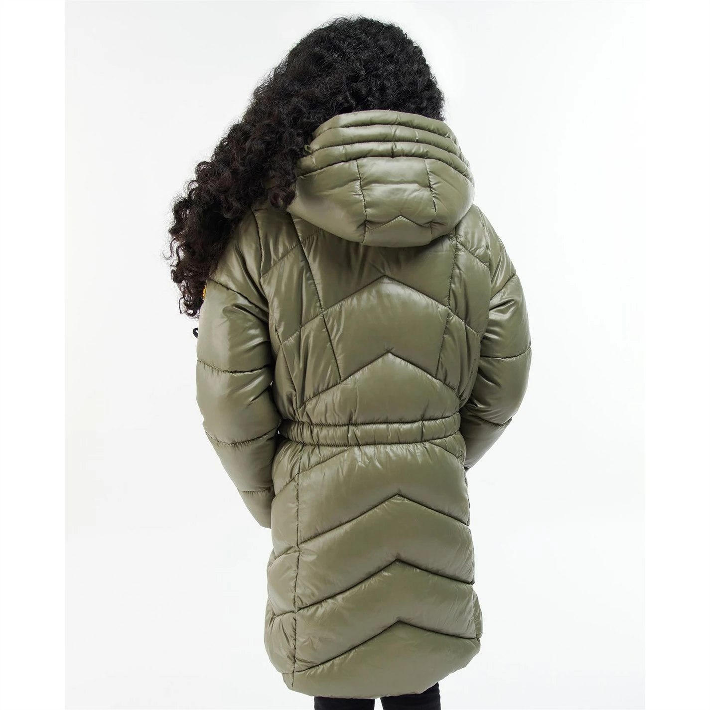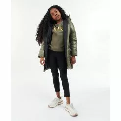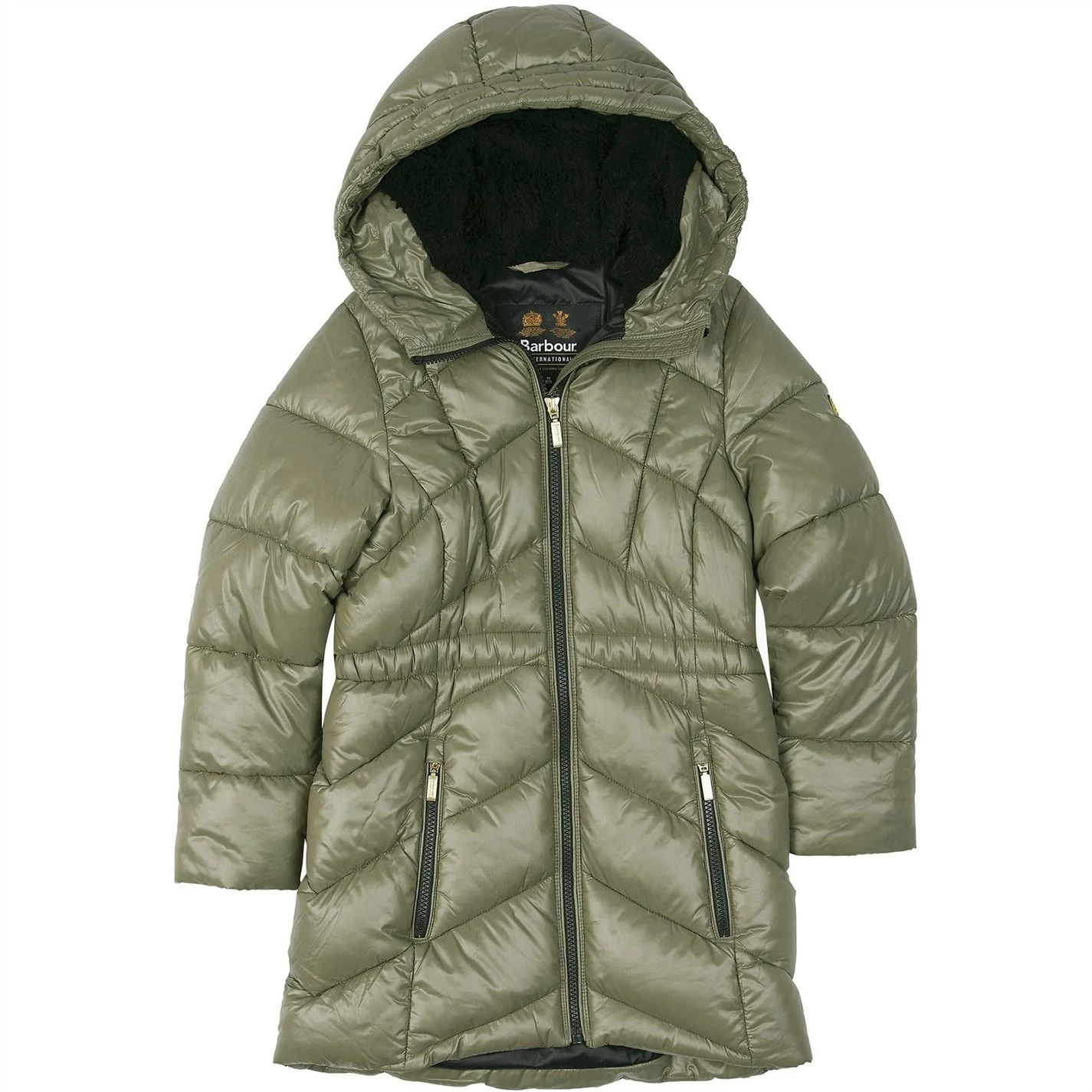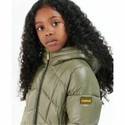 The Barbour International Girls Salta Quilted Jacket boasts a longer line chevron quilted design with an elasticated waist for fit. This style also features a faux fur lined grown on hood and zip pockets for handy storage space.