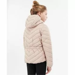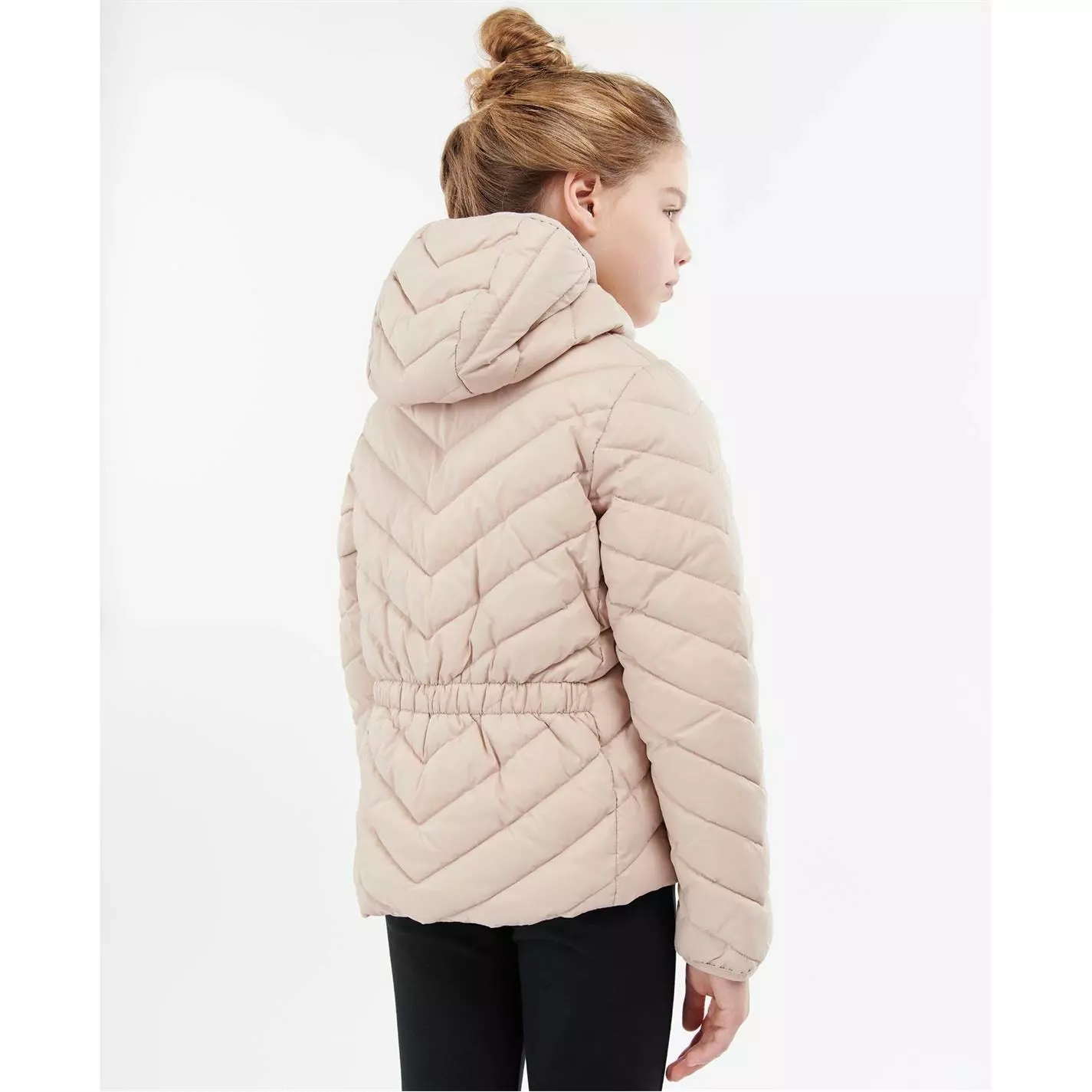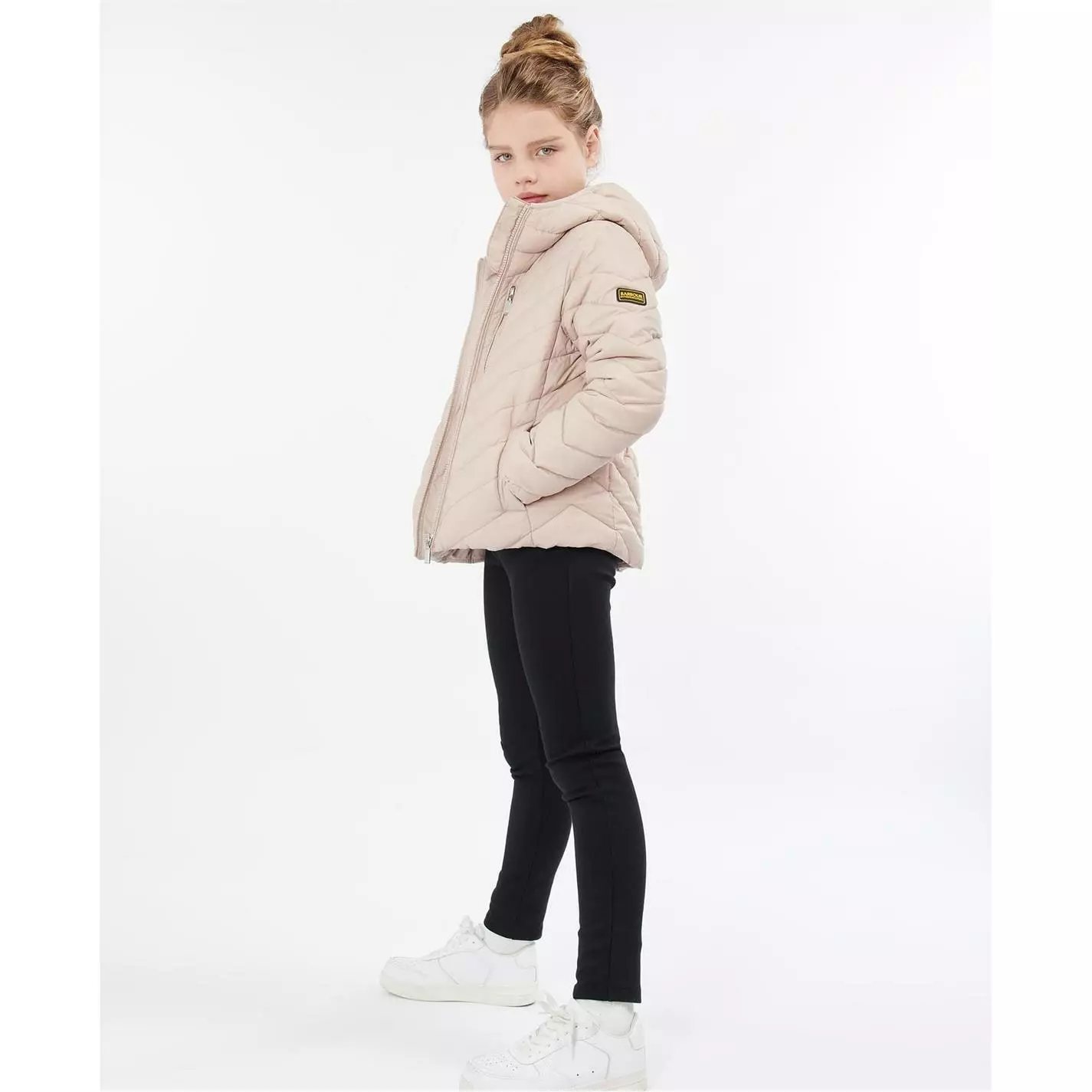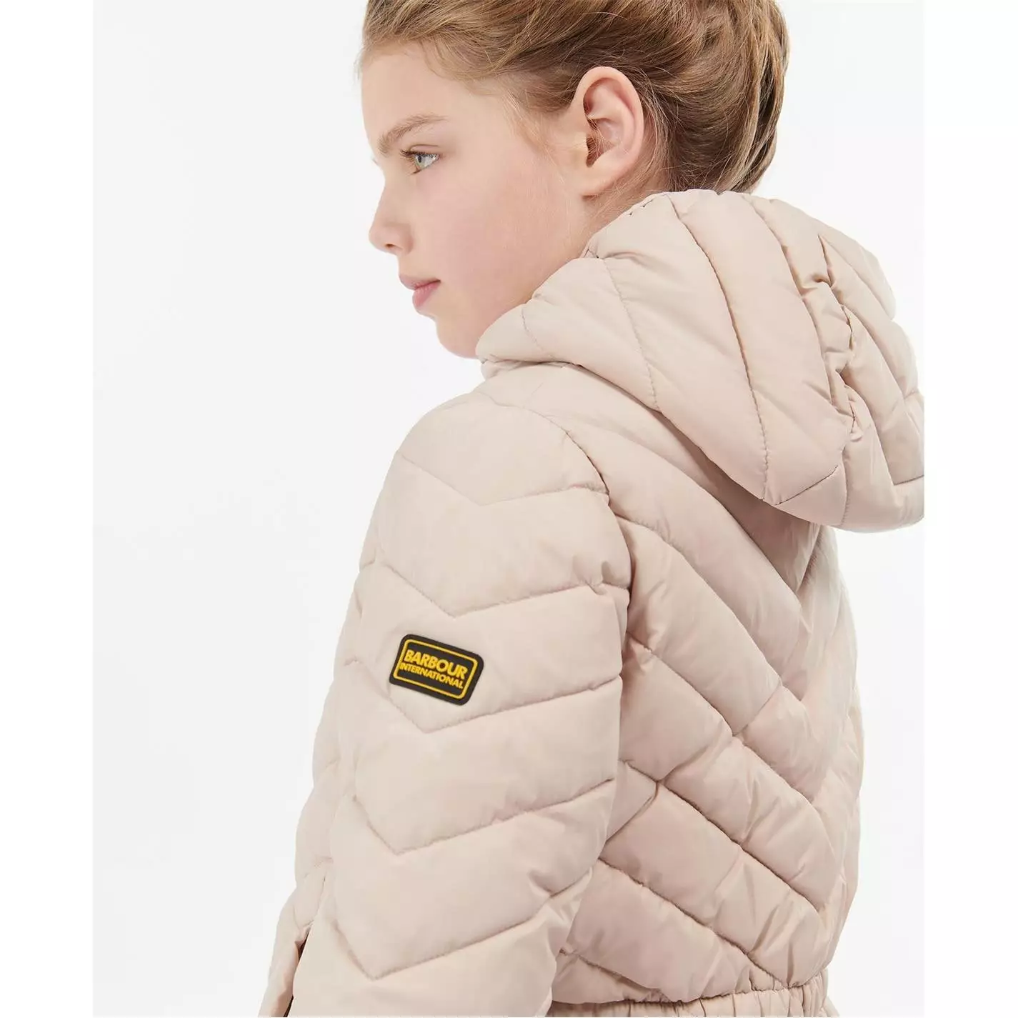 Boasting an all over baffle design, the Barbour International Girls Silverstone Quilted Jacket boasts concealed stud welt pockets with a zip chest pocket detail. Featuring stretch binding to the hood for the perfect fit, this jacket is finished with a branding to the left sleeve.