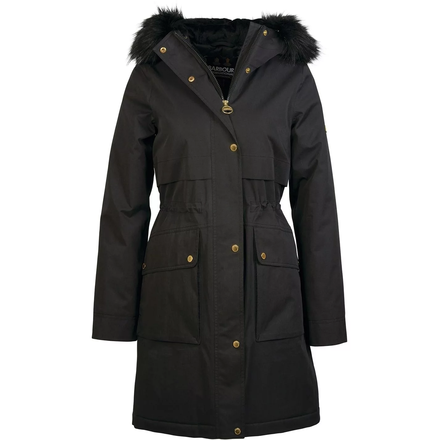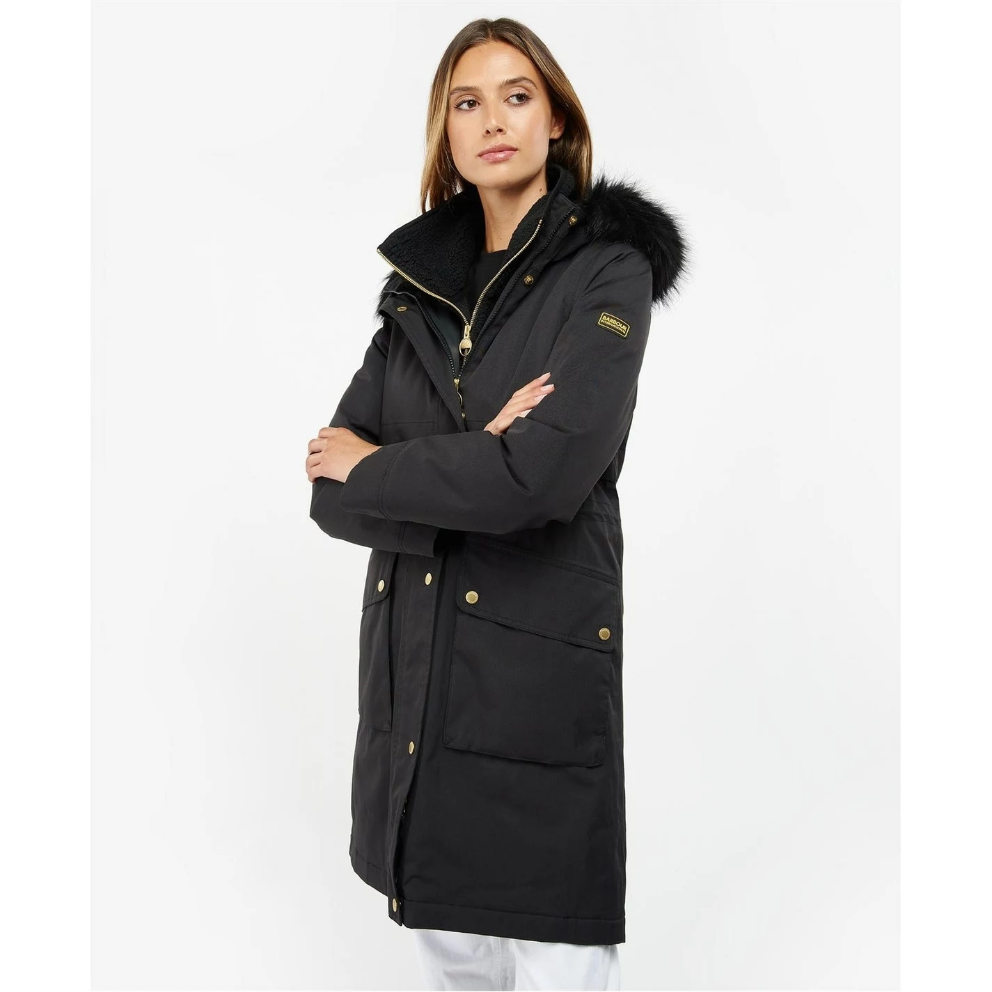 The Barbour International Highroads Jacket boasts a parka jacket inspired style for premium wearing. Showcasing large lower pockets into a chevron seam, this jacket offers a faux fur trim to the hood.