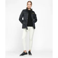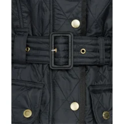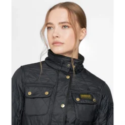From the Tourer collection, Barbour’s famous biker jacket gets set for winter, with the signature polarquilt combination. With all the hallmarks of the original International biker jacket – including four studded pockets, collar strap, sleeve pocket and zipped cuffs – the International Polarquilt stays true to Barbour’s motorcycle heritage. Promising reliable warmth and insulation, the iconic diamond quilted outer is teamed with a cosy 280g polarfleece lining and fleece-lined funnel collar, while the robust two-way zip and studded storm fly front seal out wind and rain. A feminine interpretation of the beloved motorcycle jacket, this stylish ladies’ quilted jacket offers a casual yet flattering fit, thanks to its waist-defining belt. The jacket also comes with the distinctive black and yellow Barbour International logo to the chest pocket.