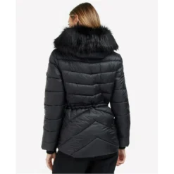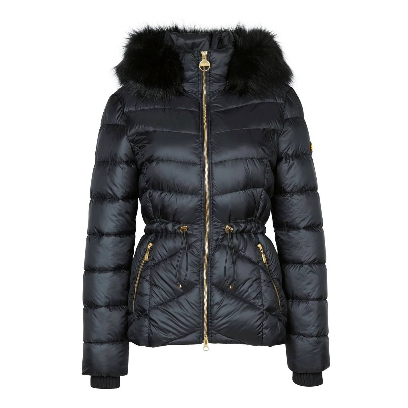 Cut to a streamlined fit with a slightly cropped length and a scooped back hem, this biker-inspired jacket is made with a chevron-quilted outer that delivers exceptional warmth. Ribbed storm cuffs keep draughts at bay, while a two-way zip fastens through the centre front to a stand collar and a hood with a faux-fur trim.