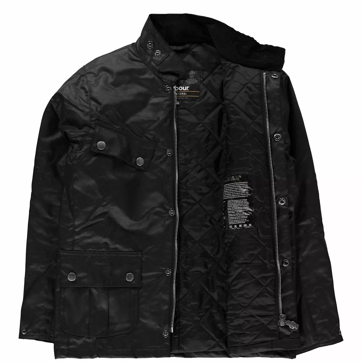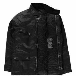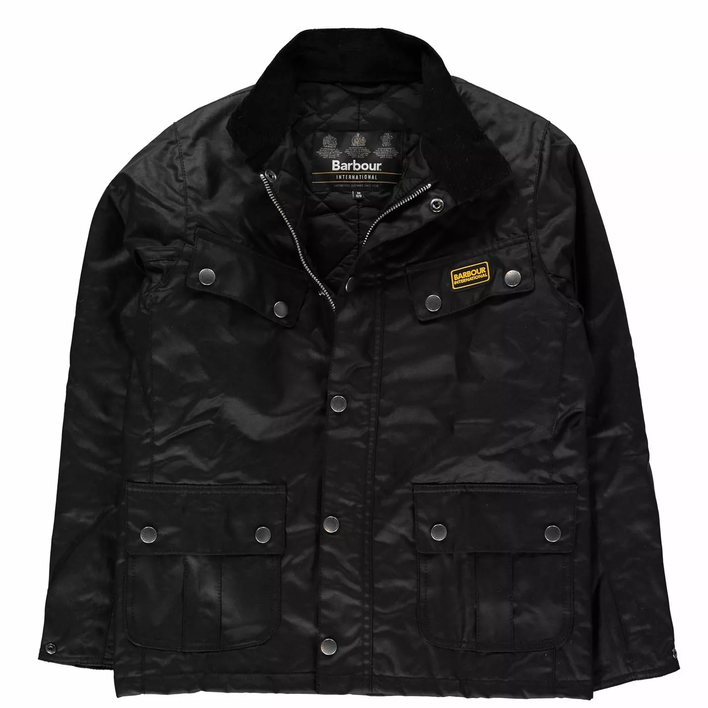 Update your little one’s outerwear wardrobe with the Barbour International Duke Wax Jacket. This chic, vintage jacket is produced in a wax coating supported by quilted lining and a ribbed collar. There are 4 button up pockets located at the front of the jacket and it is fastened by both a zip and silver toned buttons offering maximum closure.