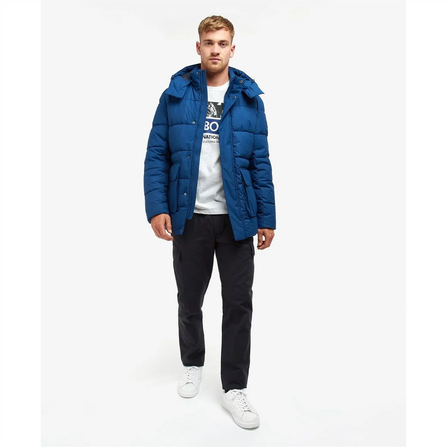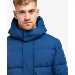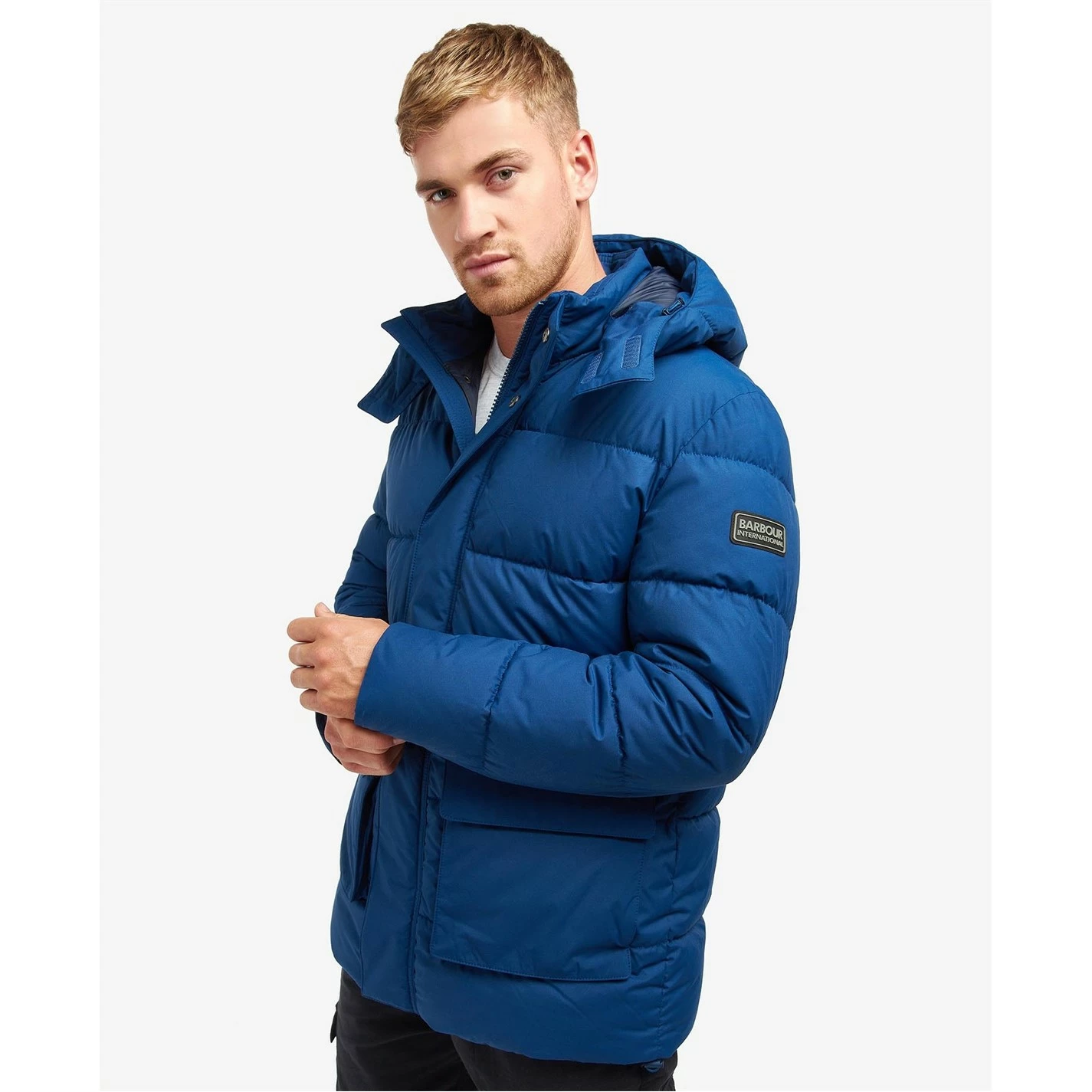 The Barbour International Milton Quilted Jacket boasts a detachable hood and collar detail for versatile wearing. Featuring an all over baffle design, this jacket features a concealed front fastening and two large lower pockets for handy storage space. With an adjustable trim to the hood and hem, this jacket is effortlessly finished with branding to the left sleeve.