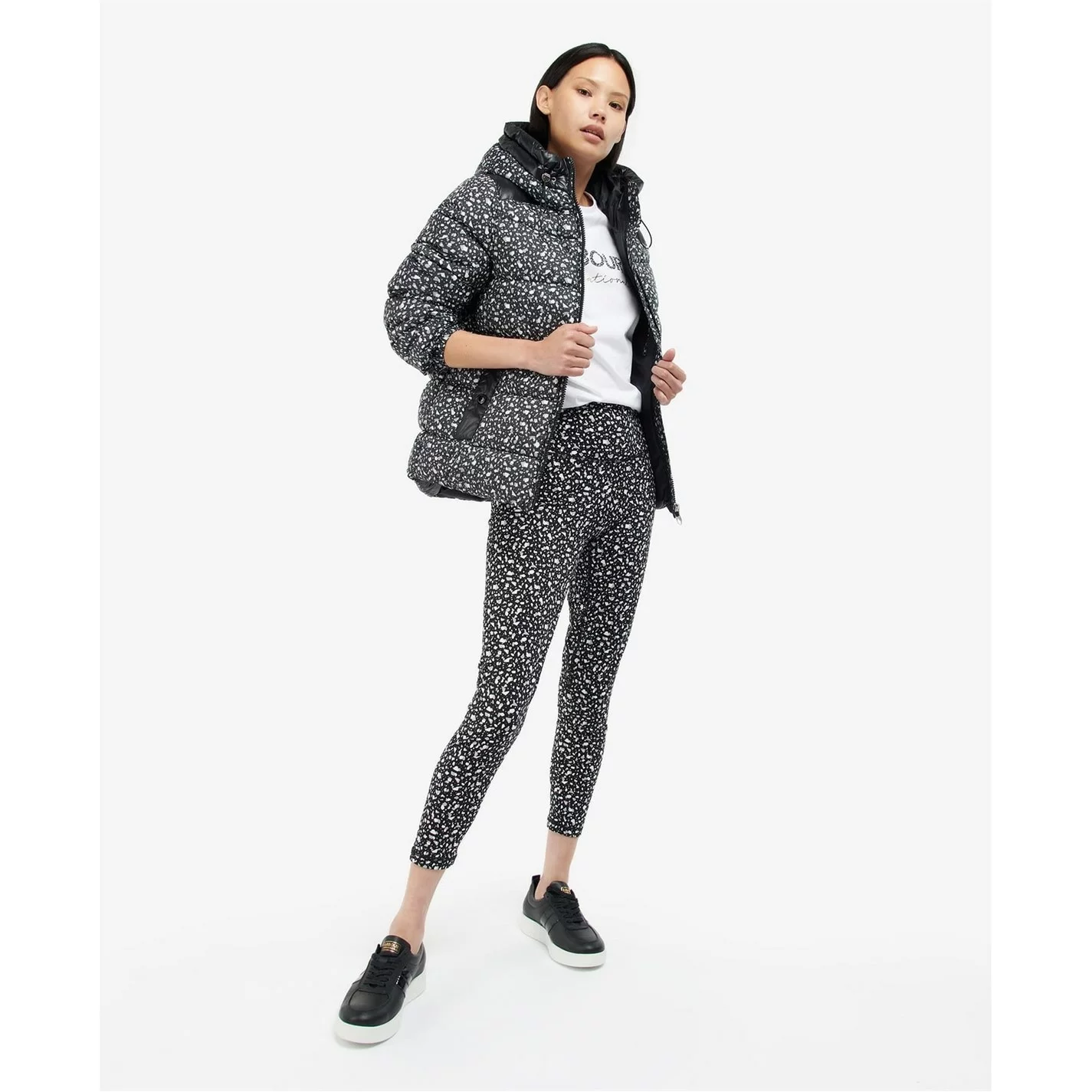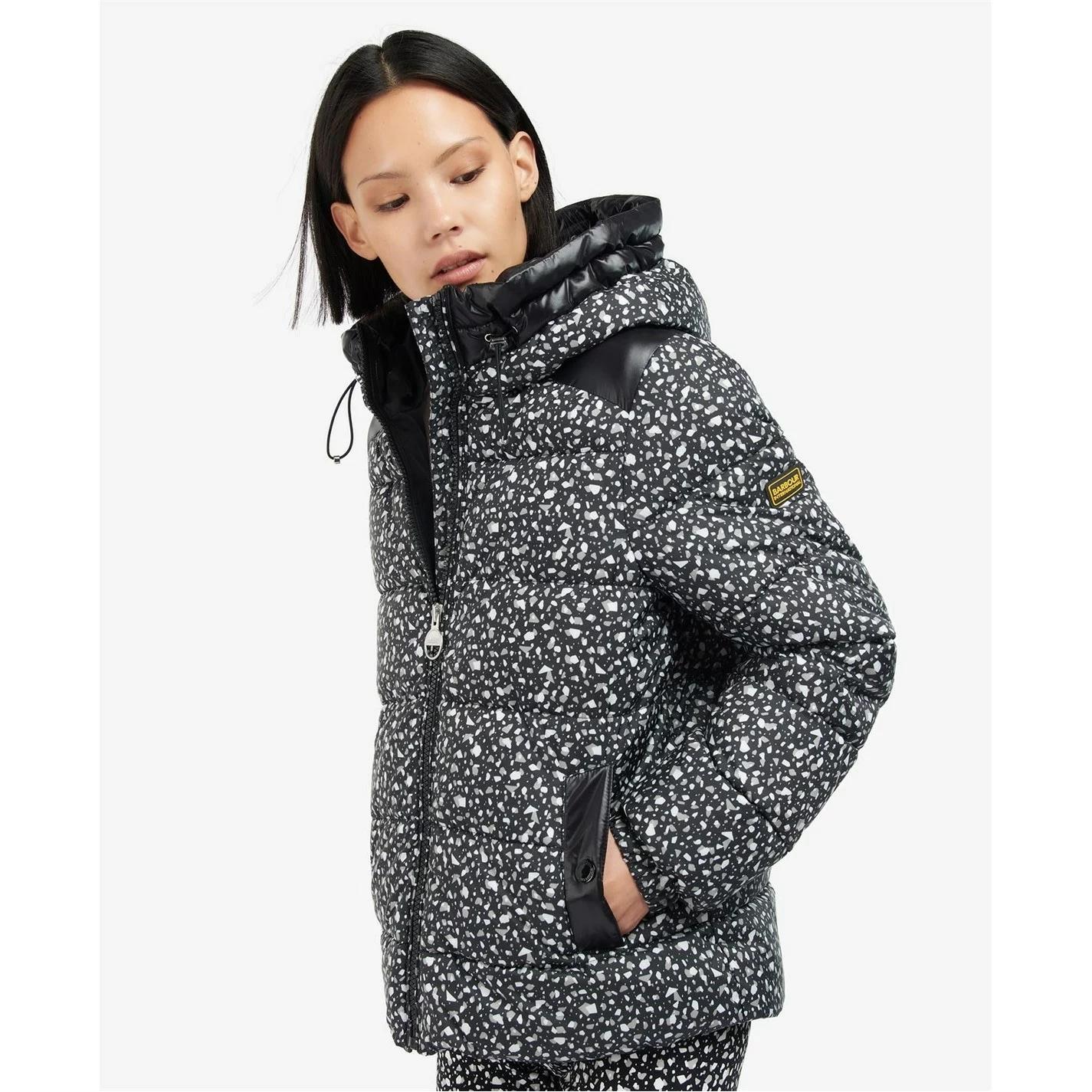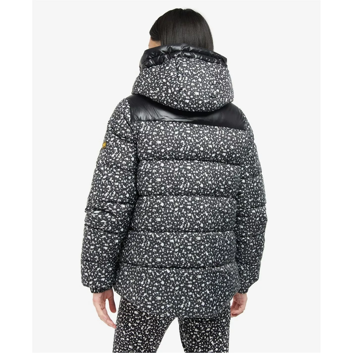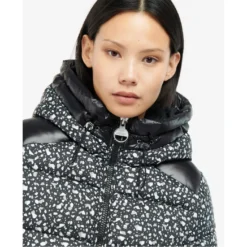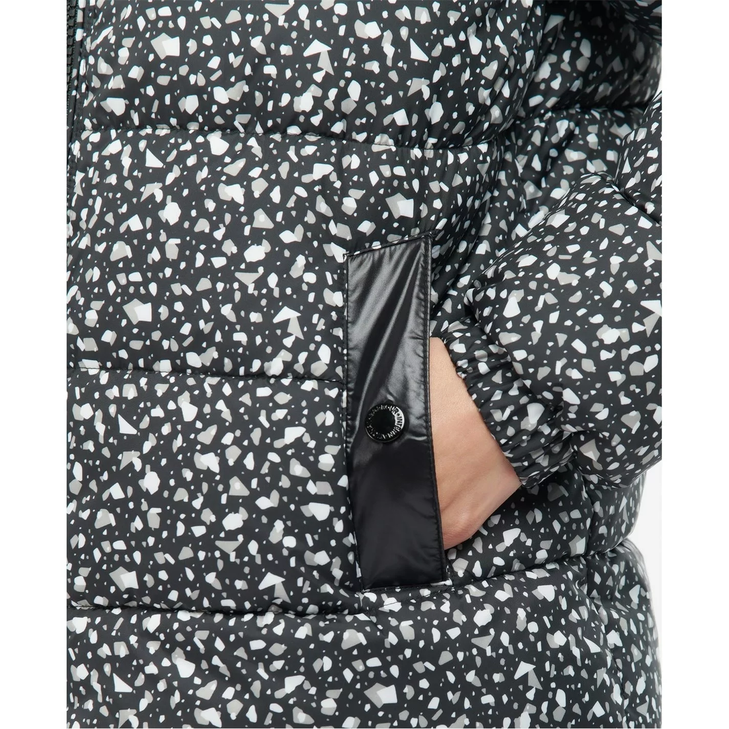 The Barbour Printed Pavilion Quilted Jacket boasts an all over printed design with contrast shine panels to the shoulder and back yoke. Boasting a stud fastening pockets to either side, this jacket boasts a shock cord to the hood for premium wearing.