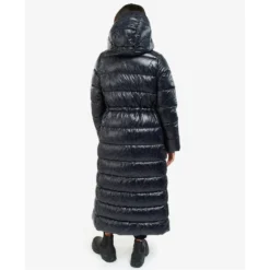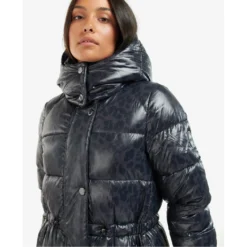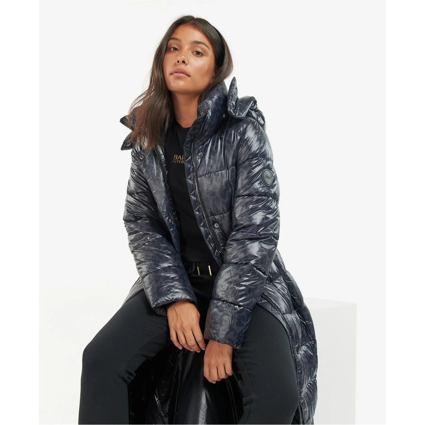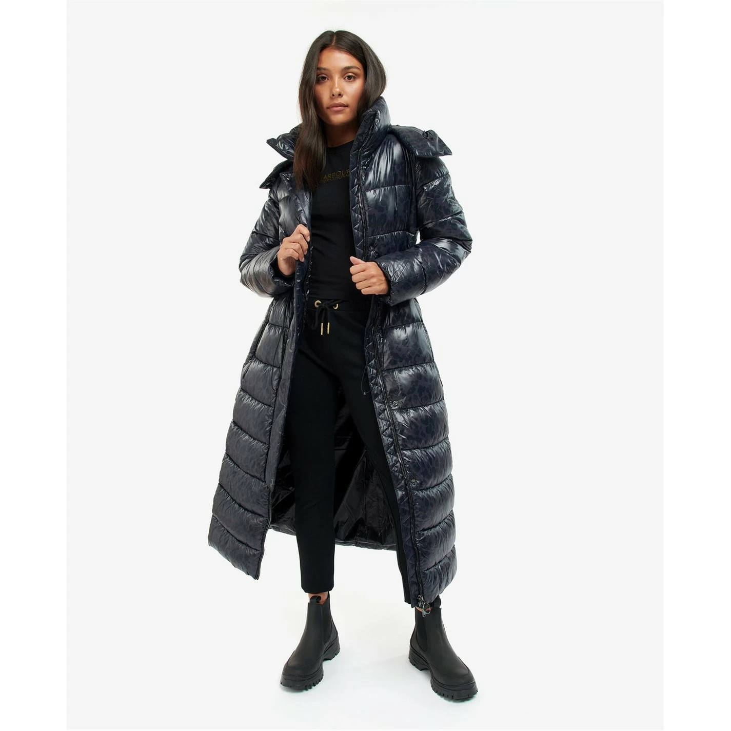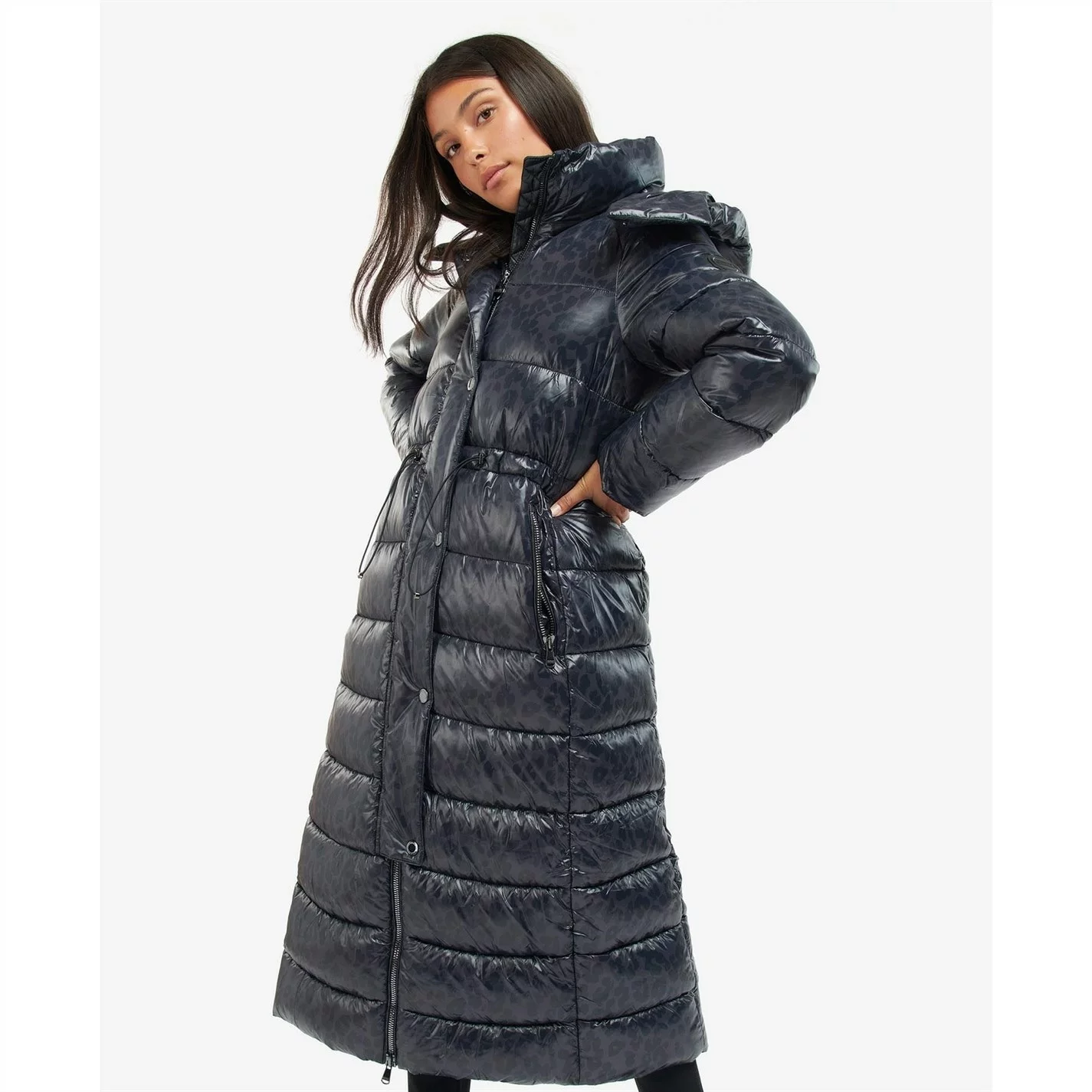 Longline baffle quilt style with detachable stud off hood, waist drawcord and printed outer, featuring inner rib cuffs.