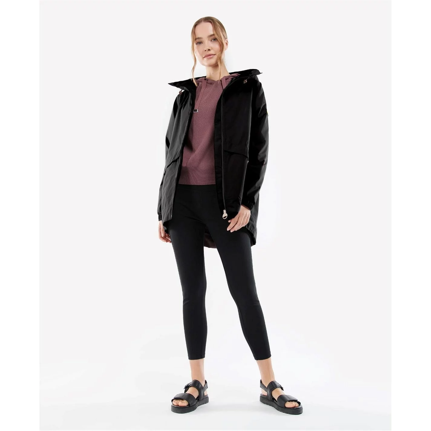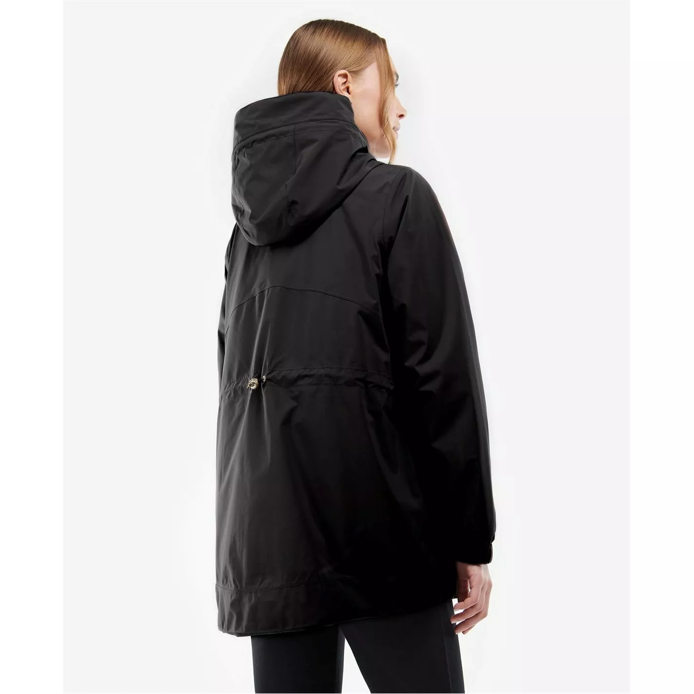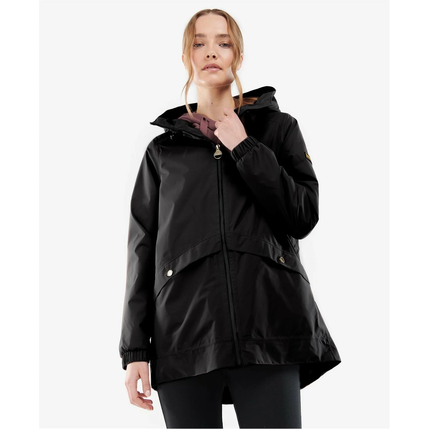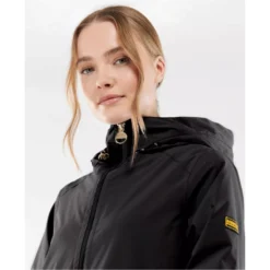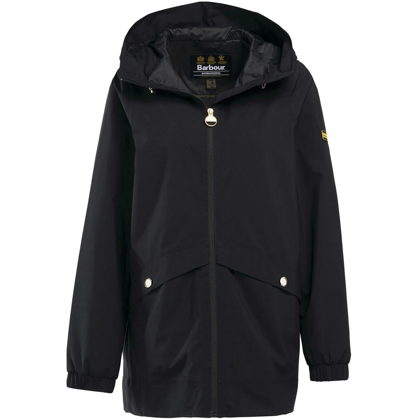 The Barbour International Supra Jacket features a shorter length waterproof design with a fixed hood for unexpected downpours and stud pockets for premium storage space. Styled with elasticated cuffs, this jacket boasts a back waist drawcord and dipped hem for a feminine finish. A Barbour International badge to the left chest effortlessly finishes the garment.