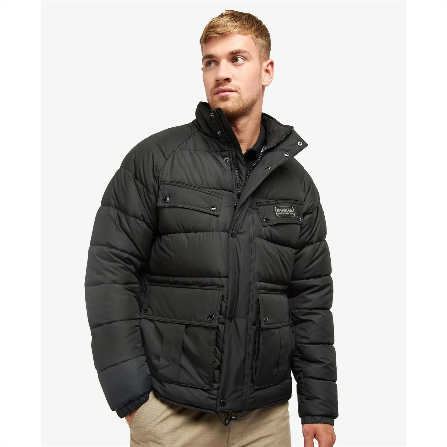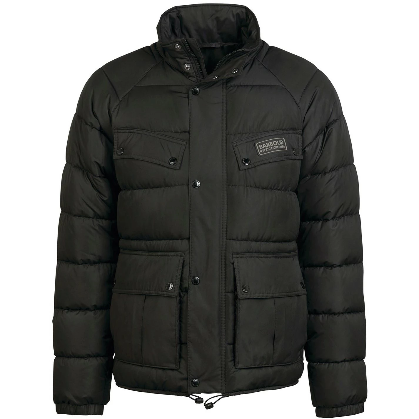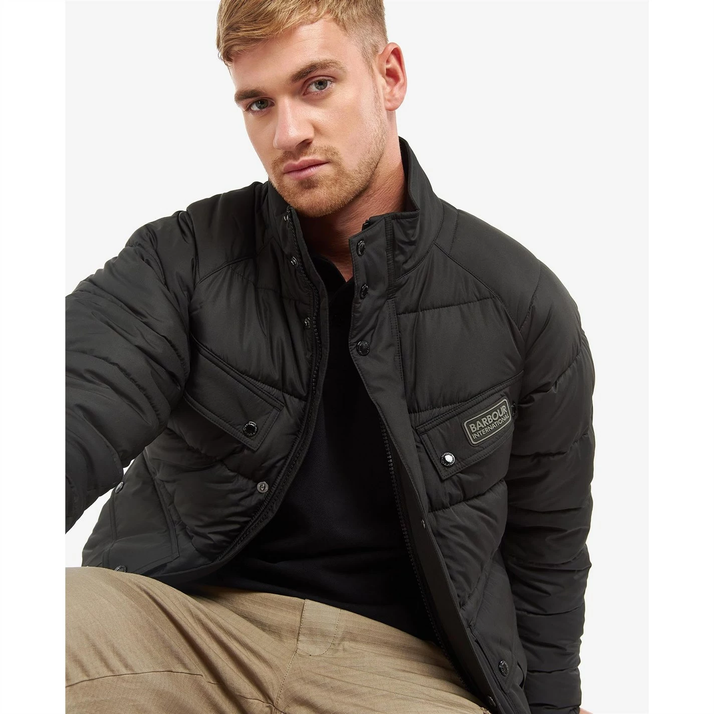 The Barbour International Terrance Quilted Jacket boasts a stand colour and a zip front fastening with a concealed press stud placket. Boasting lower patch pockets with pleated detail, this jacket offers an adjustable shock cord to the hem and is finished with branding to the left pocket flap.