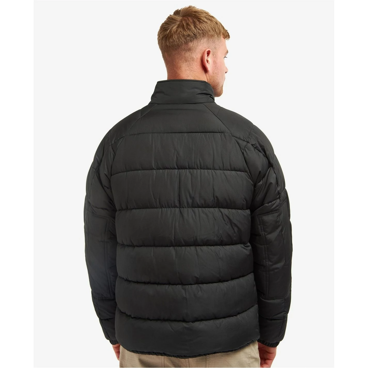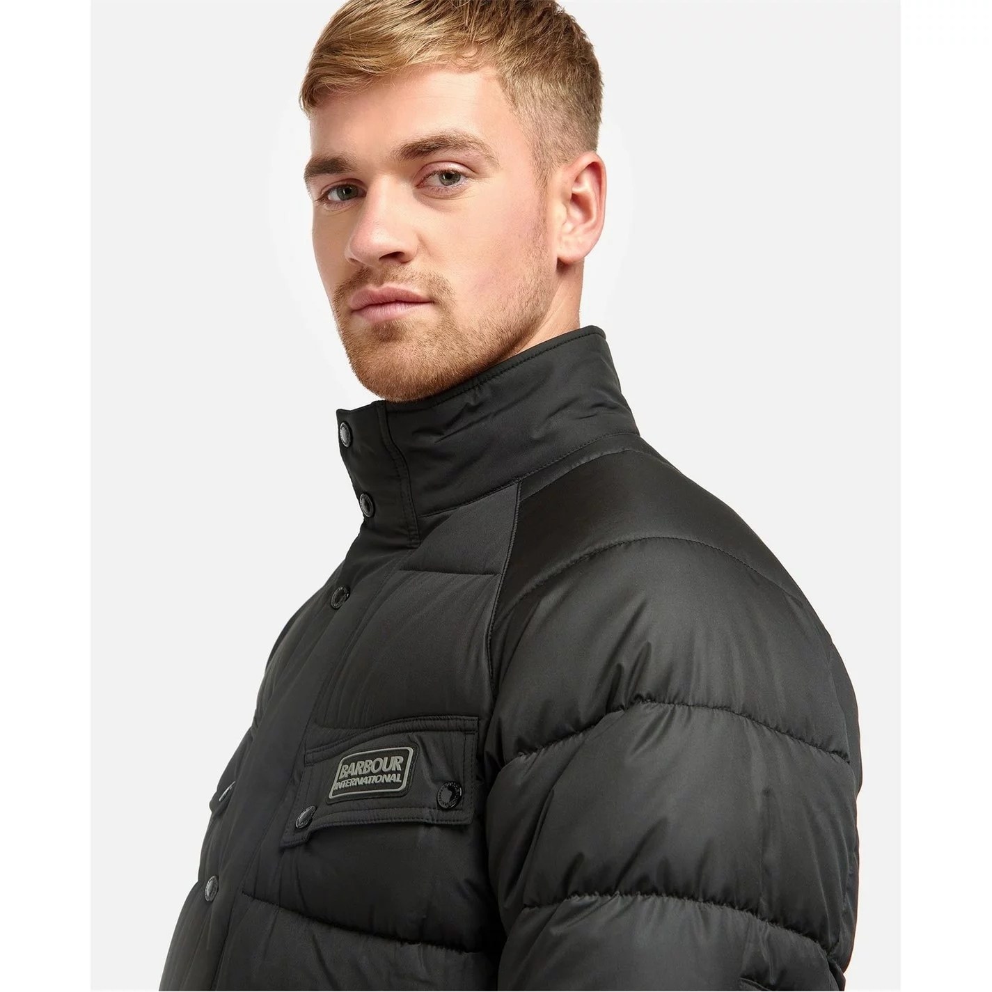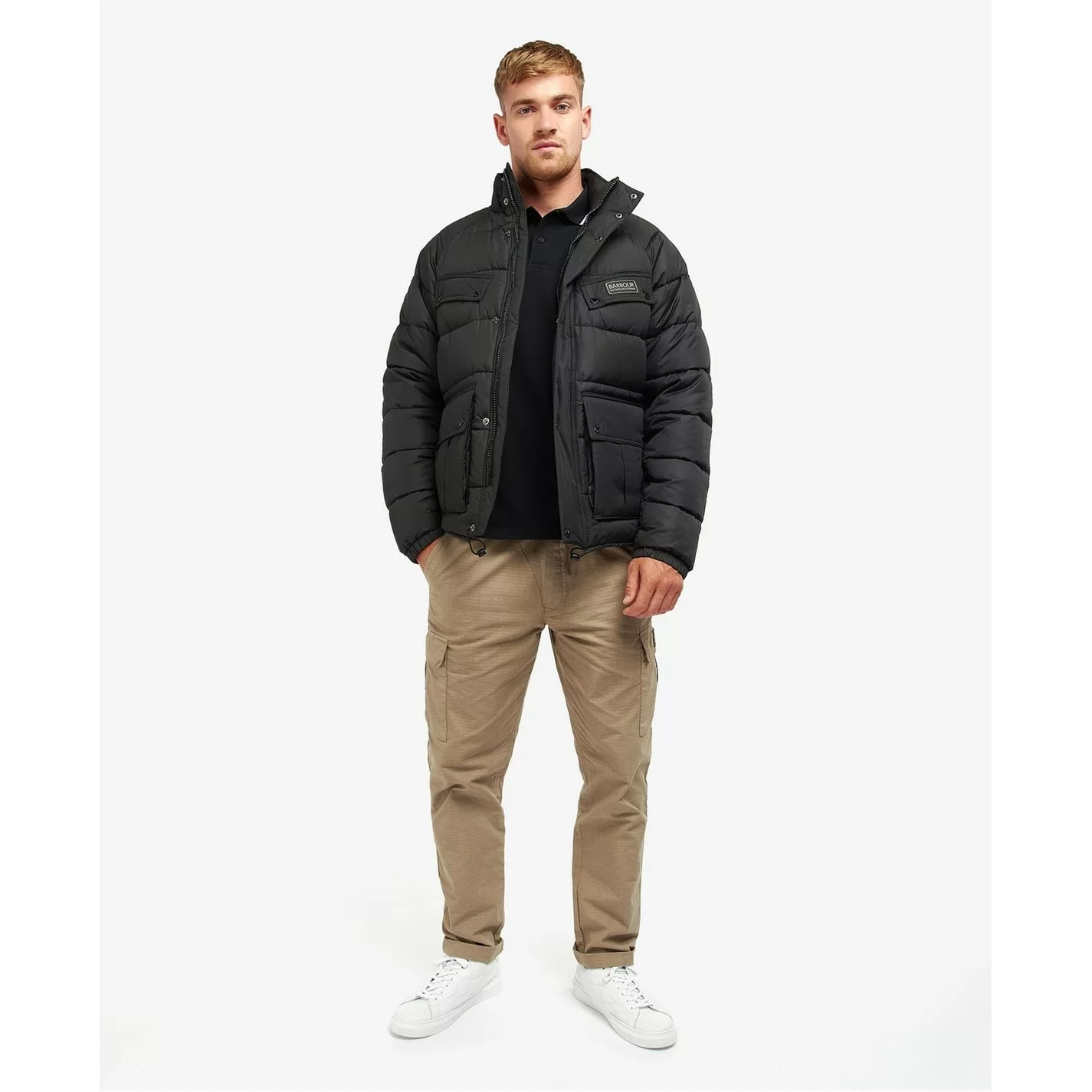 The Barbour International Terrance Quilted Jacket boasts a stand colour and a zip front fastening with a concealed press stud placket. Boasting lower patch pockets with pleated detail, this jacket offers an adjustable shock cord to the hem and is finished with branding to the left pocket flap.