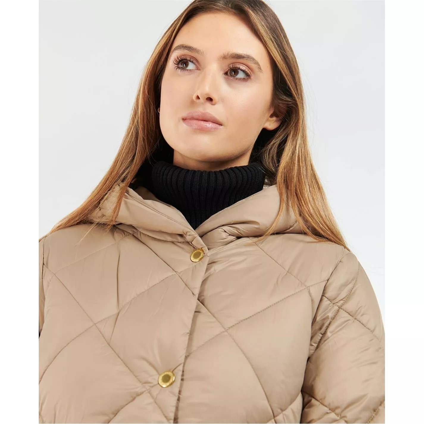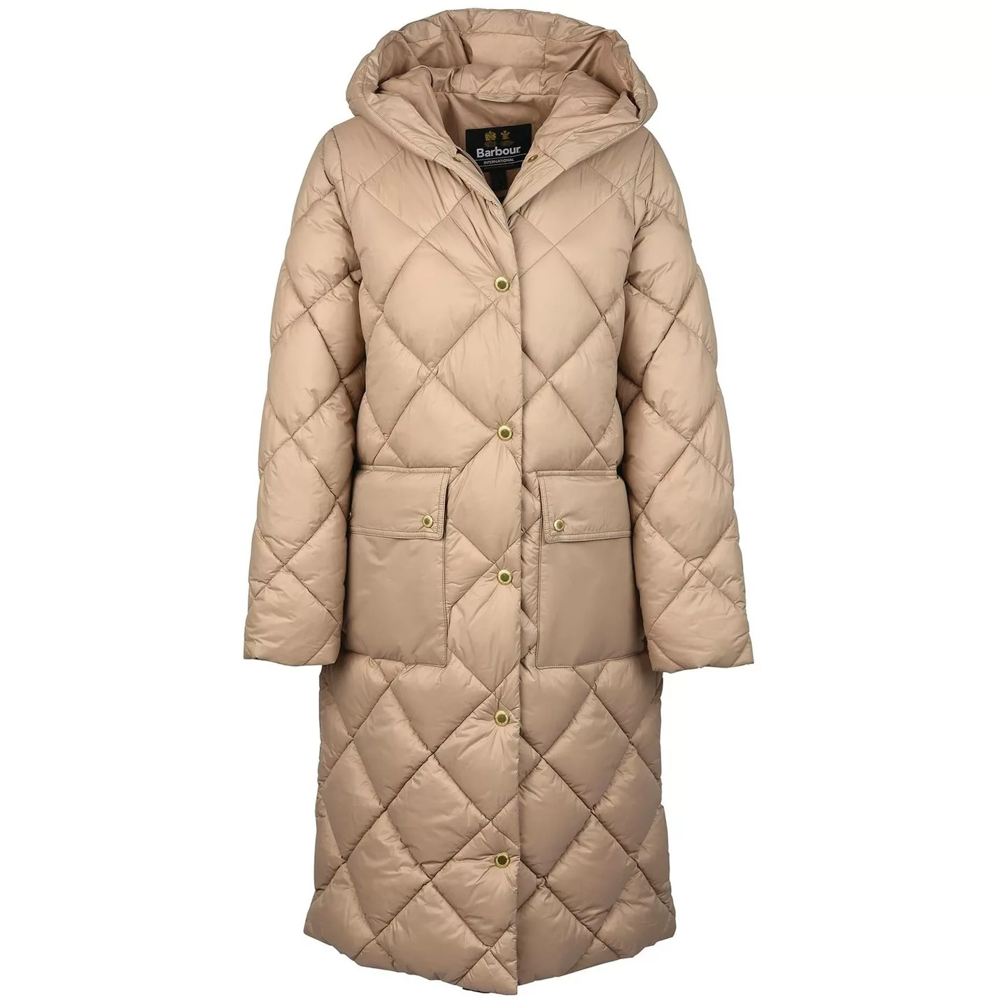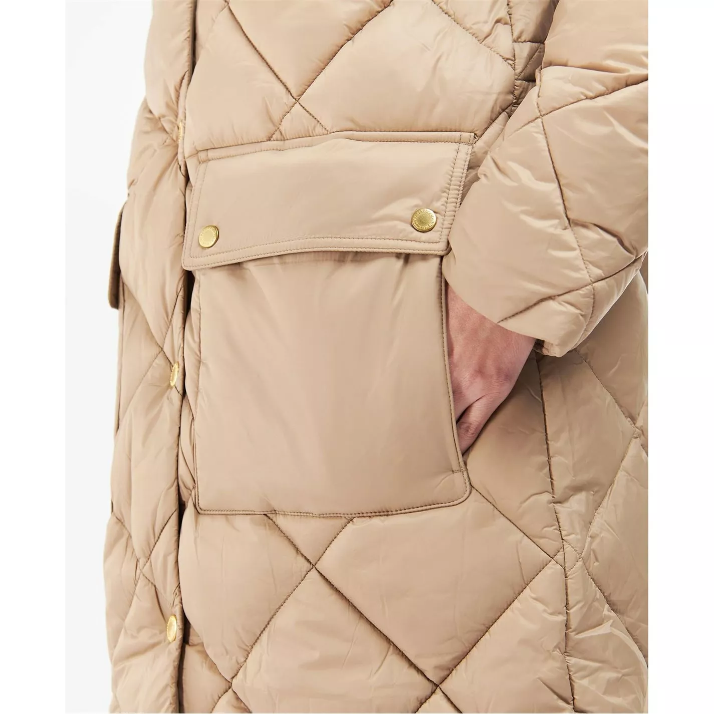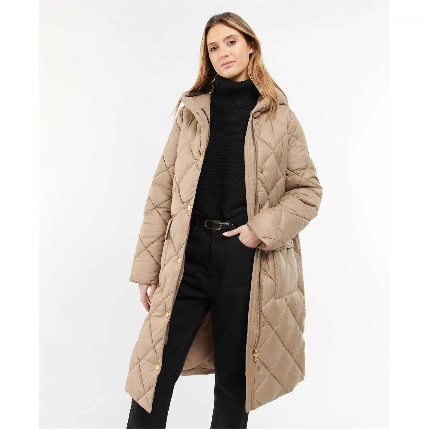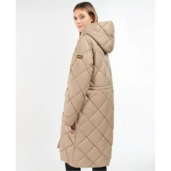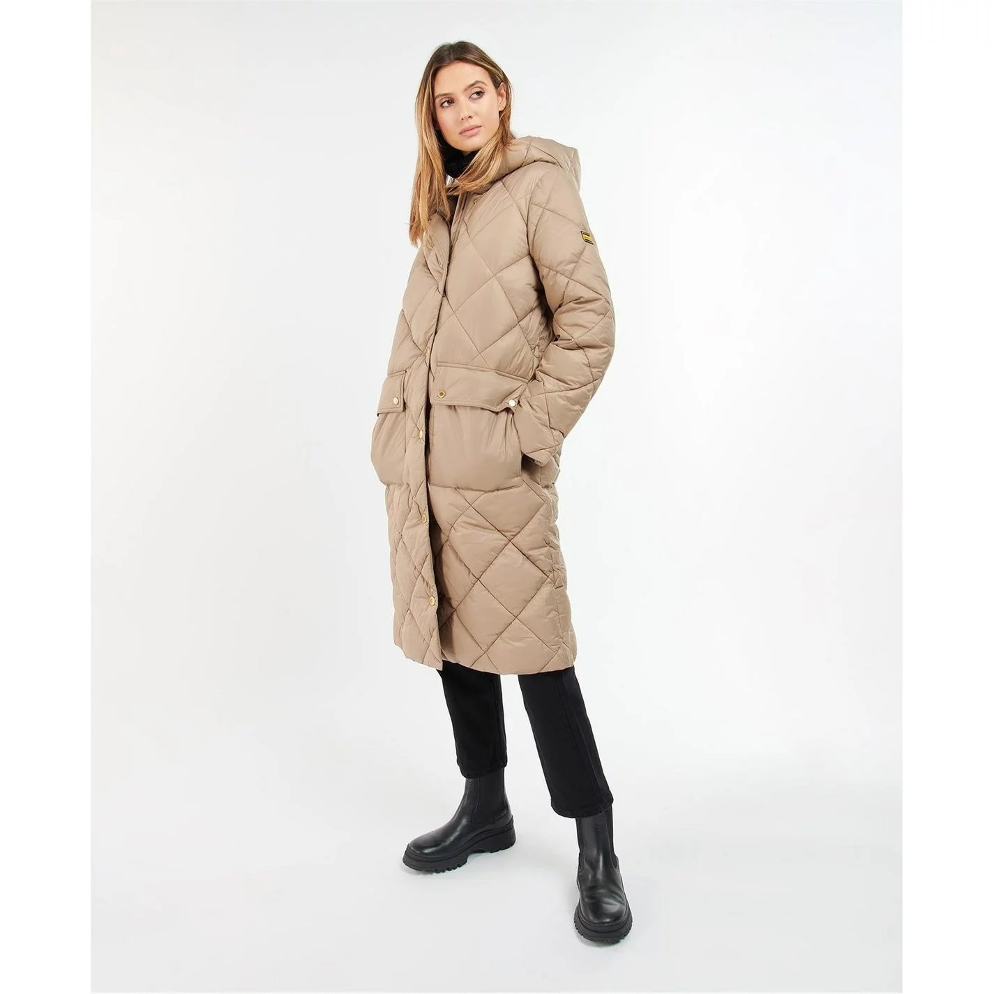 The Barbour International Volante Quilted Jacket boasts an oversized design with a long line box quilted design which features contrast unquilted pockets. Boasting an elasticated belt to the waist for a feminine silhouette, this jacket offers a straight baffle quilting to the front and chevron quilting to the back. Branding to the sleeve effortlessly finishes the garment.