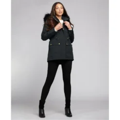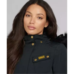 A four pocket, funnel neck style the Barbour International Wanneroo jacket boasts a detachable hood and fur. This style features a dipped back hem and drawcord to the waist for a flattering slim fit. Perfect for styling with your weekend favourites, this jacket adds waterproof protection without foregoing style. A branding on the left pocket finishes the garment.