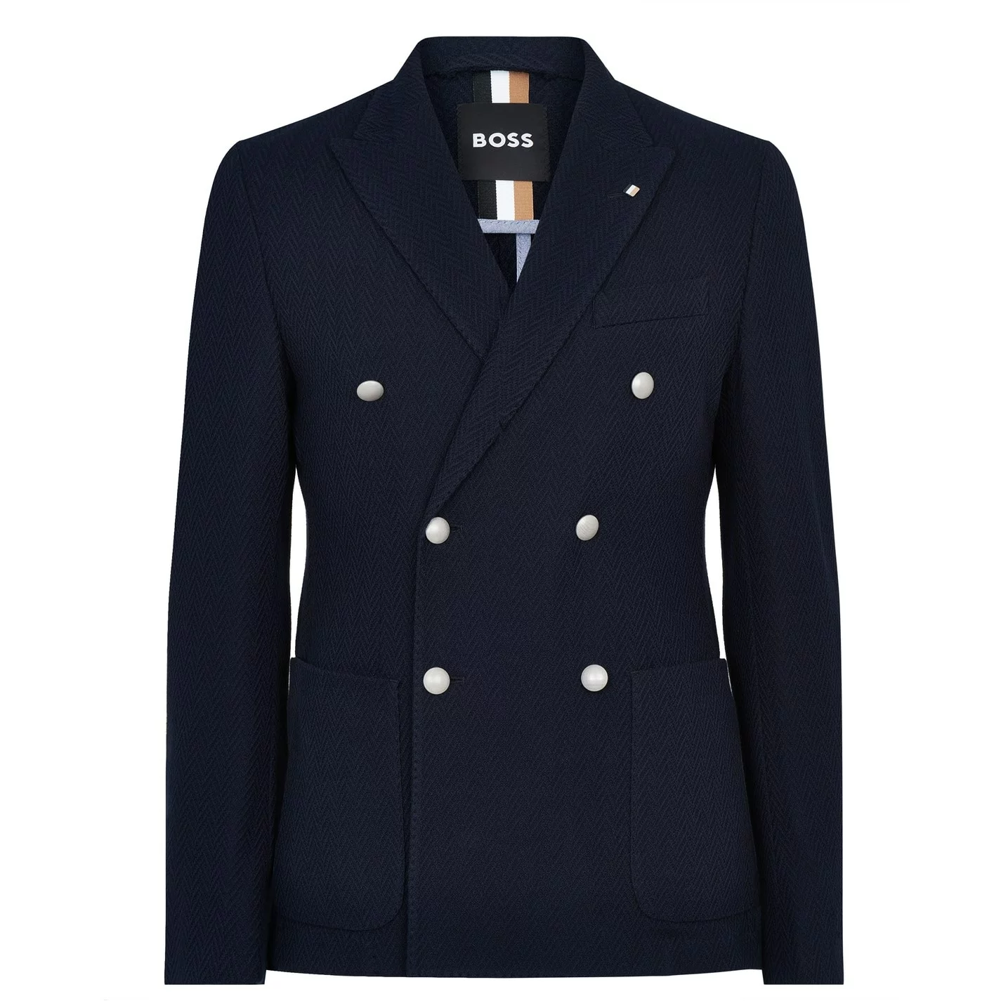 Refresh your collection with this Hanry Jacket from boss. Constructed in a slim fit with a notch lapel collar and double breasted button closure for an easy wear, it features long sleeves with button cuffs and three pockets for a classic look. Decorated in a solid colouring throughout for understated designer completion.