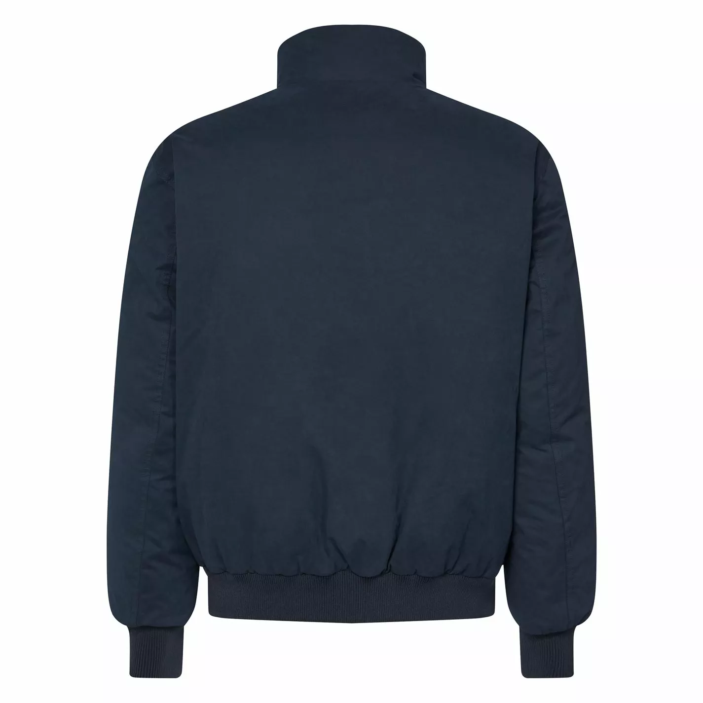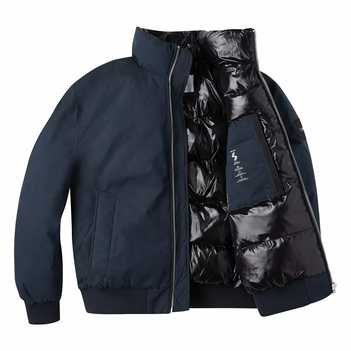This bomber jacket has a stand up neck with padded shiny interior for extra warmth.