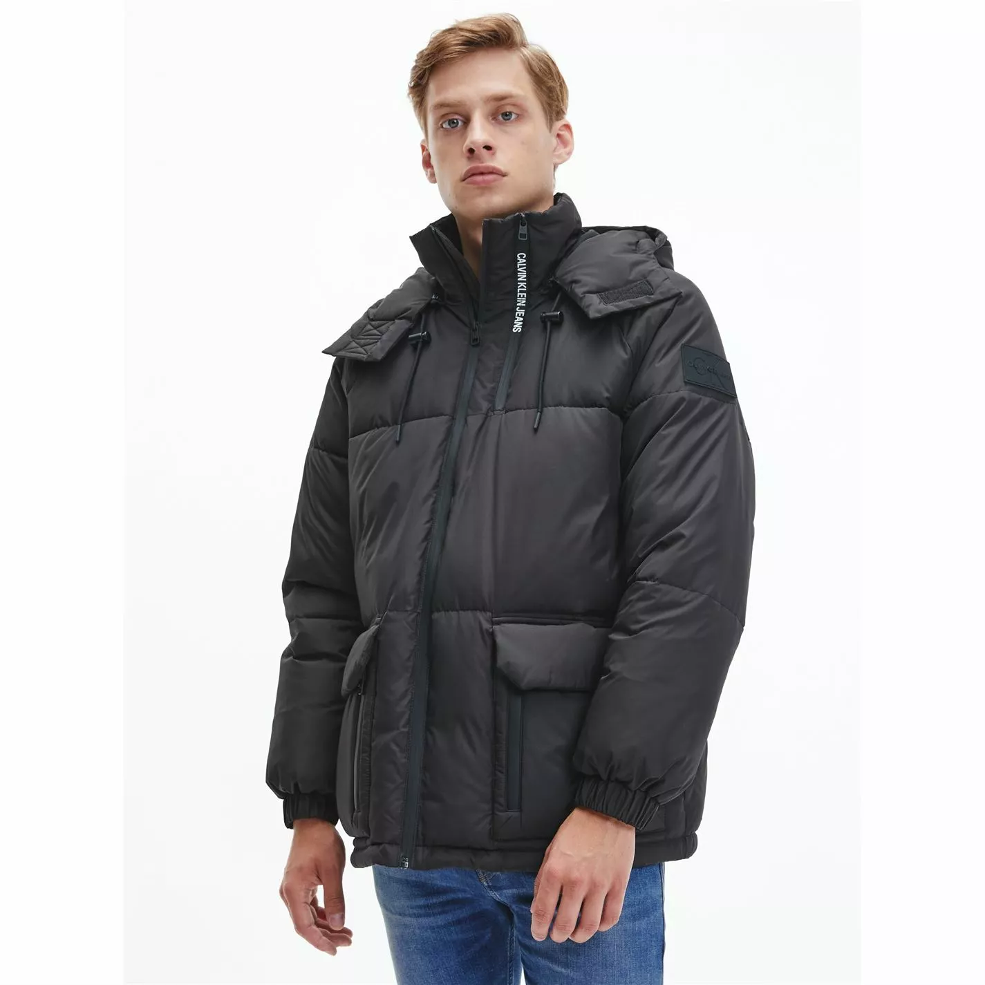 Enhance your collection with this Calvin Klein Jeans Block Hooded Jacket. Constructed with full zip fastening and long sleeves for a secure fit, it features a drawstring adjustable hood and multiple pockets for a classic look. This jacket is designed with a signature logo and is complete with Calvin Klein Jeans branding.