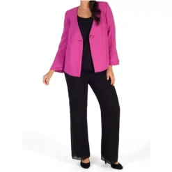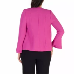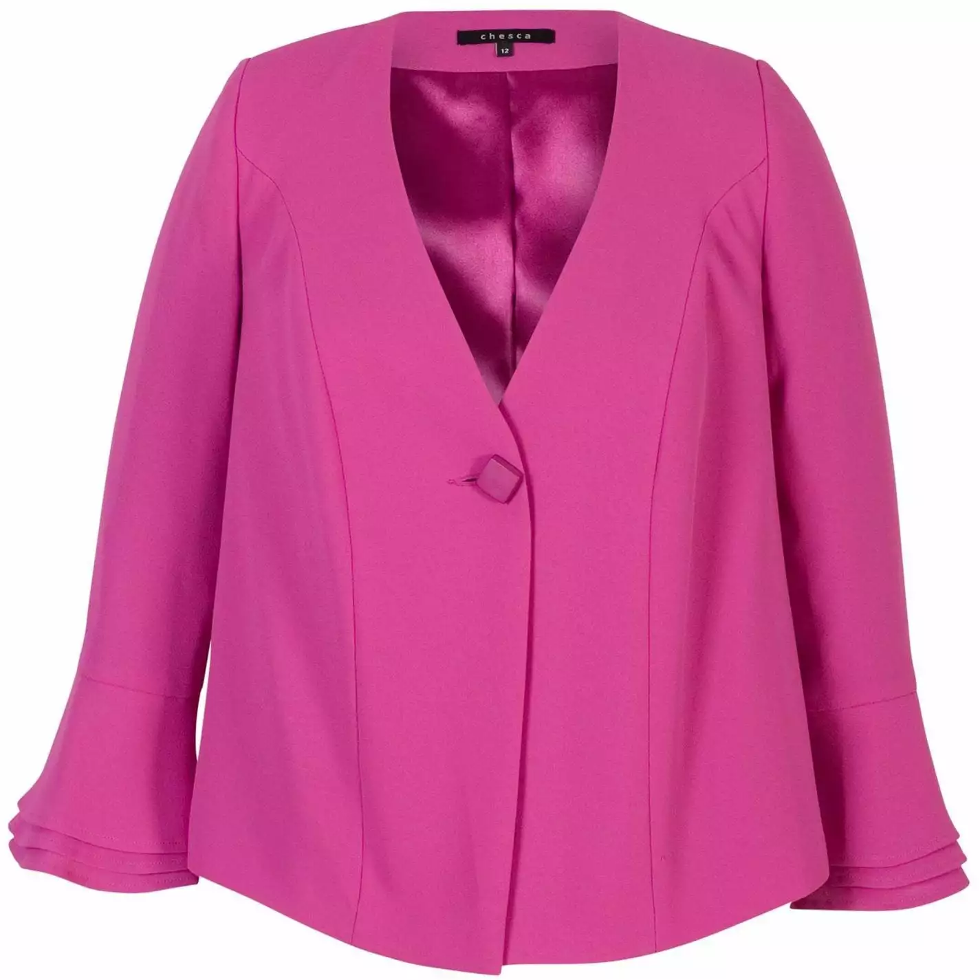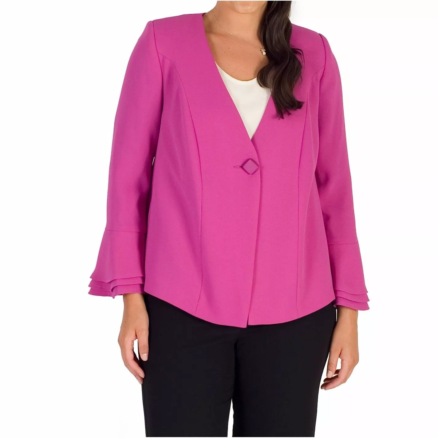 Magenta crepe softly tailored jacket with single button fastening. Multi-tiered fluted sleeves adds a modern twist to this wardrobe essential. Jacket also available in blonde and black. Jacket length 65cm from shoulder neck point to hem.