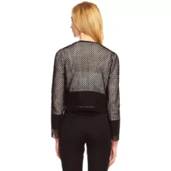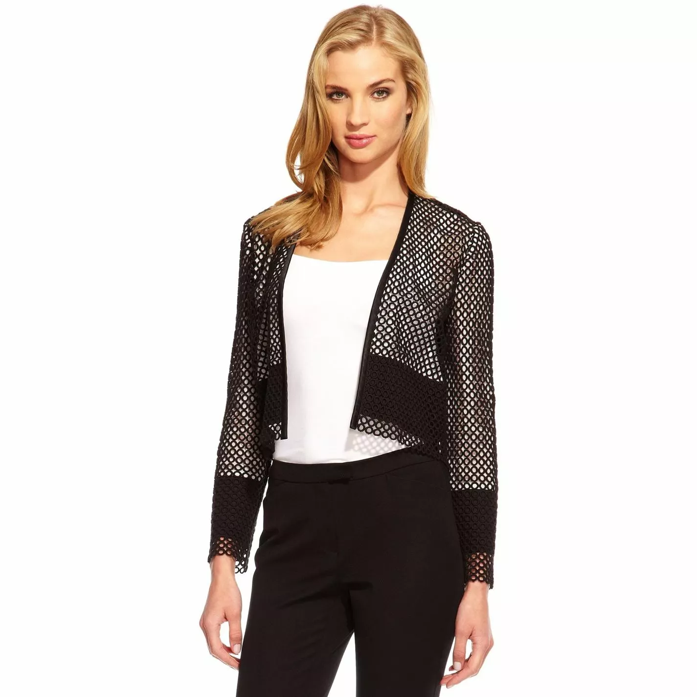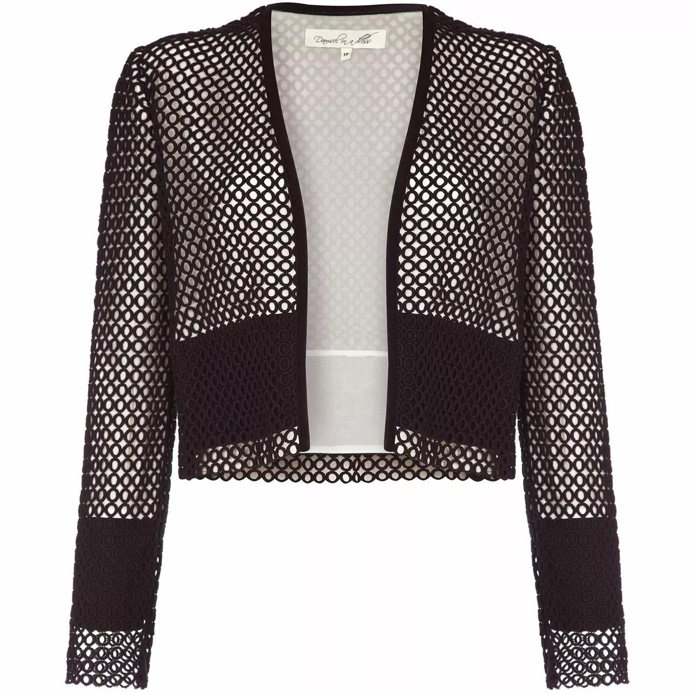 Be the cynosure of all eyes for a dine-out by layering in this jacket by Damsel in a dress. Fabricated from cotton fabric, this long-sleeved piece features an open front for maximum ease. Bedecked in an eyelet overlay, a black trim at the hem and is finished with the signature brand labelling to lend an instant appeal. This jacket pairs well with a halter top and brown trousers to achieve an eye-catching ensemble.