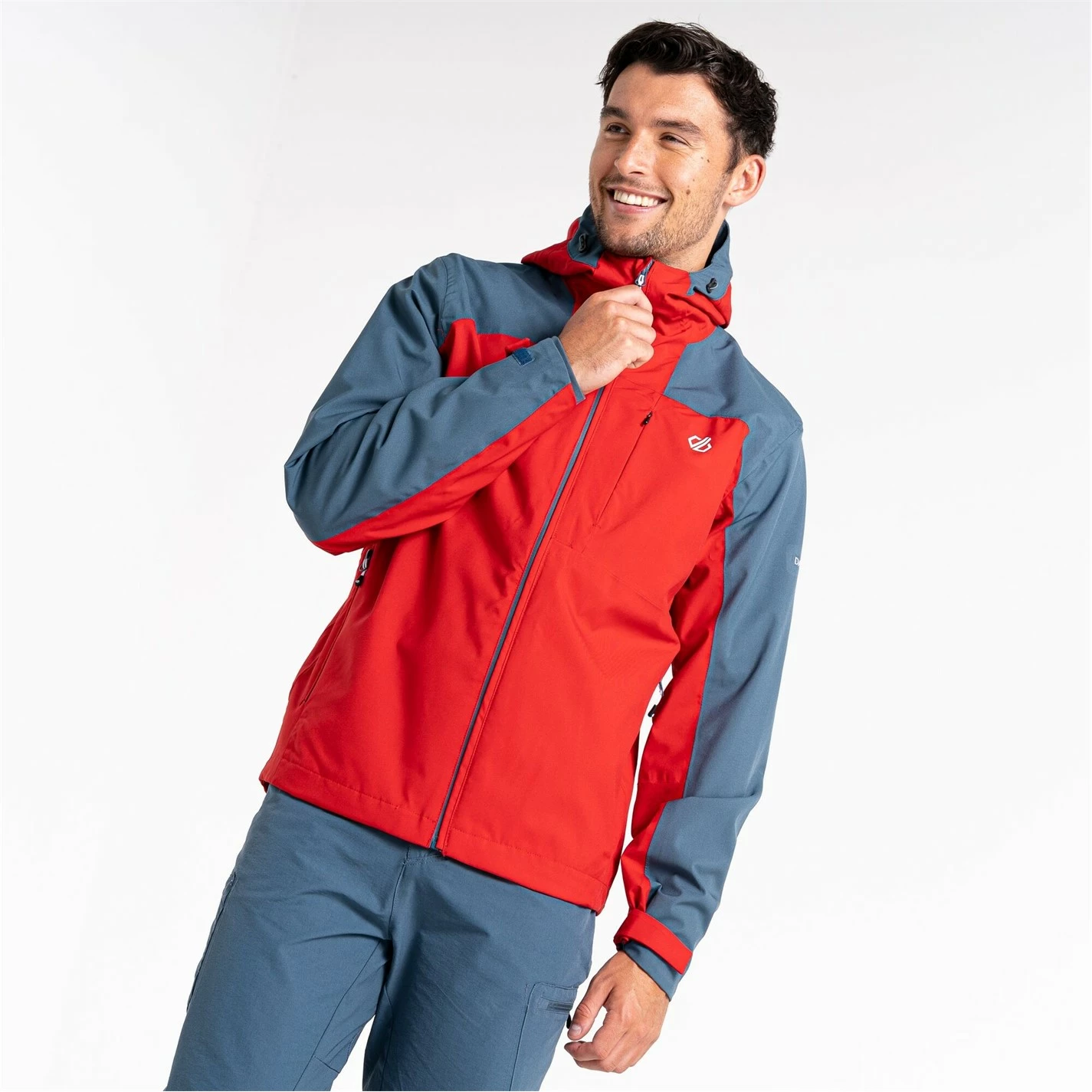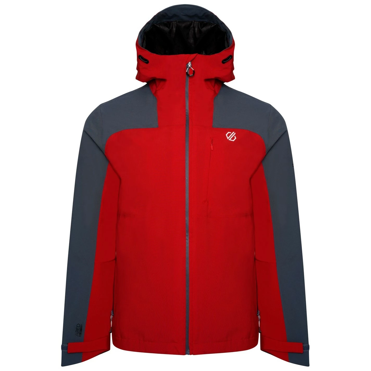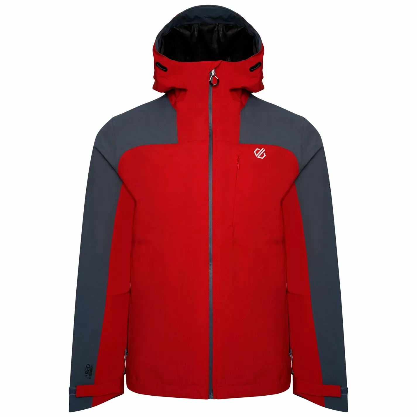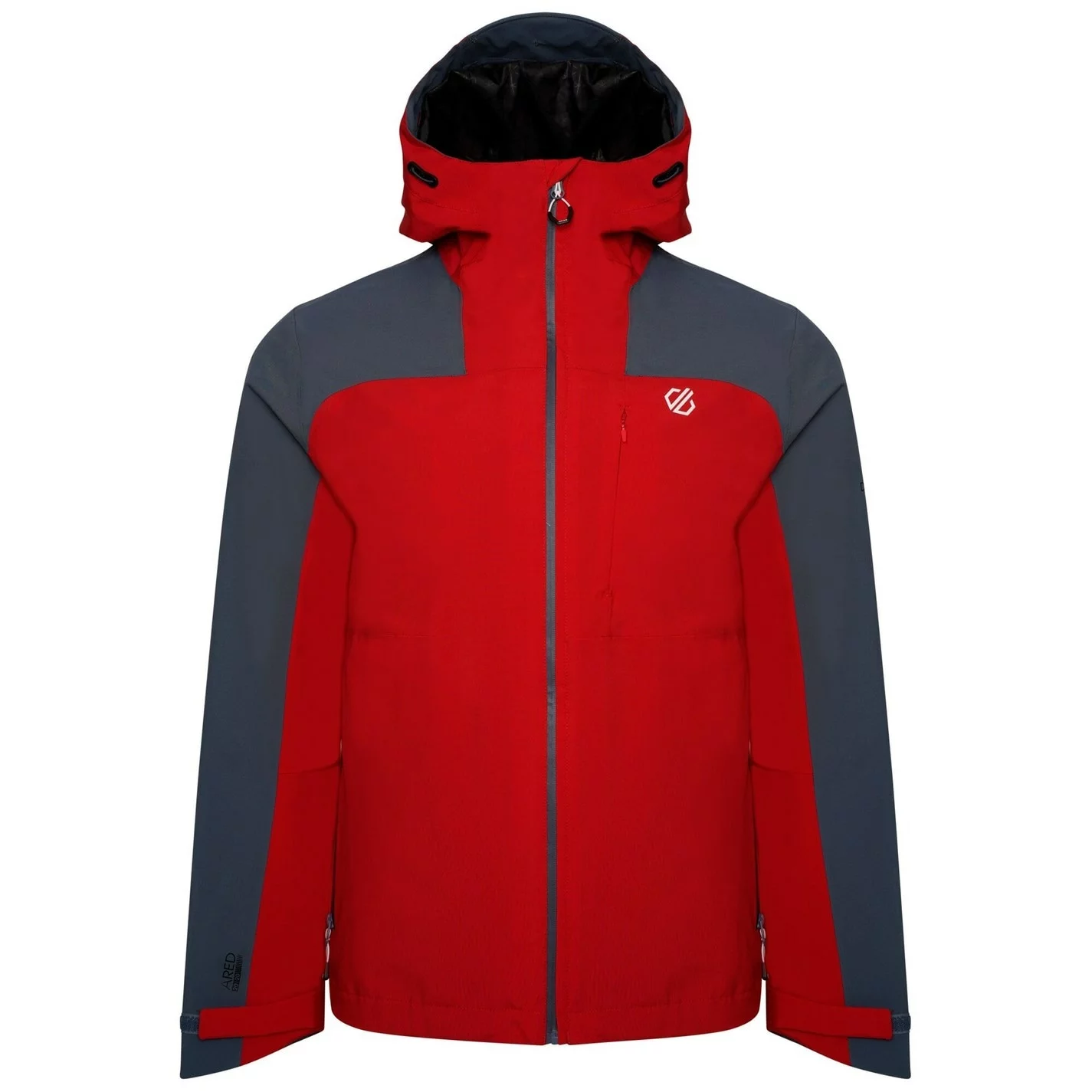 The Dare 2b Diluent Waterproof Jacket. Consciously Made with recycled ARED 20/30 stretch fabric for ultimate breathability and waterproof protection. Durable water repellent finish and taped seams to keep you dry. Featuring discreet chest zip pocket and lower zip pockets to keep essentials safe. Wired hood and adjustable hem to keep the rain out. This product recycled 17 plastic bottles.