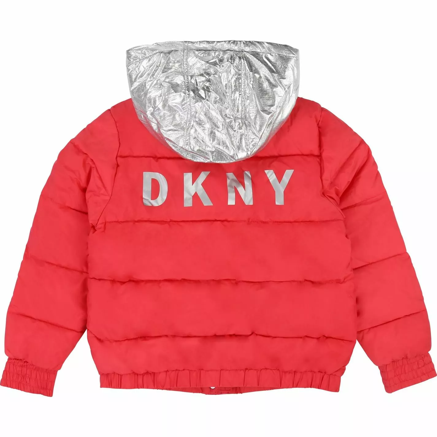 Wadded nylon puffer jacket, hood removable by zipper, zipper and snaps fastener, 2 front pockets with snaps, nylon lining with DKNY NEVER SLEEPS all over, printed DKNY logo on the back, DKNY silicone tab on the front.