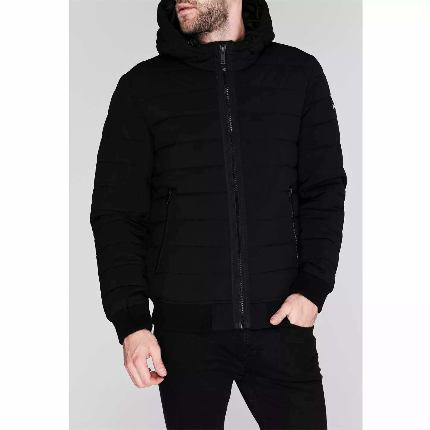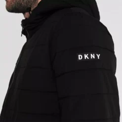 Elevate your collection with this DKNY Quilted Bomber Jacket. Crafted with full zip fastening and long sleeves, it features a hood and 2 pockets for a classic look. This jacket is designed with a signature logo and is complete with DKNY branding.