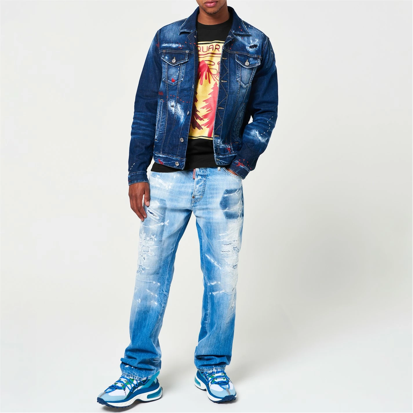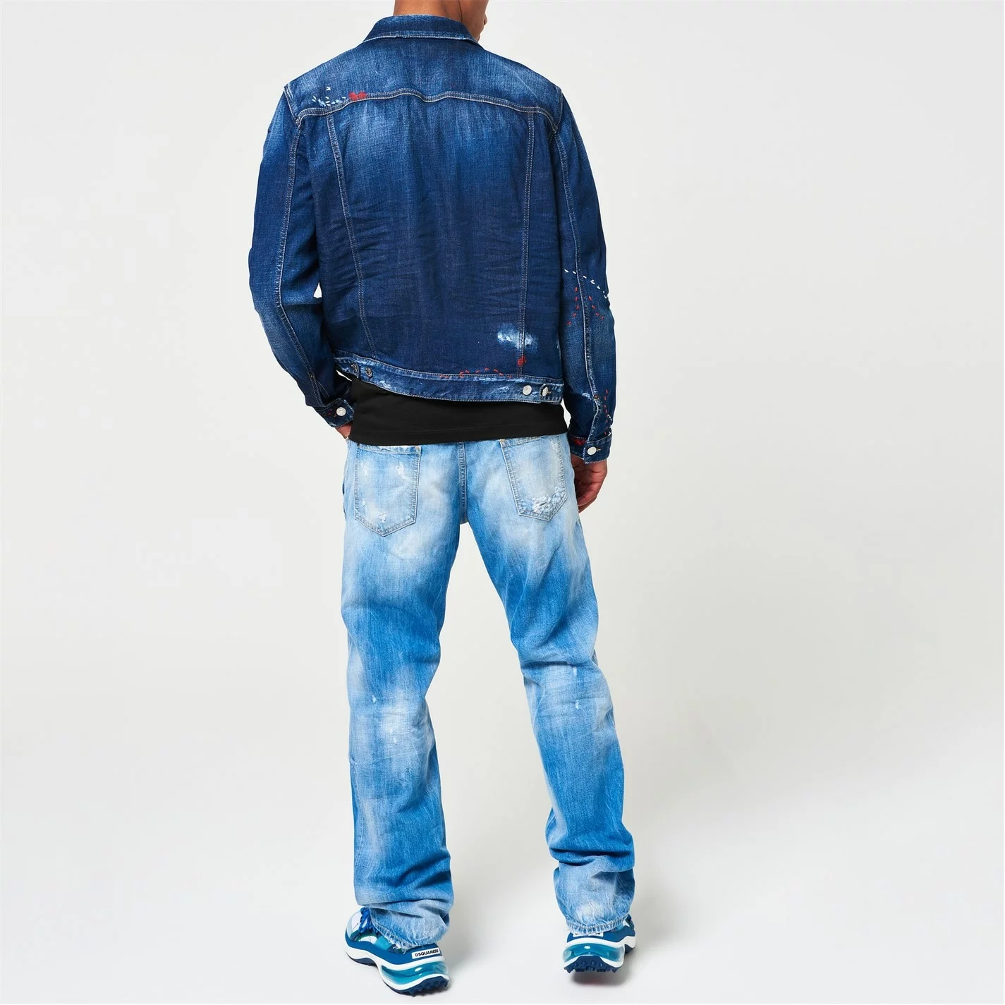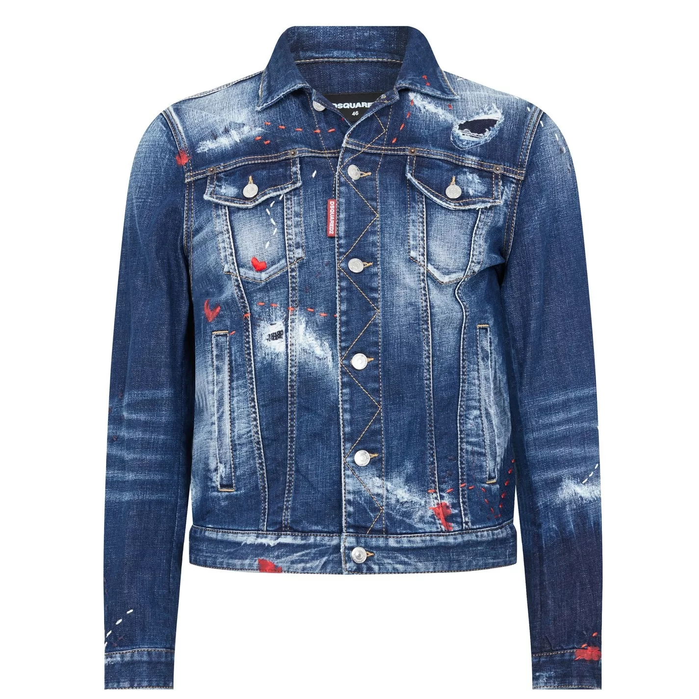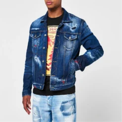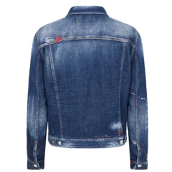 Elevate your collection with this Dan Jean Jacket from dsquared2. Crafted from a premium cotton blend for a comfortable wear, it features a fold over collar, central button closure, long sleeves with button cuffs and four pockets for a classic look. Decorated in a darker denim wash with distressed detailing for an edgy finish.