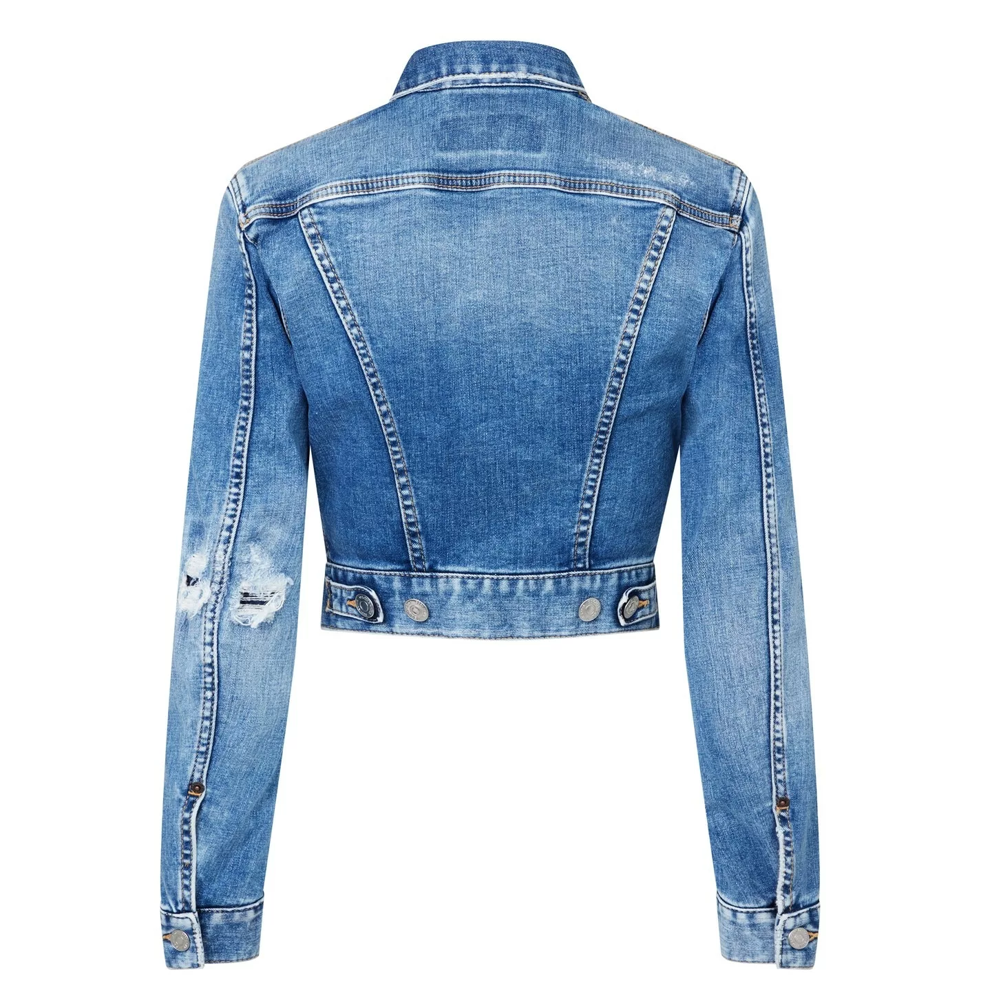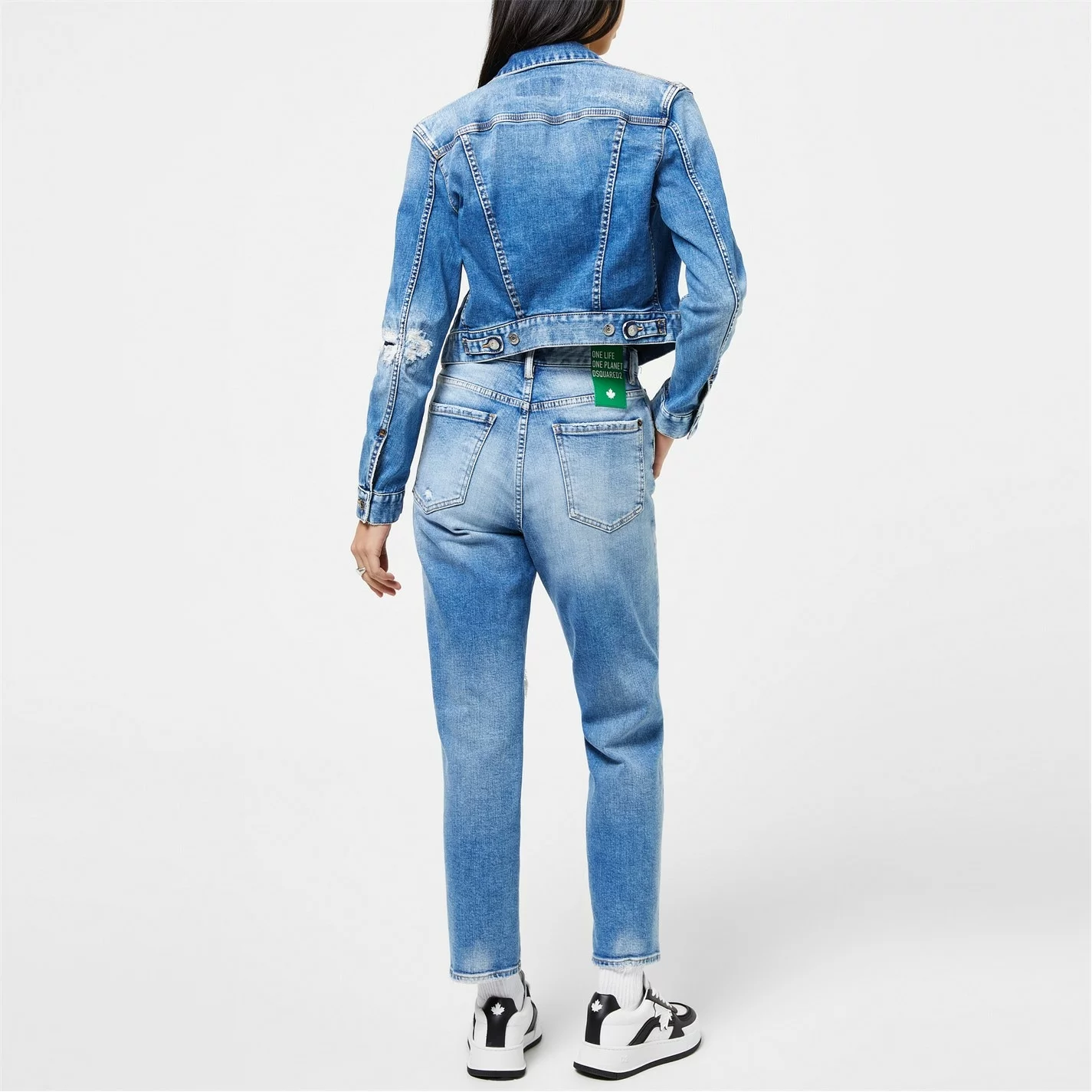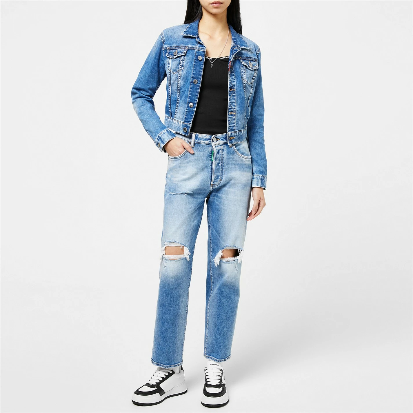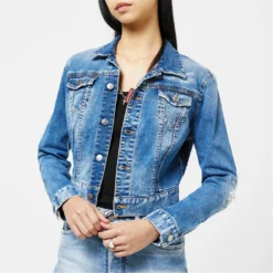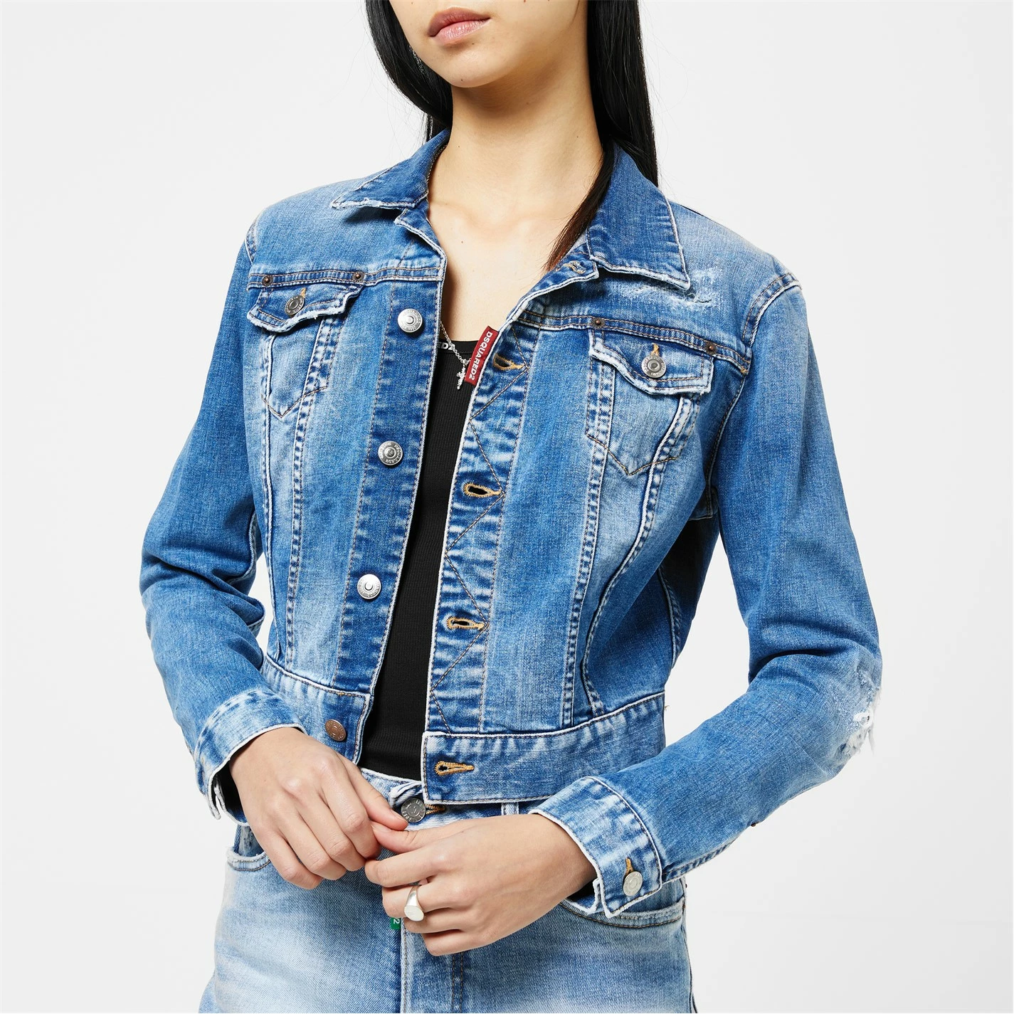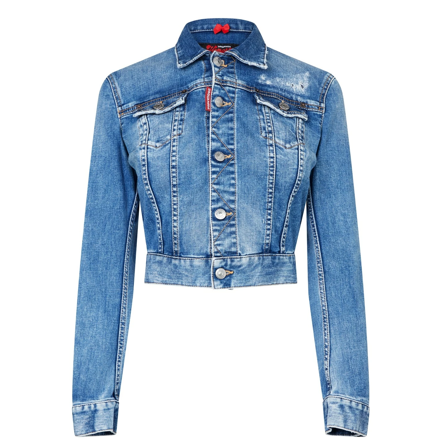 Refresh your collection with the Honey Twiggy Jean Jacket from dsquared2. Designed with a point collar and buttoned cuffs to the sleeves, this jacket is cut to a slim fit and cropped length to create a contemporary denim style. Made from a stretch blend cotton with twin buttoned pockets to the chest, this jacket is finished in a medium wash with light distressed detailing throughout.