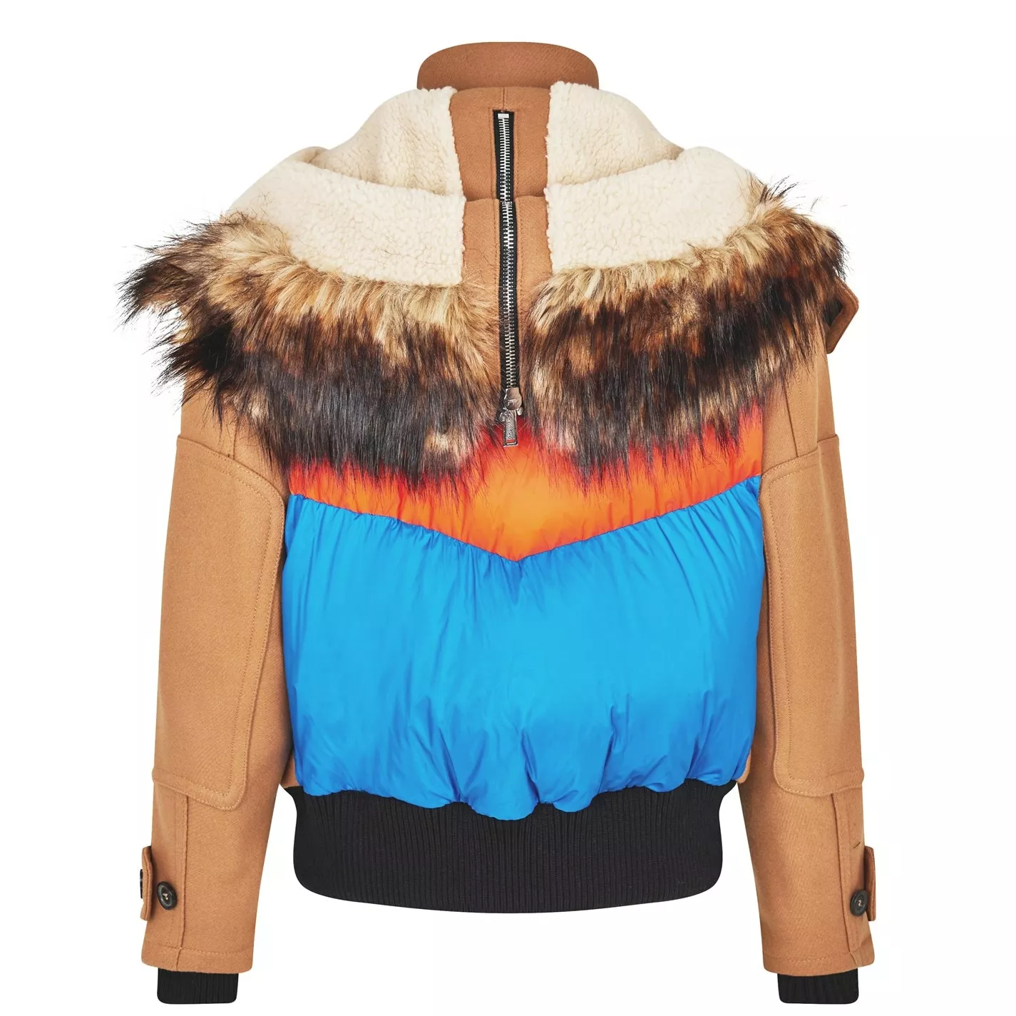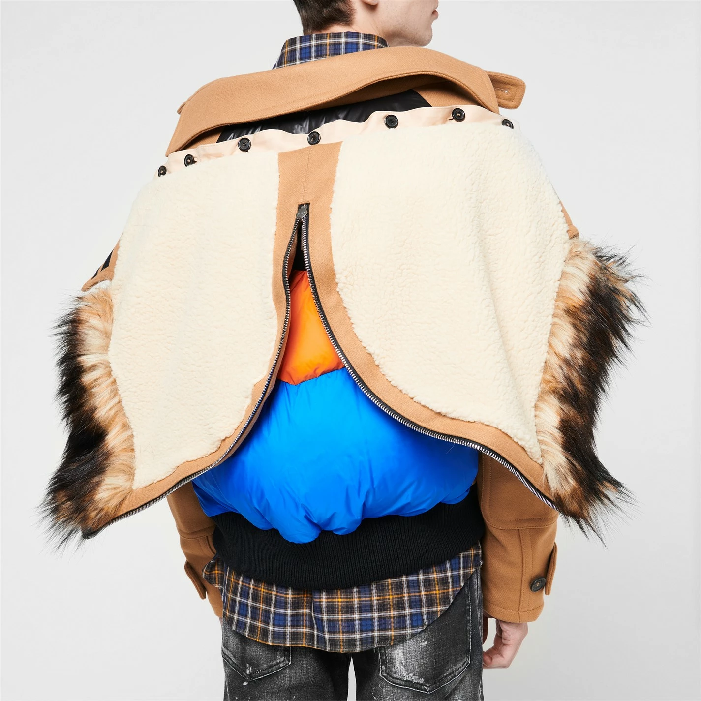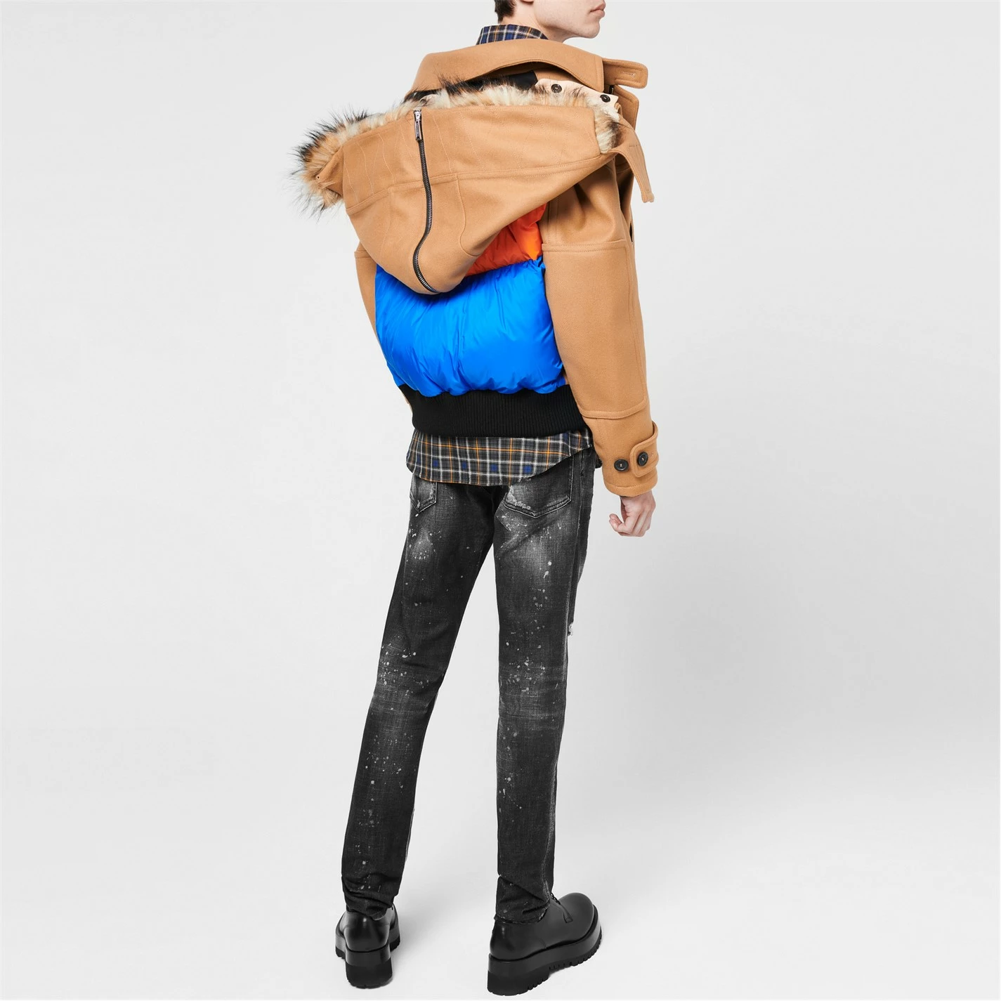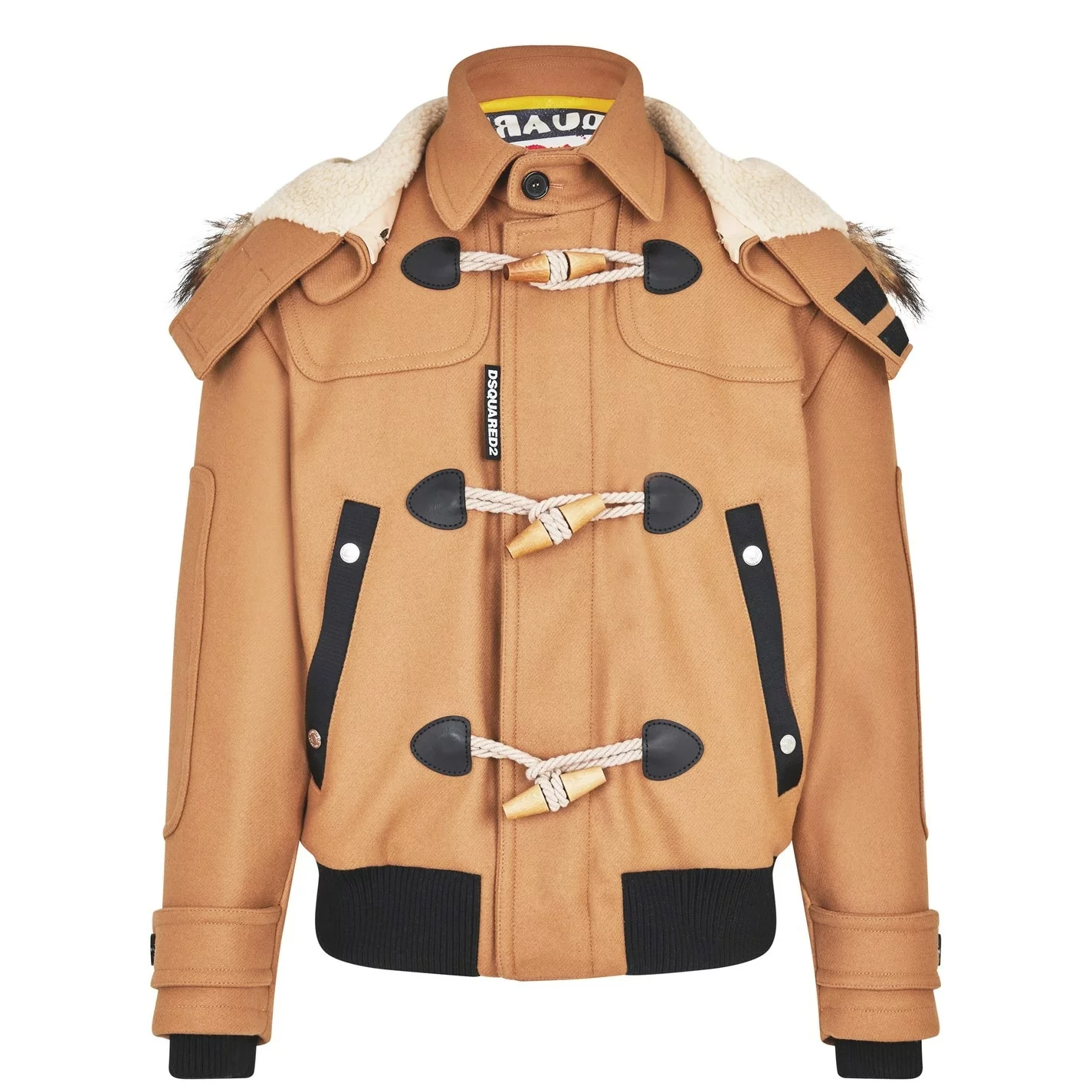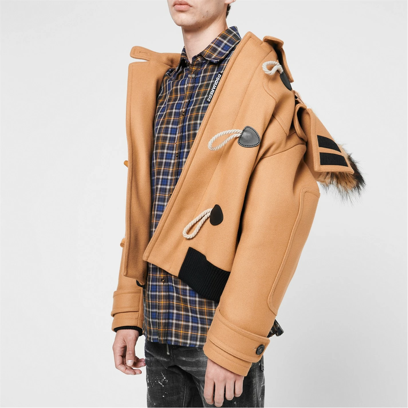 Add to your outerwear with the Montgomery Jacket from dsqaured2. Made from virgin wool with a colour blocked nylon back to add contrast, this jacket is designed with a removable faux fur trimmed hood to customise your look. With a two way zipped closure and buttoned cuffs at the sleeves, this jacket is characterised by ribbed knit trims surrounding the inner sleeve and hem to keep you snug. Twin hand pockets add a practical touch and the enlarged button overlay creates a classic style, this jacket is finished with DSquared2 logo tab.