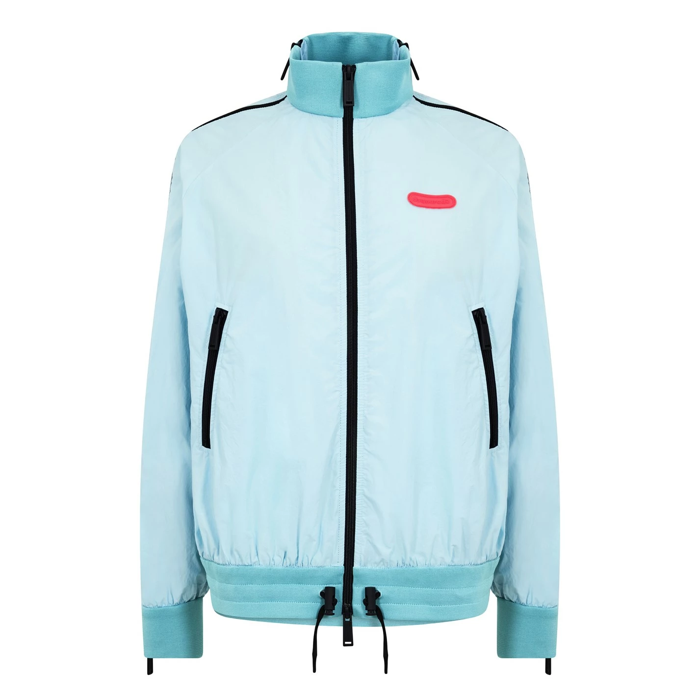 Elevate your jacket collection with this trendy bomber jacket from DSquared2. This cotton jacket comes cut in a regular fit and long sleeve design. It sports ribbed stand up collar, cuffs and hem which allows the wearer more comfort. To fasten there is a full frontal two way zip closure, two maxi zips on the sleeves, two zip up side pockets and a drawstring on the hem to adjust and find a more comfortable fit. The look is completed in a sky blue block colour design with contrasting black detailing to its features, it adorns the iconic brand name embellished proudly to the chest in red, allowing for brand recognition easily and giving off a quality finish. Materials: Primary fabric 100% cotton, Secondary Fabric :100 % Cotton Detailing: 100% polyester. Machine washable 30 degrees, see care label for other information.