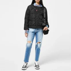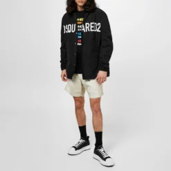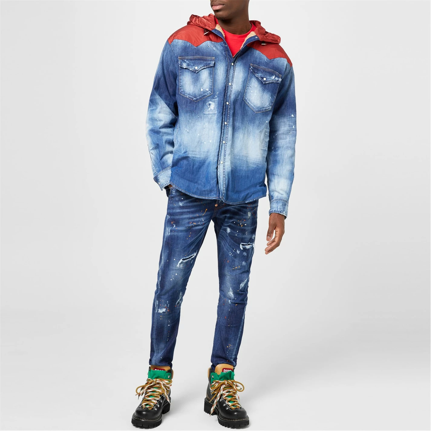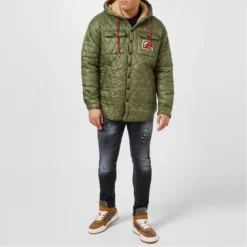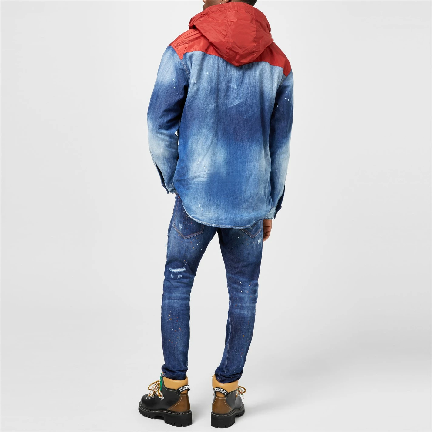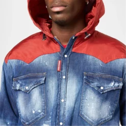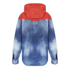 Update your outer wear with the dsquared2 Techno Hooded Military Jacket. Crafted from a cotton-blend fabrication boasting a denim finish to the lower half, this garment adorns classic trims to the central button packet and button cuffs to the long sleeves for a casual styling. Adorning a polyester fabric panel to the shoulders and hooded neckline for a contemporary touch, this jacket is complete with button chest pockets.