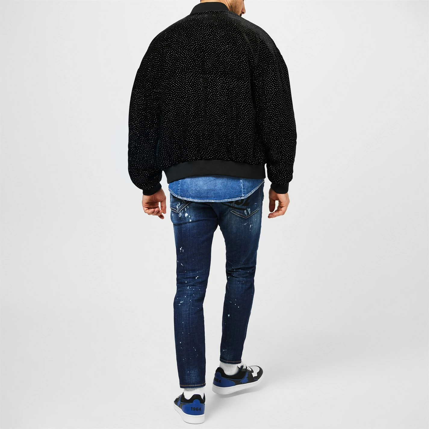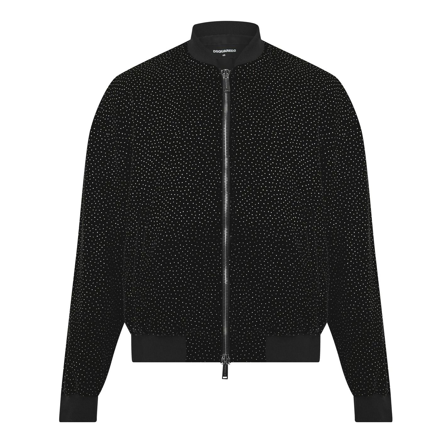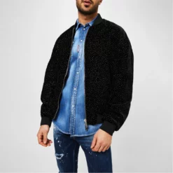 Make your outerwear wardrobe stand out with this Bomber Jacket from dsquared2. Constructed in a soft viscose blend velvet, this jacket is cut in a regular fit and features a stand neckline, a central two way zip fastening, long sleeves, two open exterior pockets and ribbed trims for comfort. The look is finished with an eye-catching all over stardust print and the DSquared2 branding on the zip fastening, interior lining and tags. Main: 68% fastening, 20% polyester, 12% silk. Lining: 100% polyester. Pocket Lining: 100% cotton. For care instructions, please refer to labelling. .