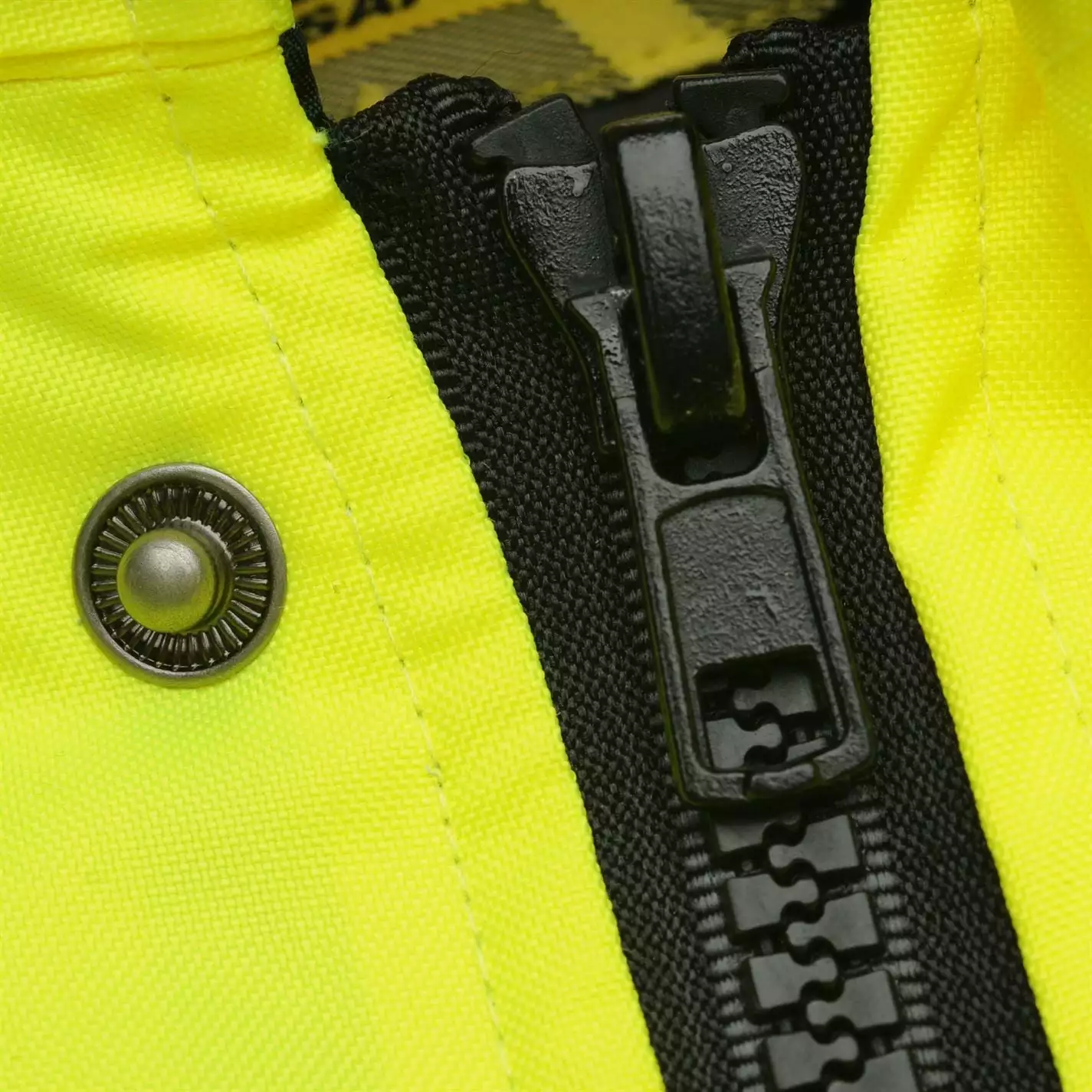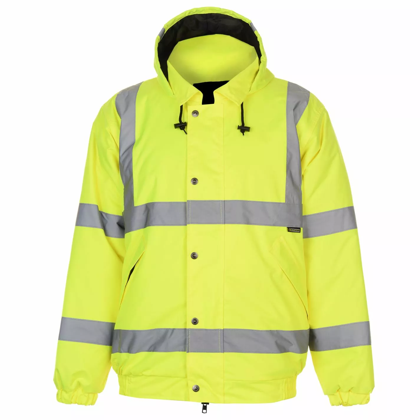 Stay safe in the Dunlop Hi Vis Bomber Jacket featuring VizLite reflective stripes coupled with a fluorescent yellow design for added visibility when you’re in working environments. The mens safety jacket also features an adjustable, drawcord hood coupled with an elasticated waistband and cuffs for a comfy fit and is complete with a quilted lining and 2 zipped pockets.