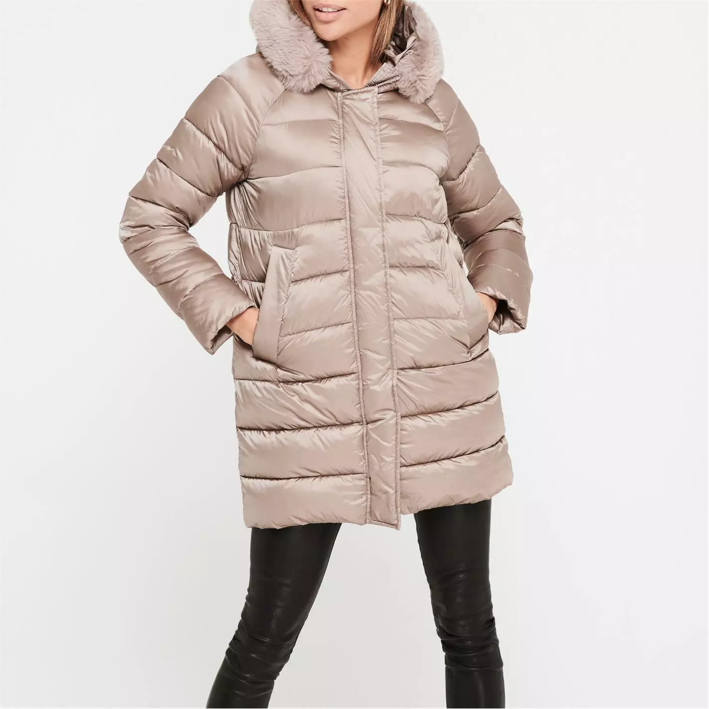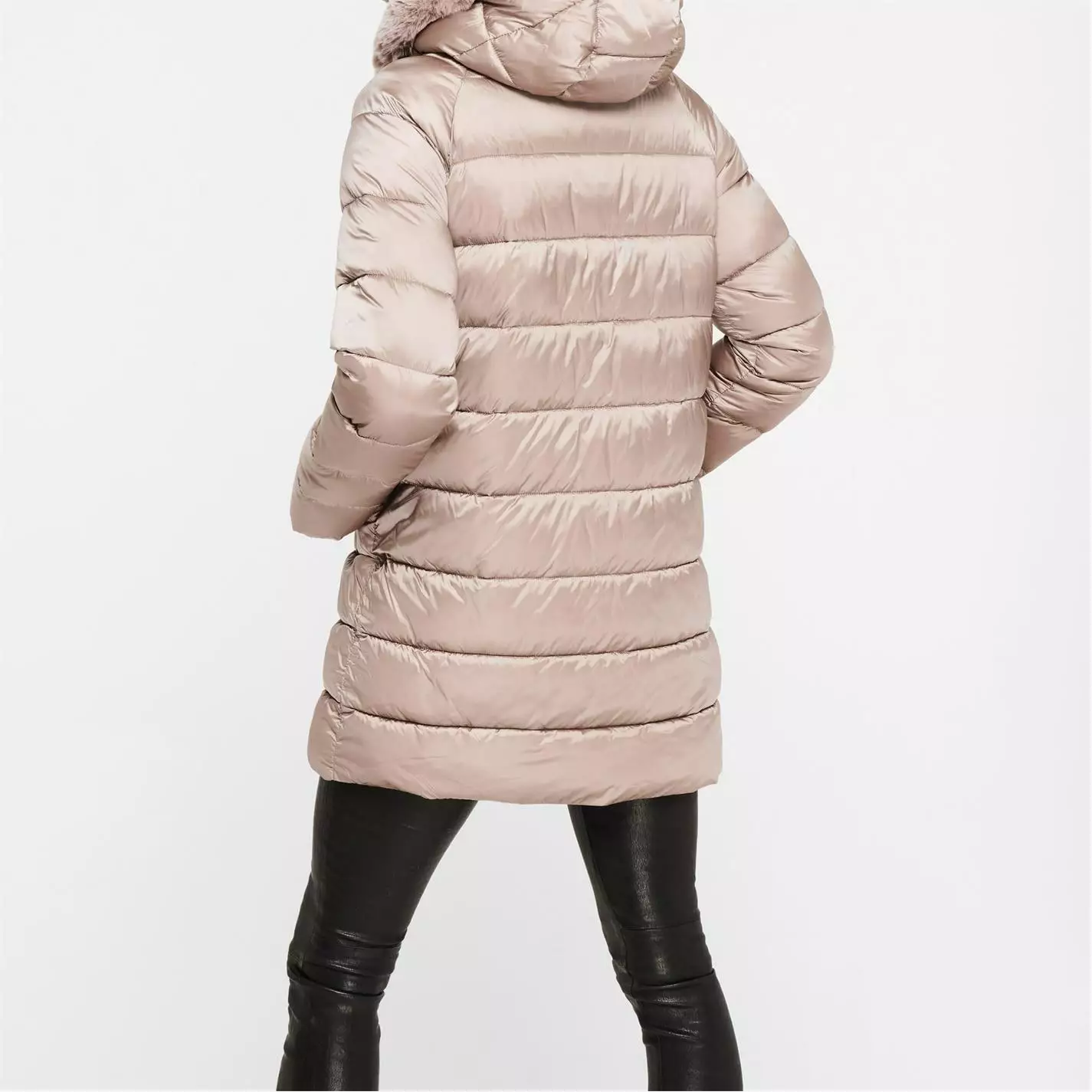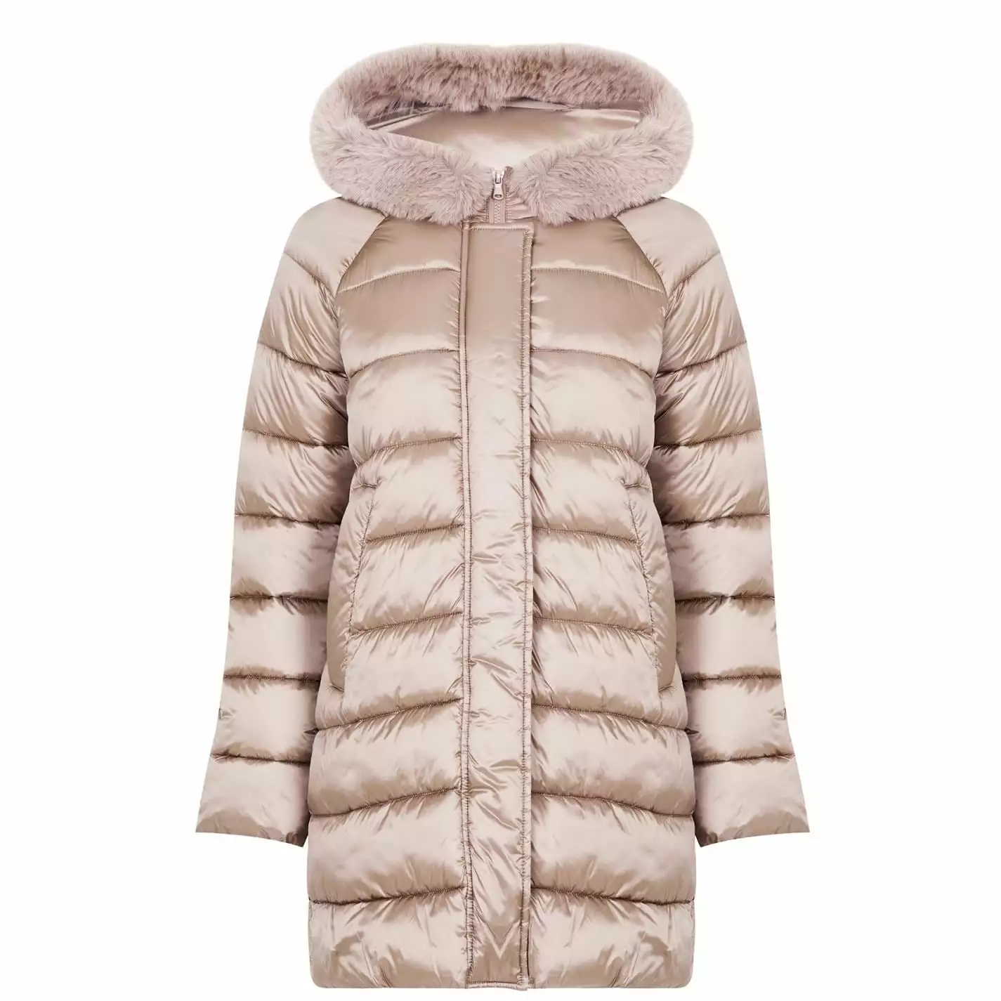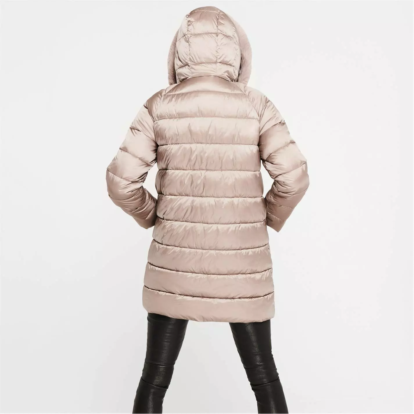 Add to your outerwear with the Ricamo Jacket from Emme. Made from nylon, this jacket is designed with a faux fur trimmed hood and full zip fastening. With twin hand pockets and a snap button overlay, this jacket is finished in a long length.