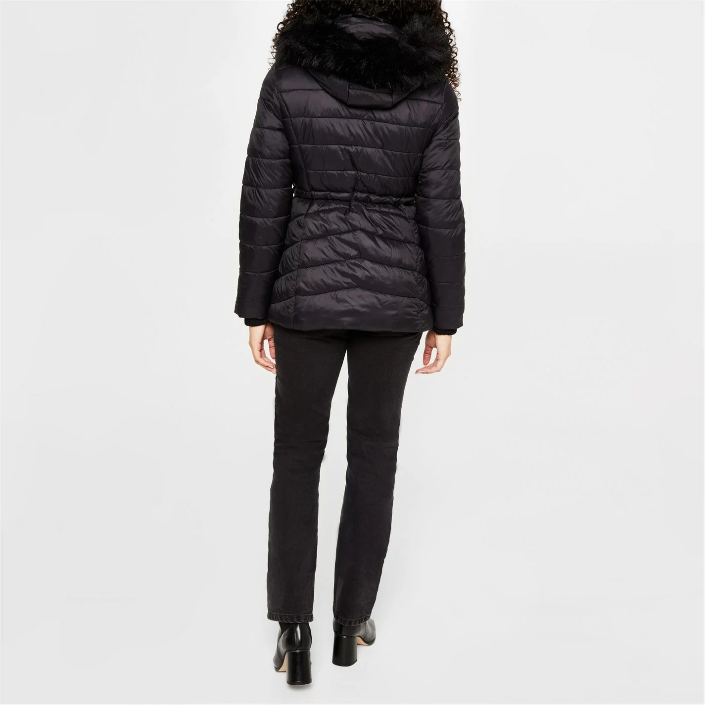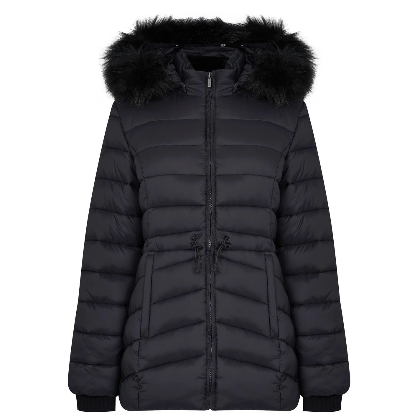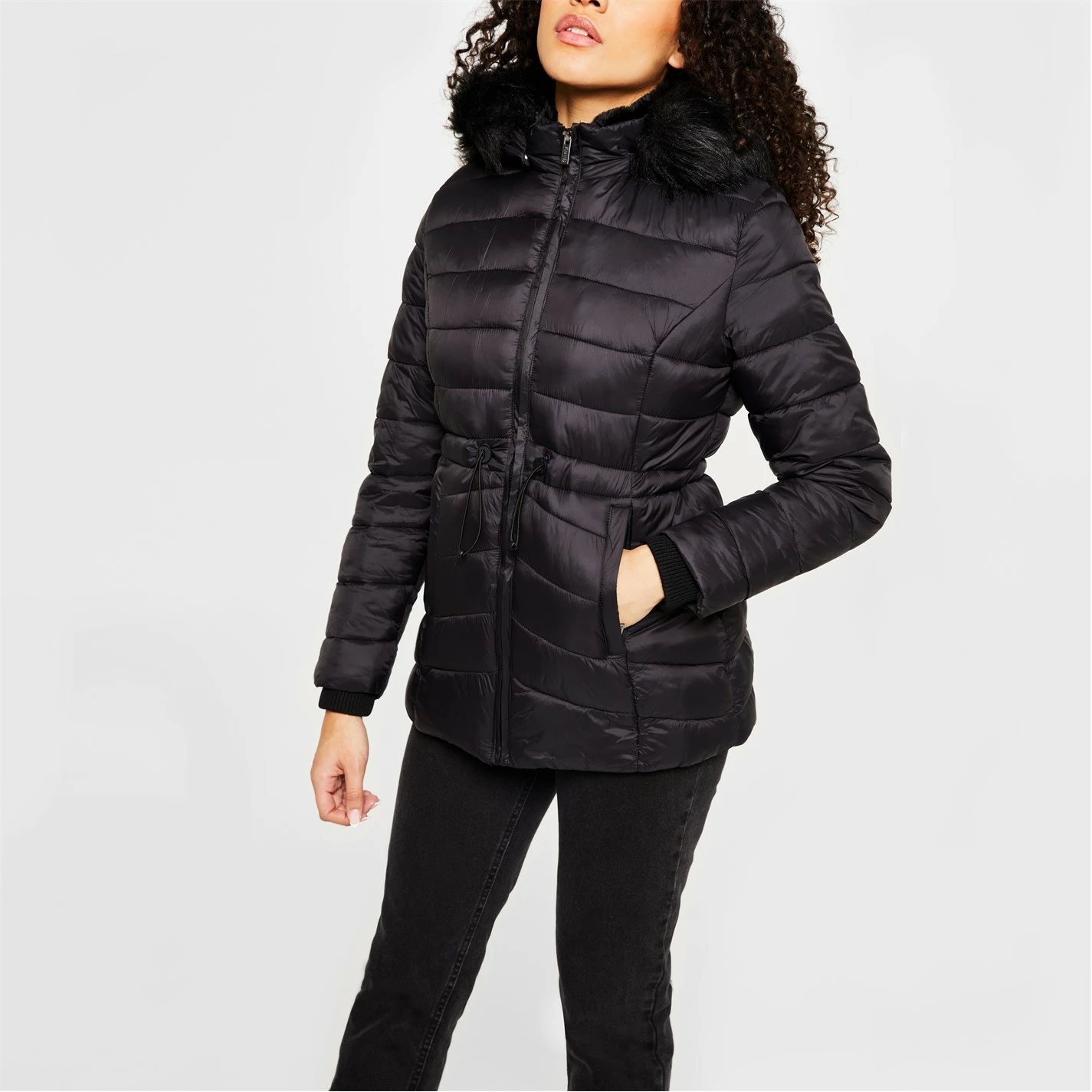 With a padded construction for a comfortable fit during the winter months, this thigh length silhouette styles a drawstring fastening to the waistband for a figure-hugging silhouette while the ribbed cuffs to the long sleeves offer a secure fit. Styling a faux-fur to the hooded neckline with a full zip fastening to the centre, this jacket offers two slip pockets to the waist.