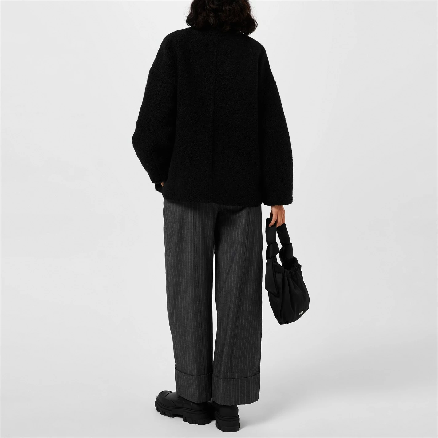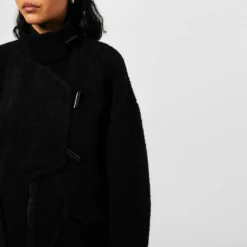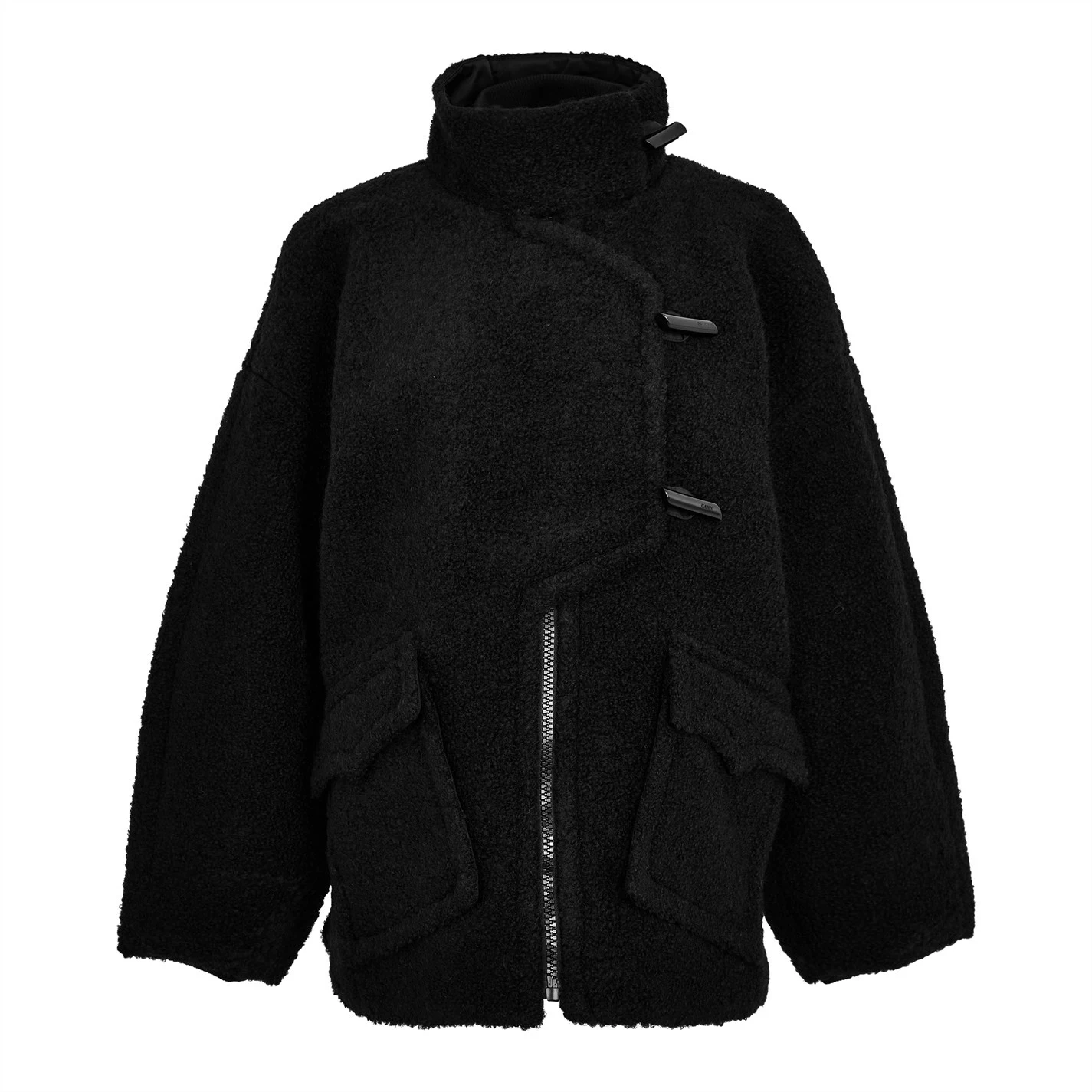 Refresh your winter outerwear wardrobe with the Ganni Boucle Wool Jacket. Cut in an oversized silhouette, this garment has been crafted from a recycled wool fabrication adorned with a soft boucle texture for a minimal aesthetic while the asymmetrical closure to the front adds a modern look. Accompanied with a funnel neckline and dropped shoulders to the long sleeves, dual patch pockets frame the look for a classic finishing touch. Main: 60% Wool, 40% polyester, Lining: 100% polyester, Dry clean only.