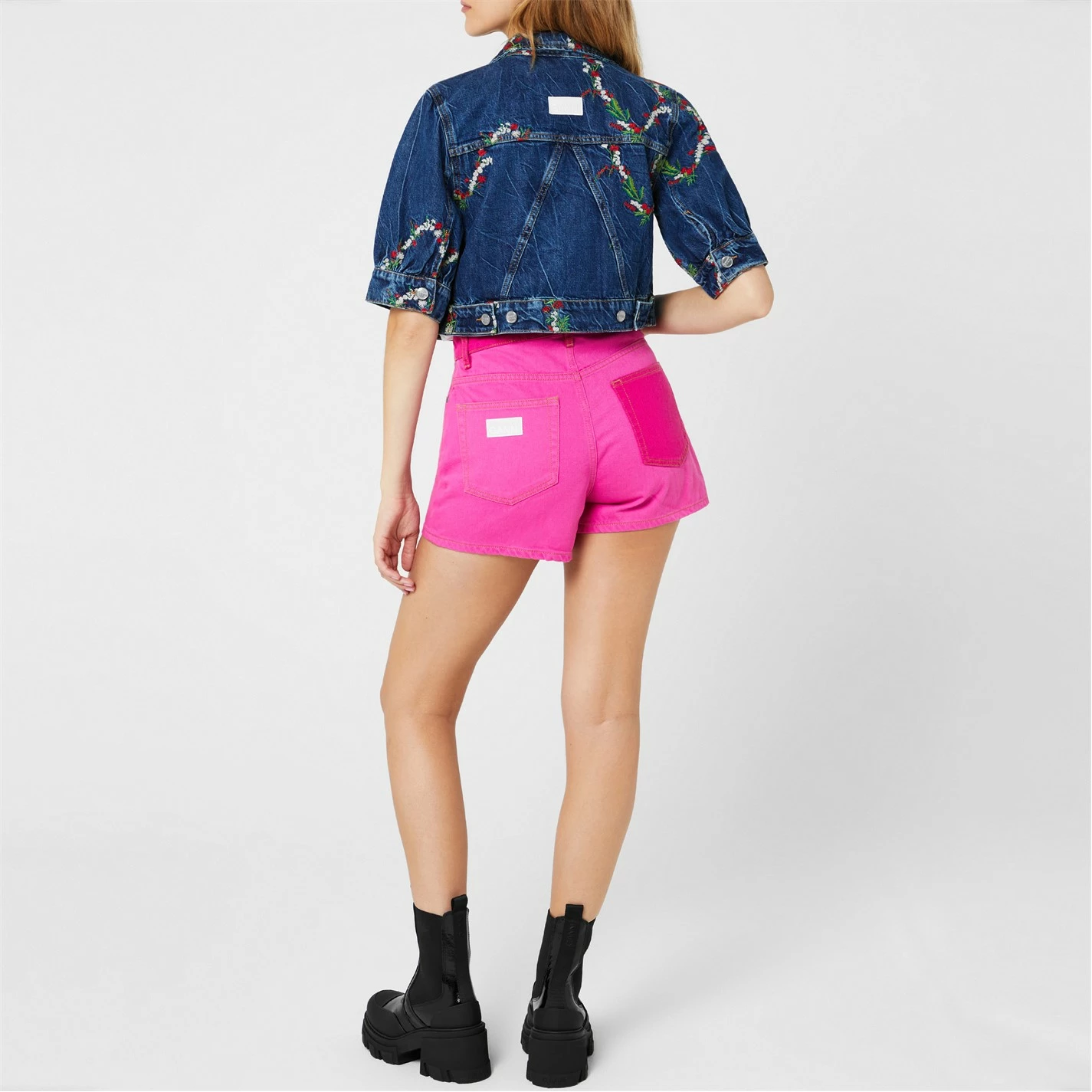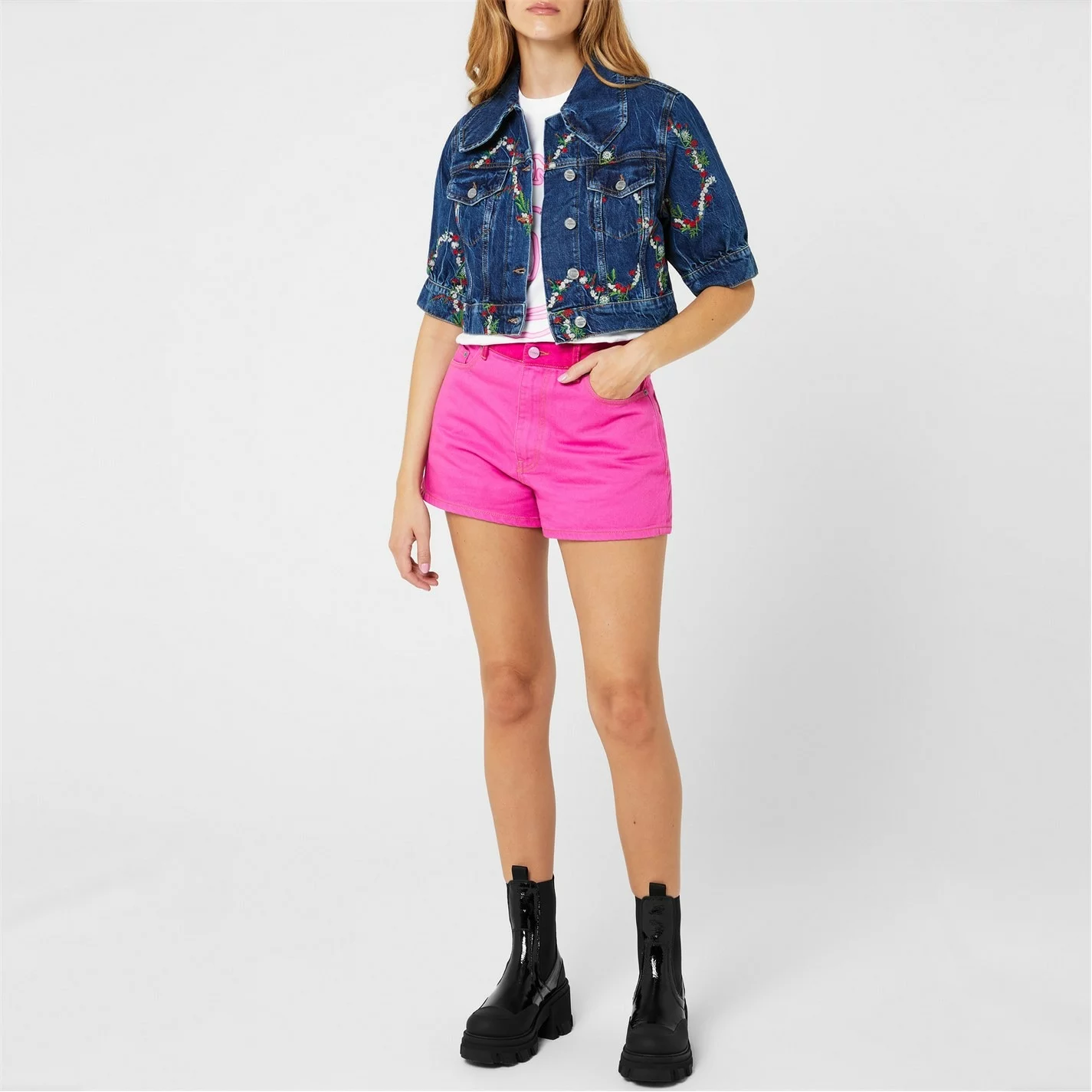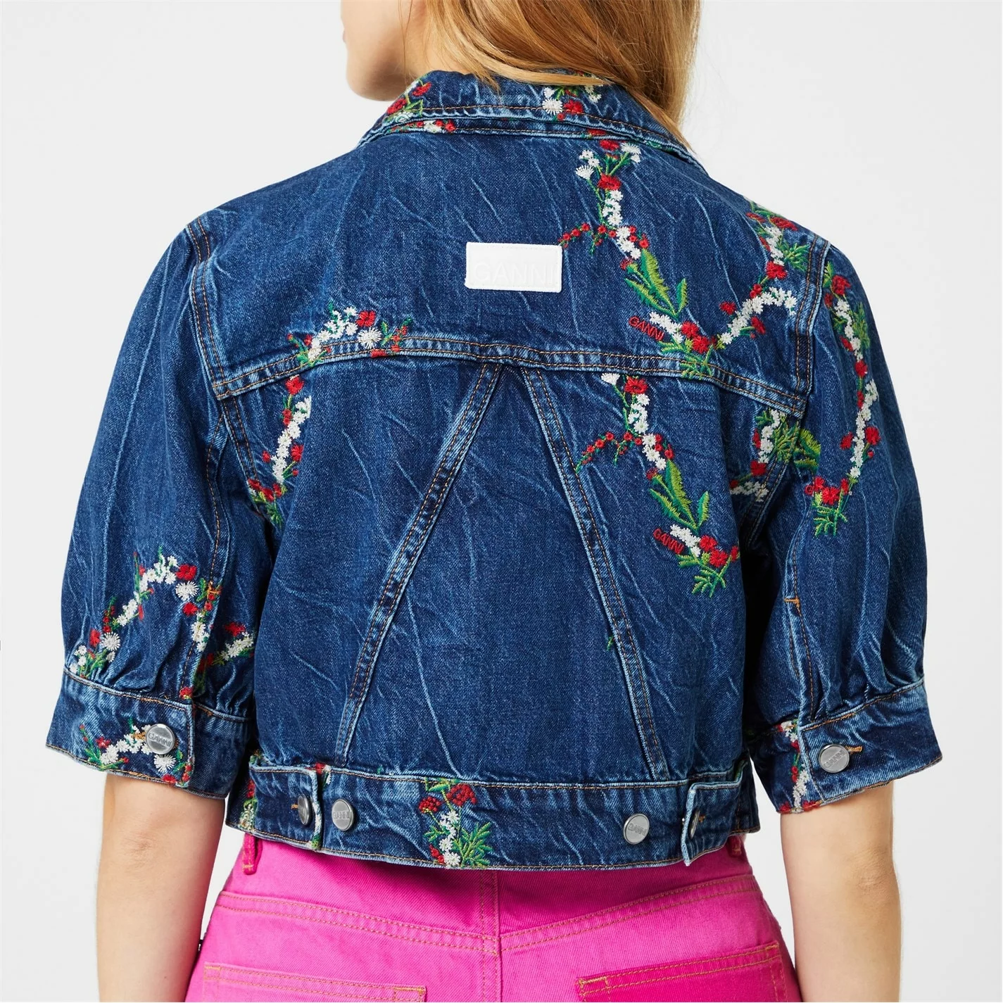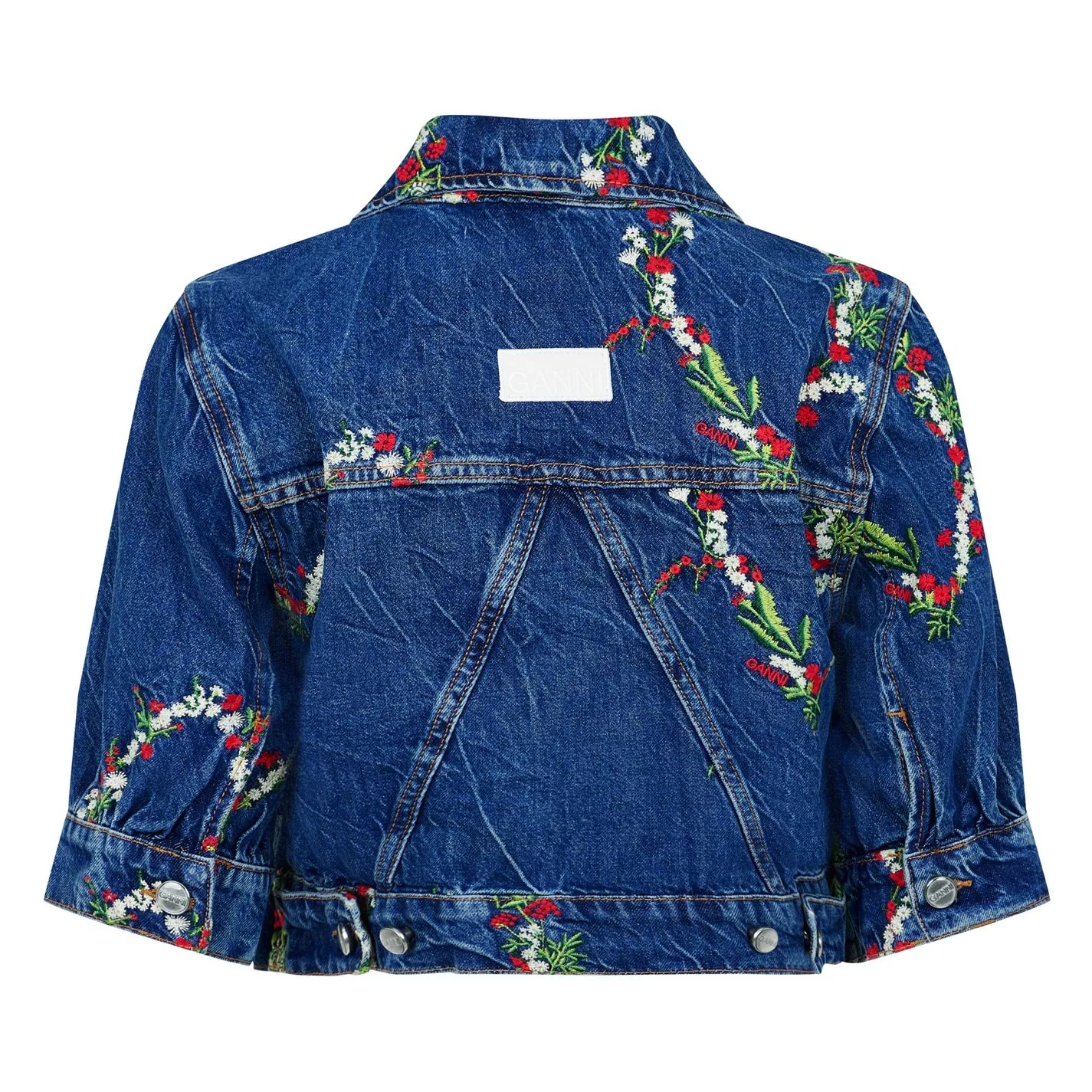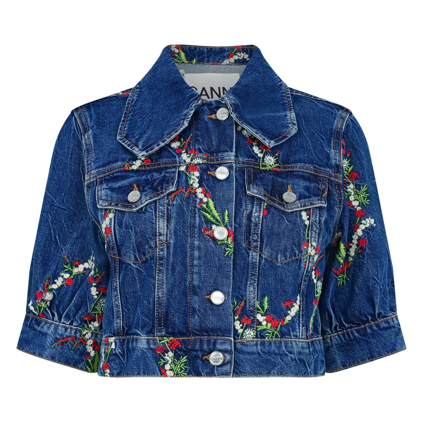 Add a summer statement to your collection with the Embroidered Crop Denim Jacket from ganni. Designed with a diamond collar and short puffed sleeves, this jacket is cut to a cropped boxy fit to create a chic summery layer. Made from pure organic cotton with aged silver hardware for a classic denim aesthetic, this jacket is finished with floral embroidery details throughout.