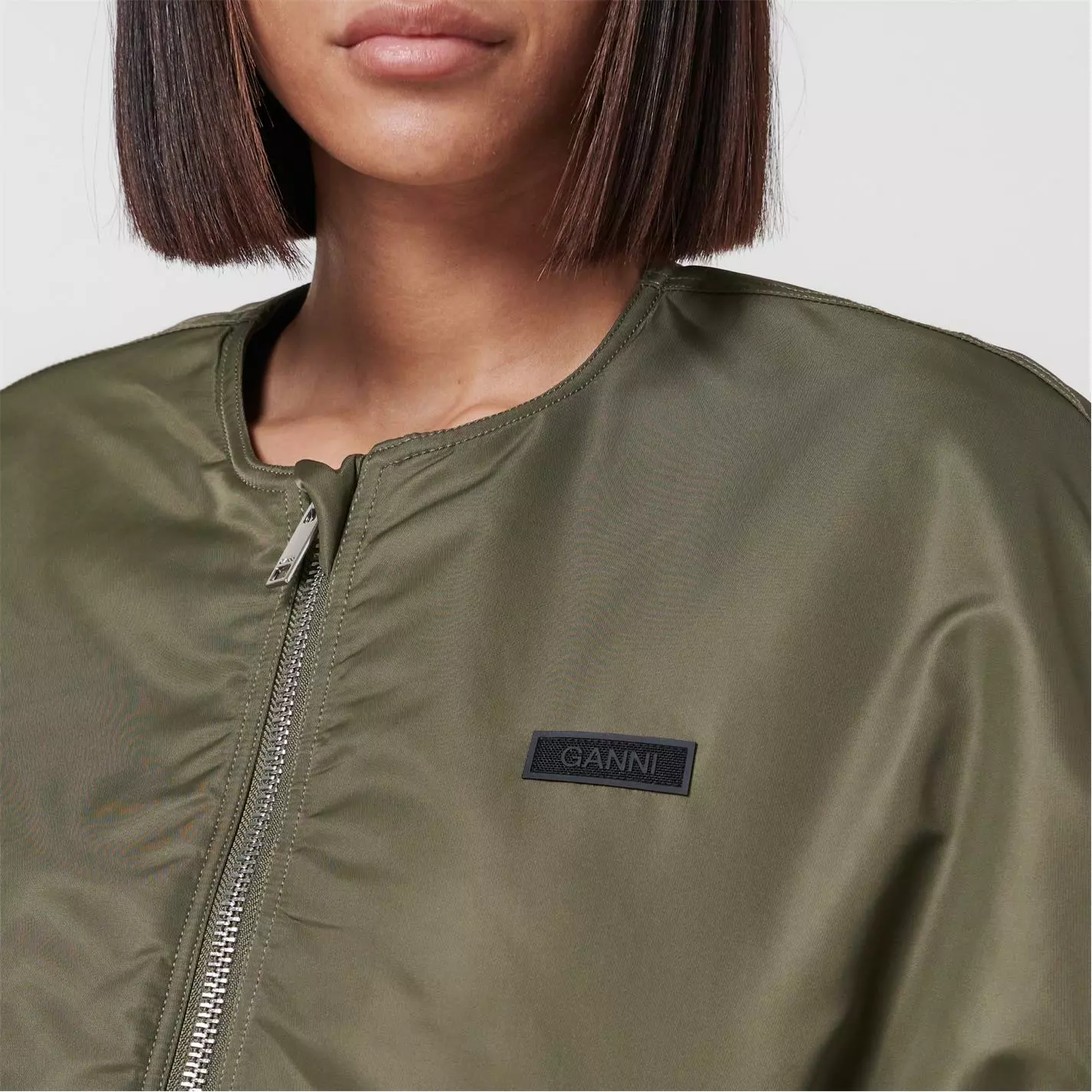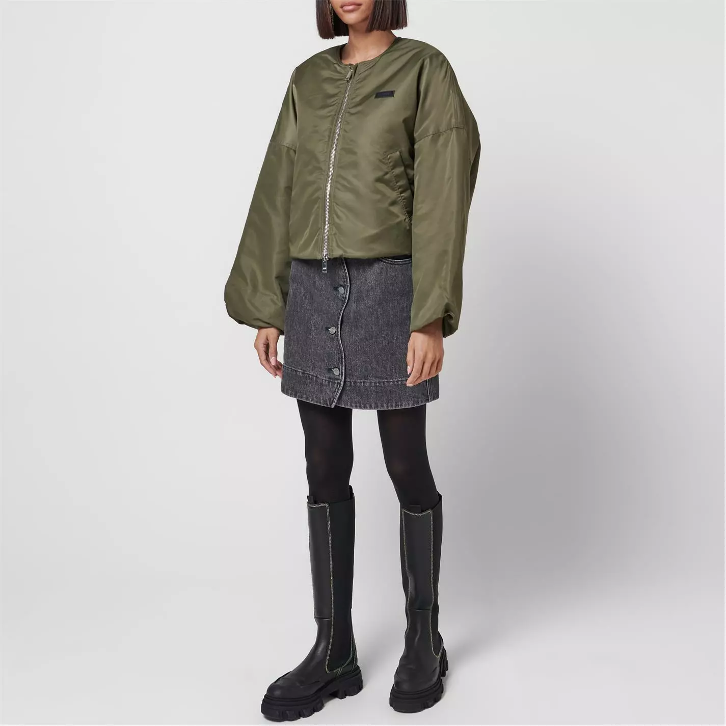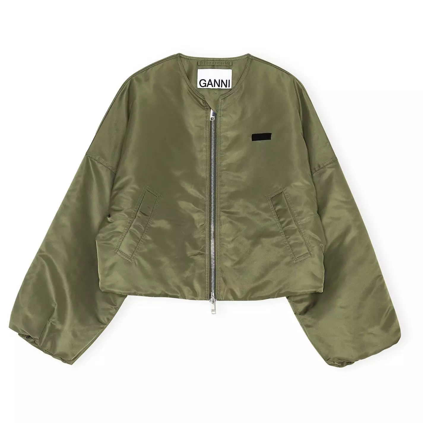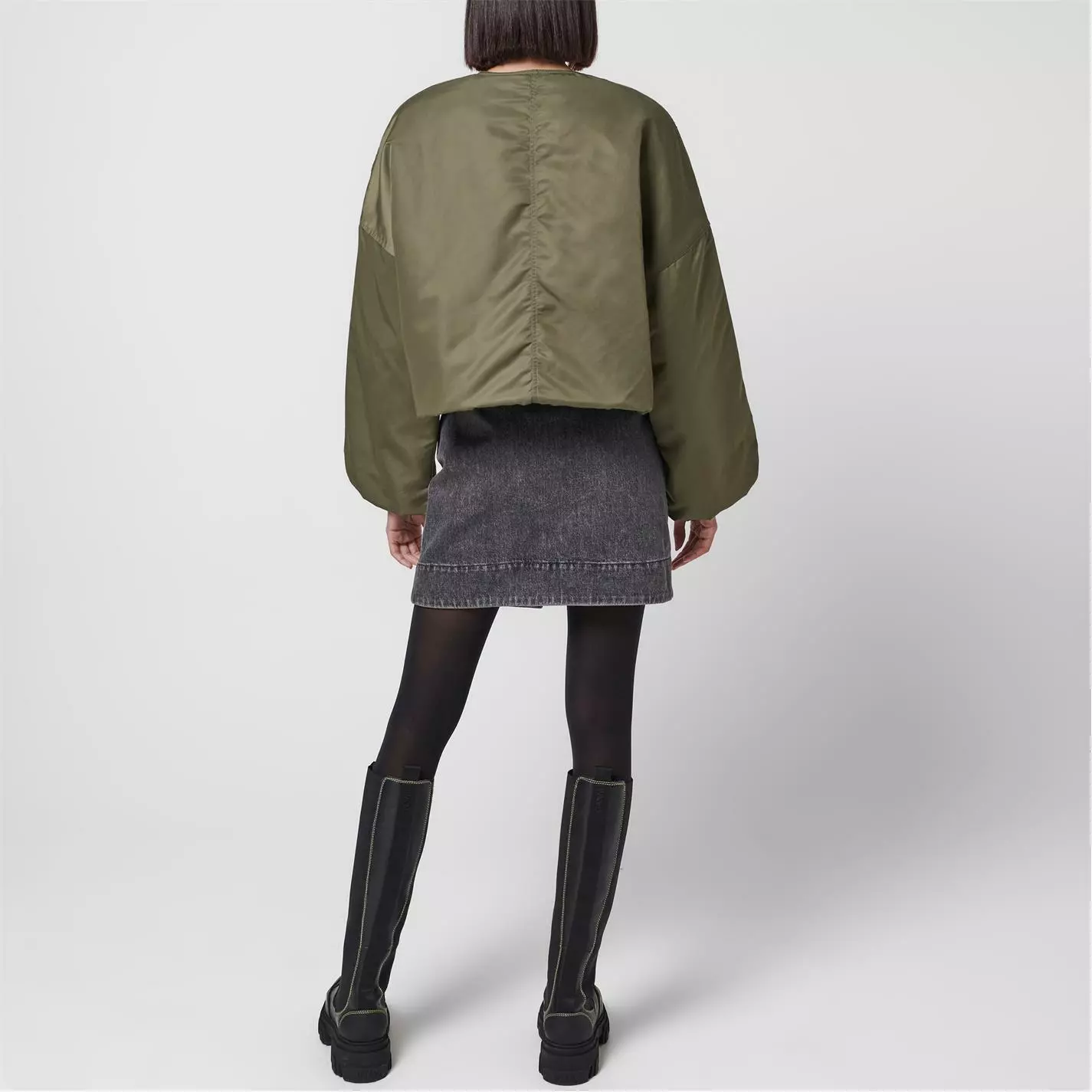 Revise your essential attire with this bomber jacket brought to you by Ganni. Jacket in lightly padded recycled tech fabric, finished with a heavy silver zip closure. Showcasing a relaxed cropped silhouette with front cargo pockets and elasticated wrists.