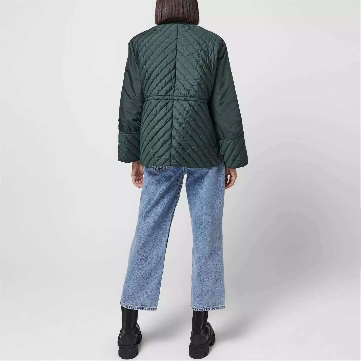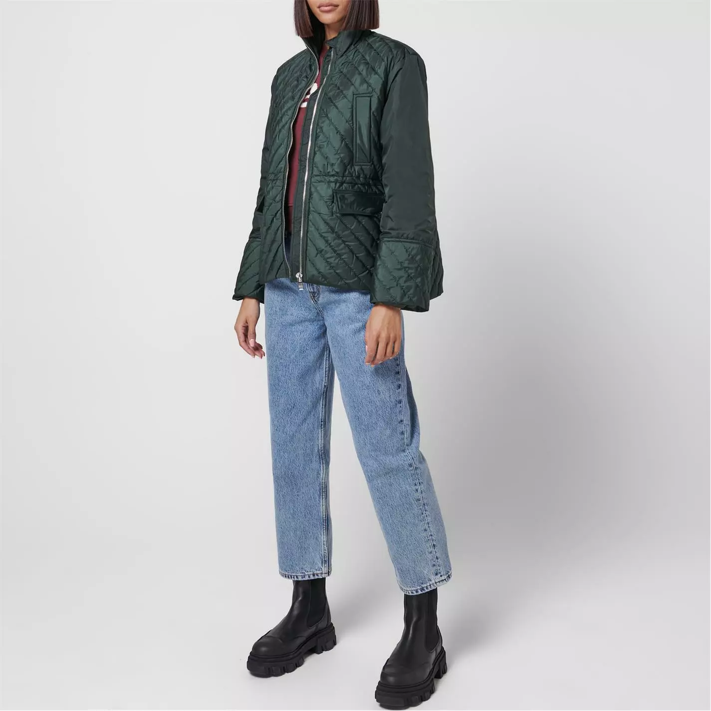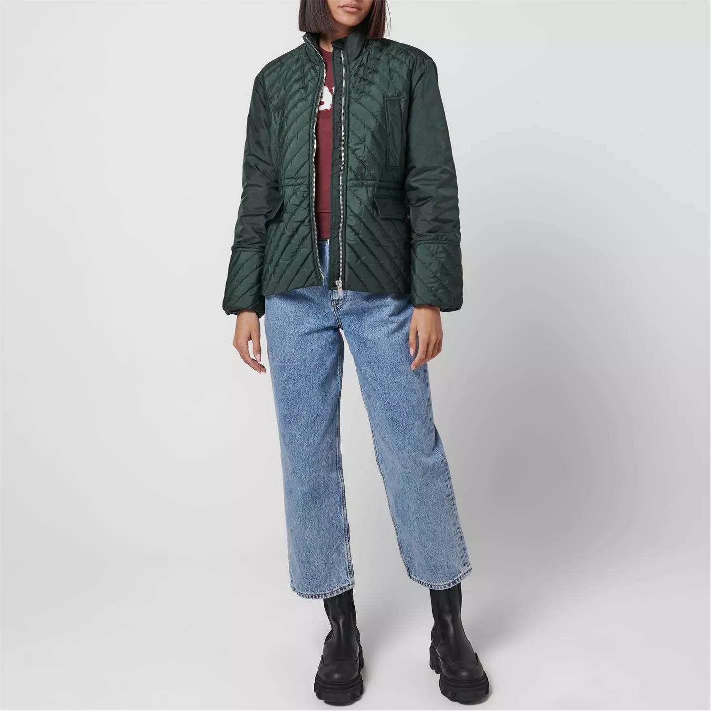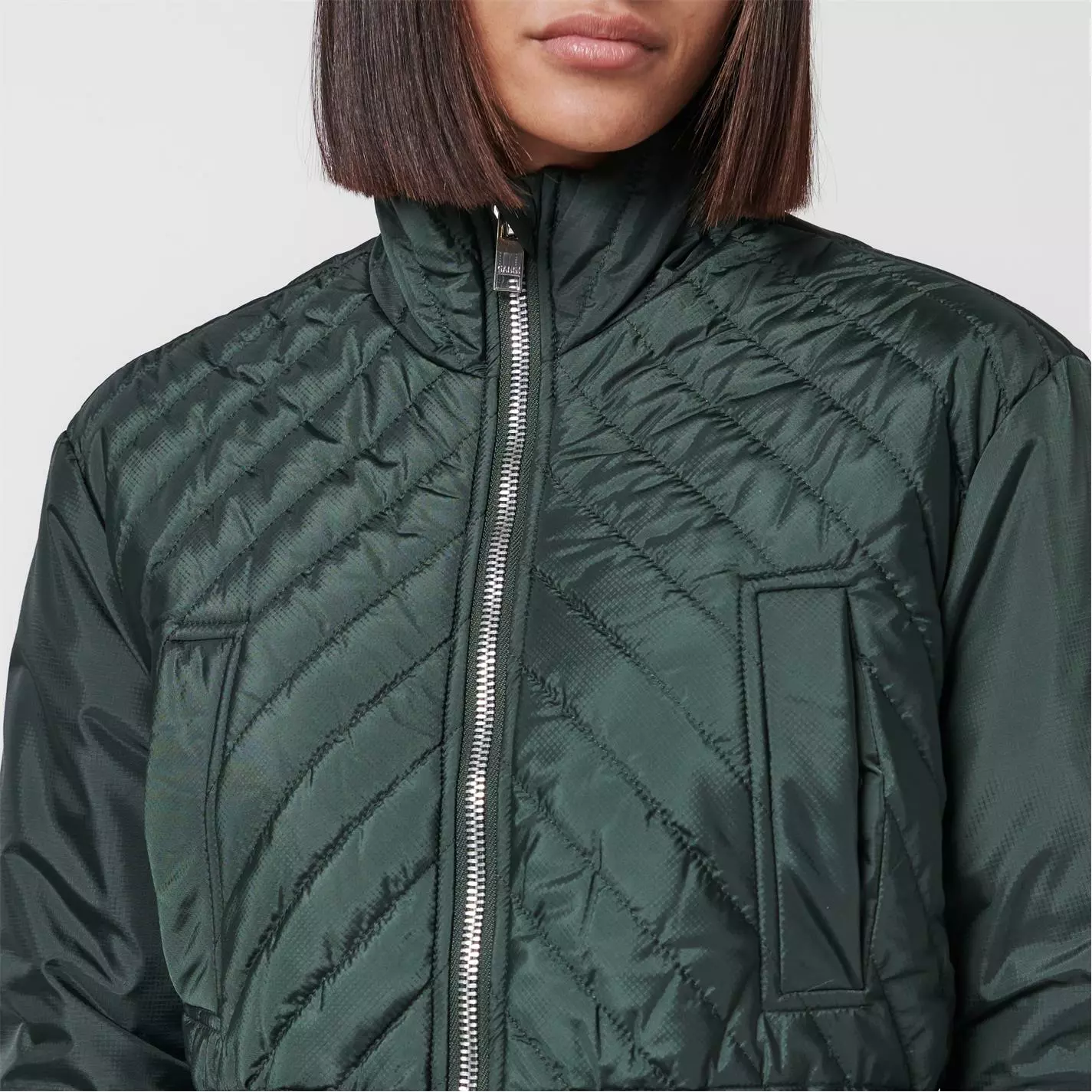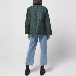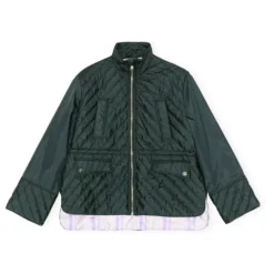 Revise your essential attire with this quilted jacket brought to you by Ganni. Classic jacket in quilted tech fabric, finished with a mock-turtleneck. Heavy silver GANNI logo zip closure that unzips from both top and bottom. Lightweight, quilted ripstop tech fabric with diagonal seams. A must have fashion statement.