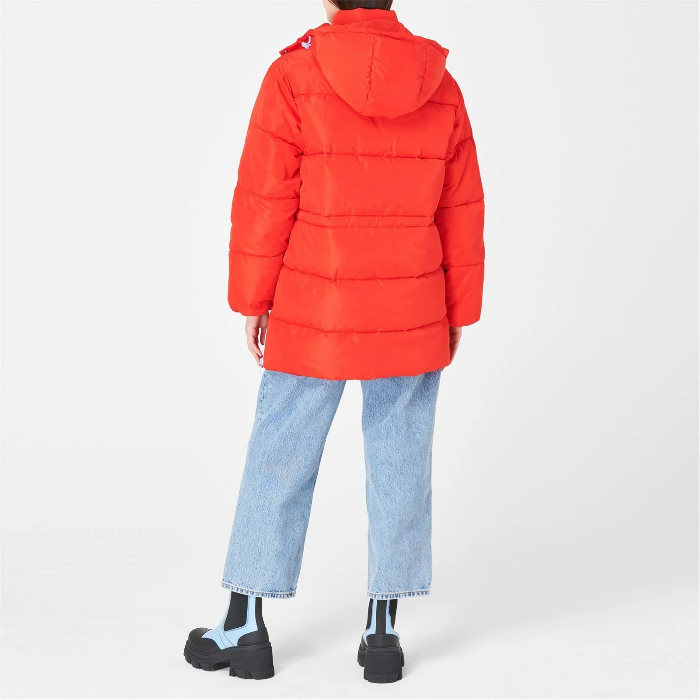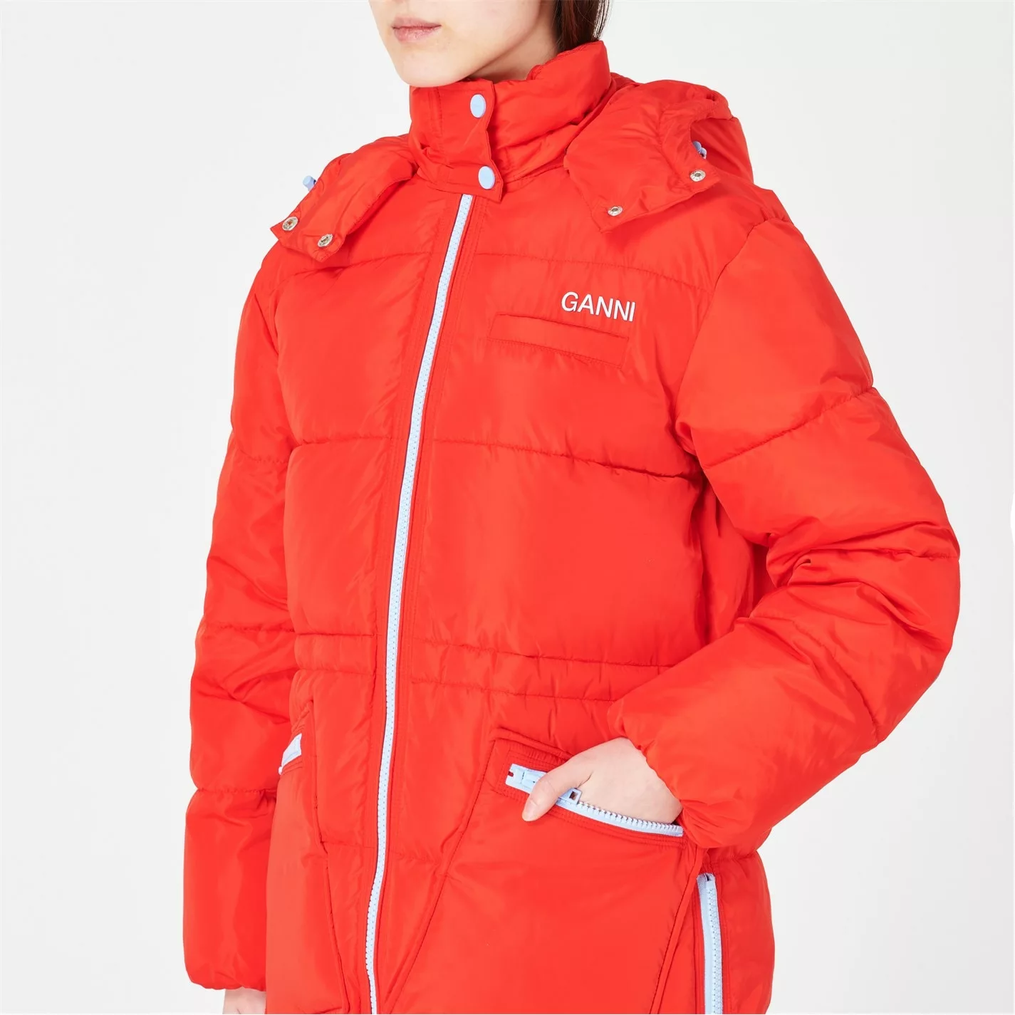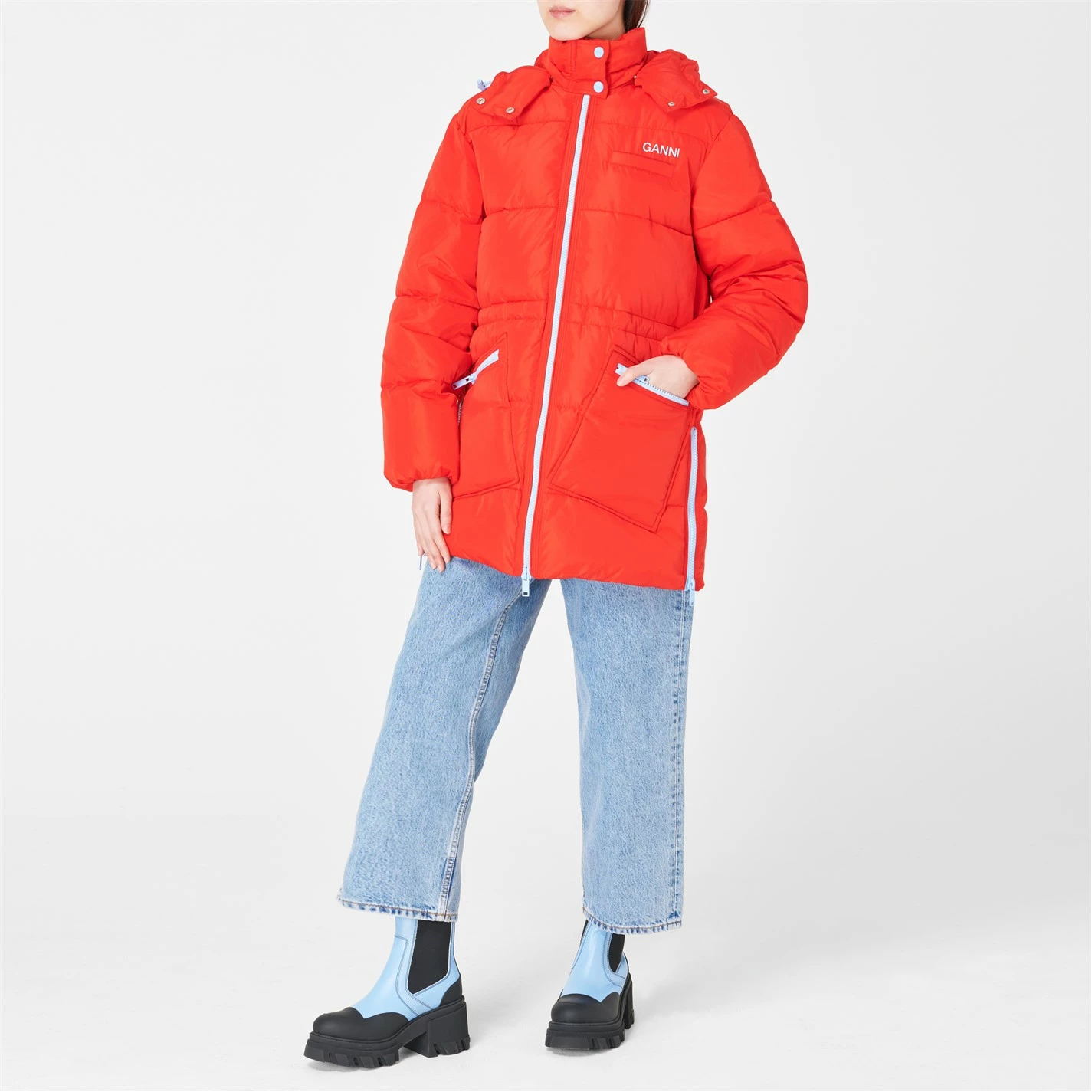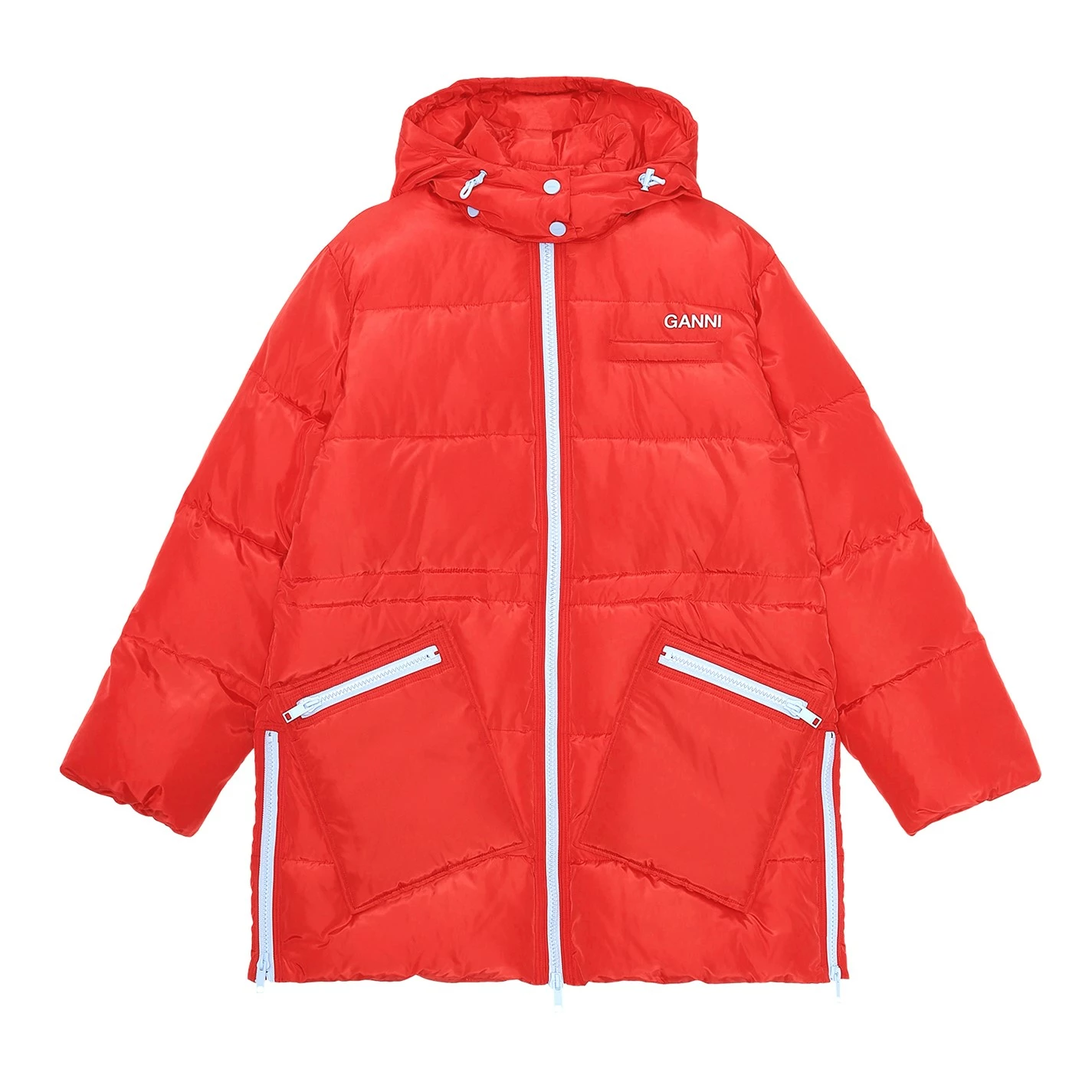 Add a pop of colour to your seasonal outerwear with the High Risk Puffer Jacket from ganni. Designed with a mock turtleneck alongside a toggled hood and long sleeves, this puffer is cut to a mid-thigh length with zipped slits to each side so you can create your own look. Characterised by twin zipped hand pockets and a single pocket to the chest, this puffer is finished in a bright red with contrasting hardware and the rubber Ganni logo to the chest.