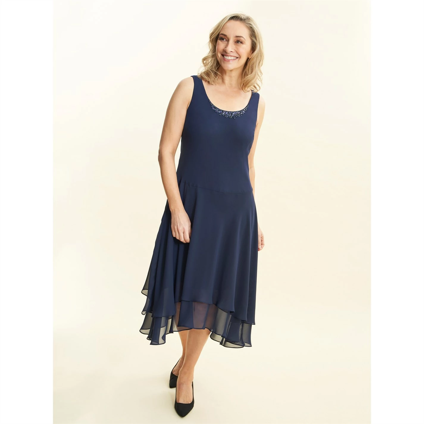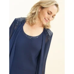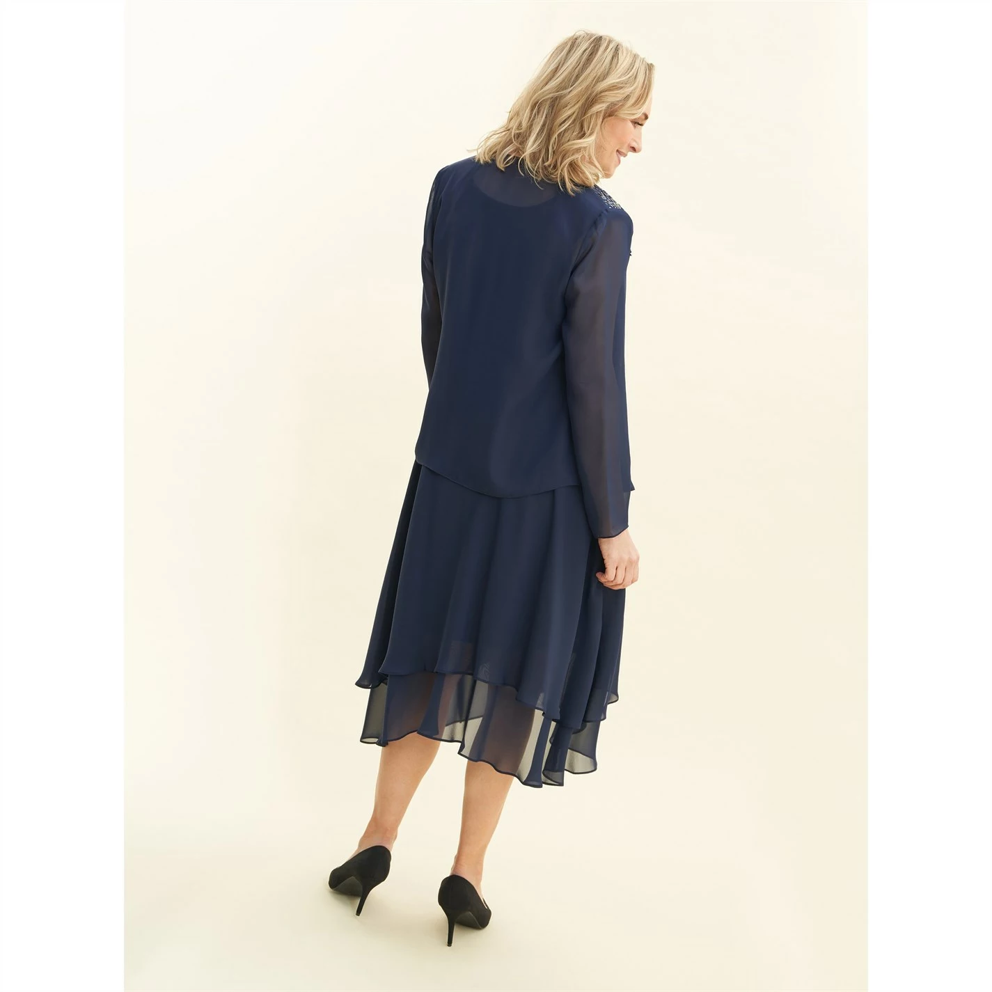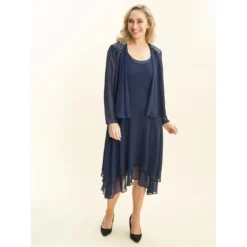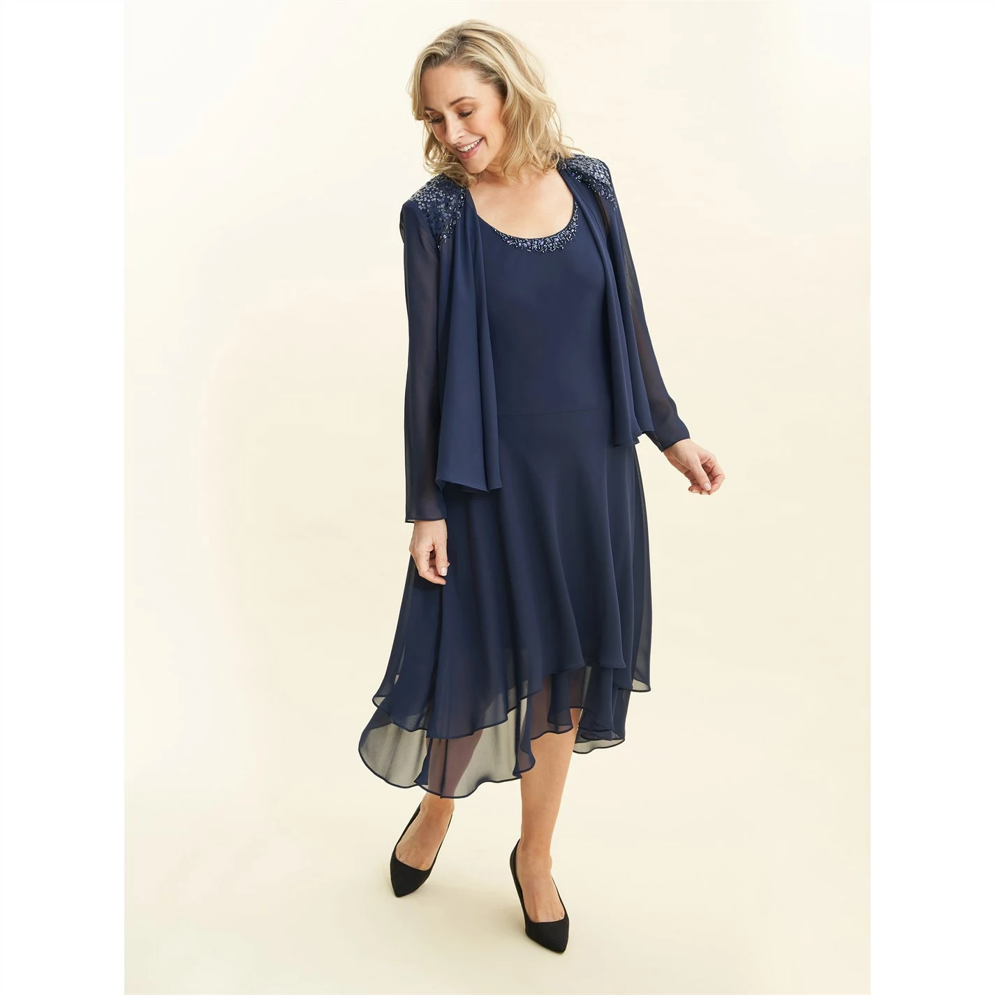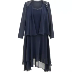 This modest mother of the bride/groom dress features a sleeveless beaded scoop neckline and back. The skirt is hidden by a natural waistline and twisted into a tiered high low hem with matching long sleeve jacket and is made of chiffon. Perfect for any special occasion.
