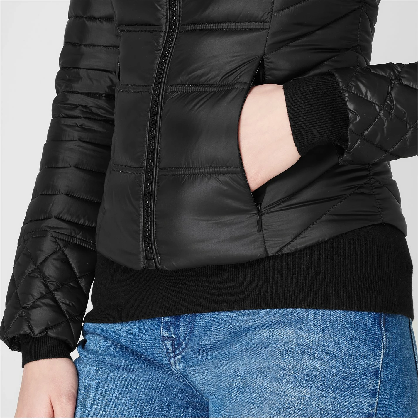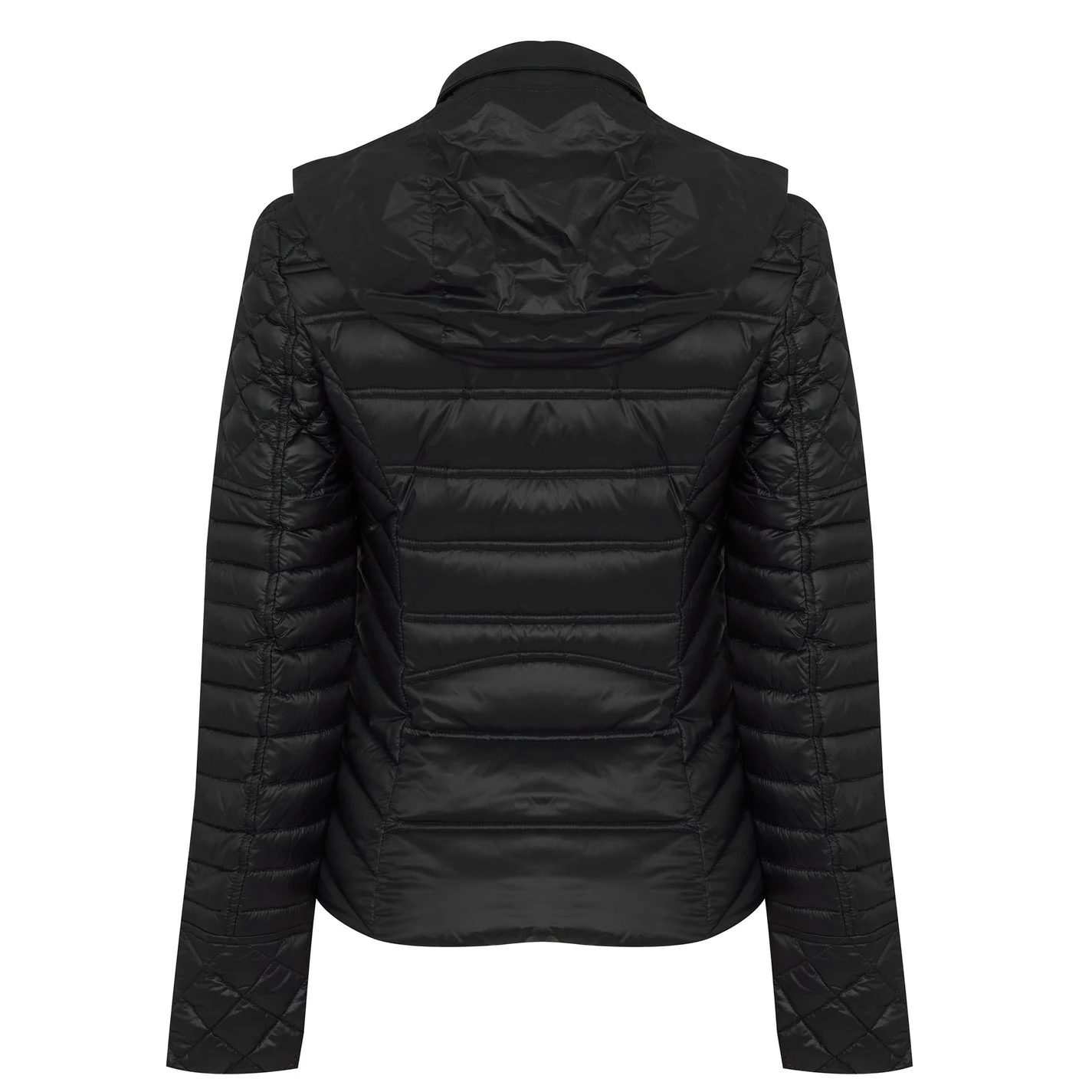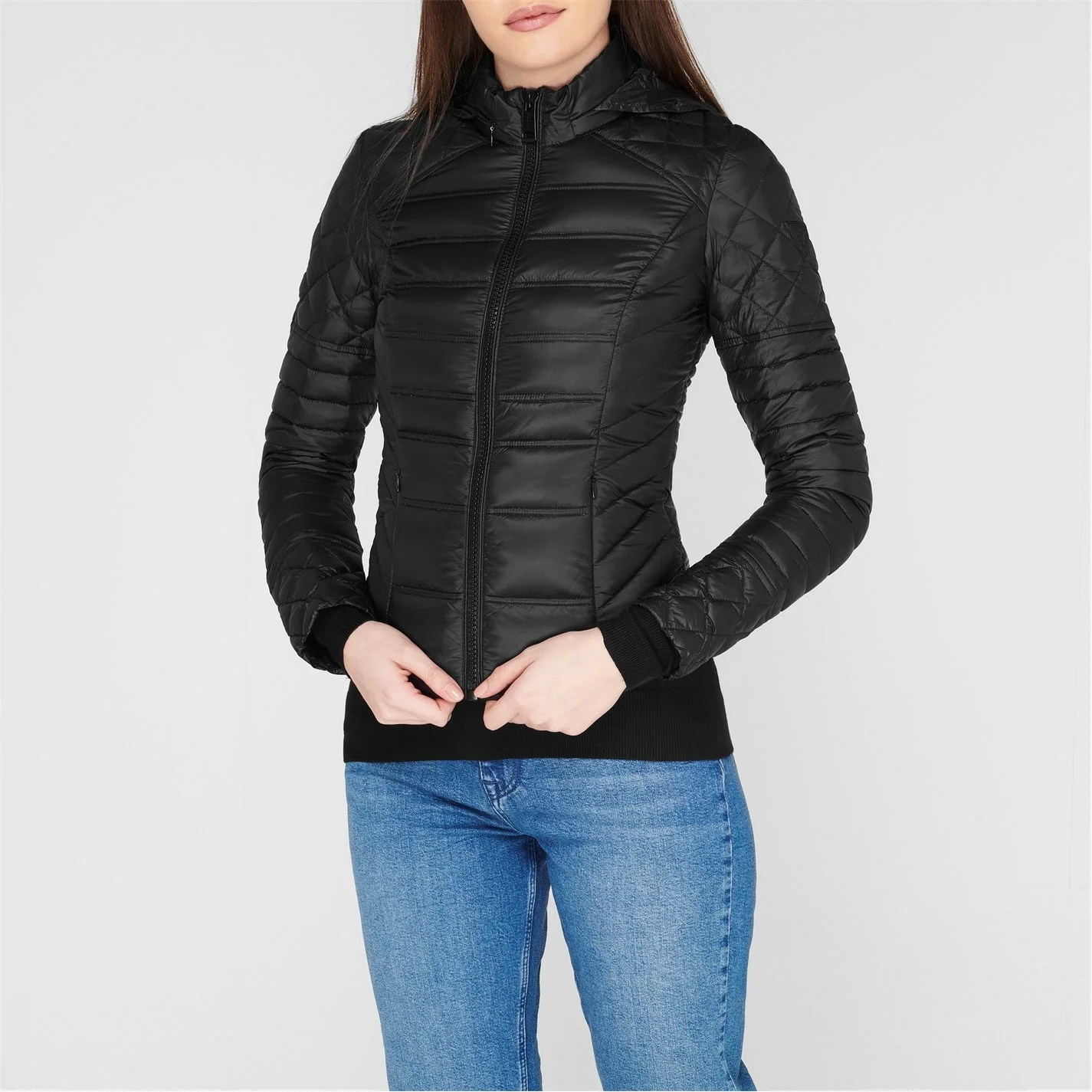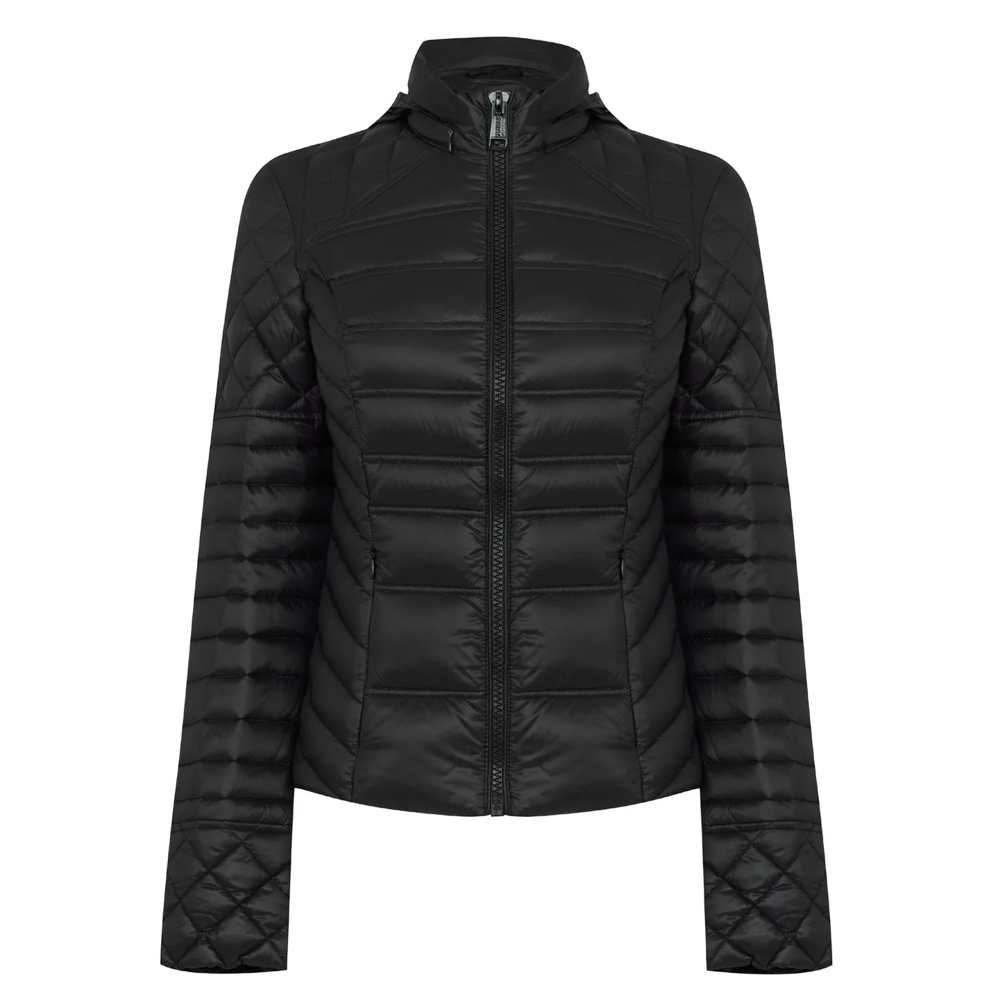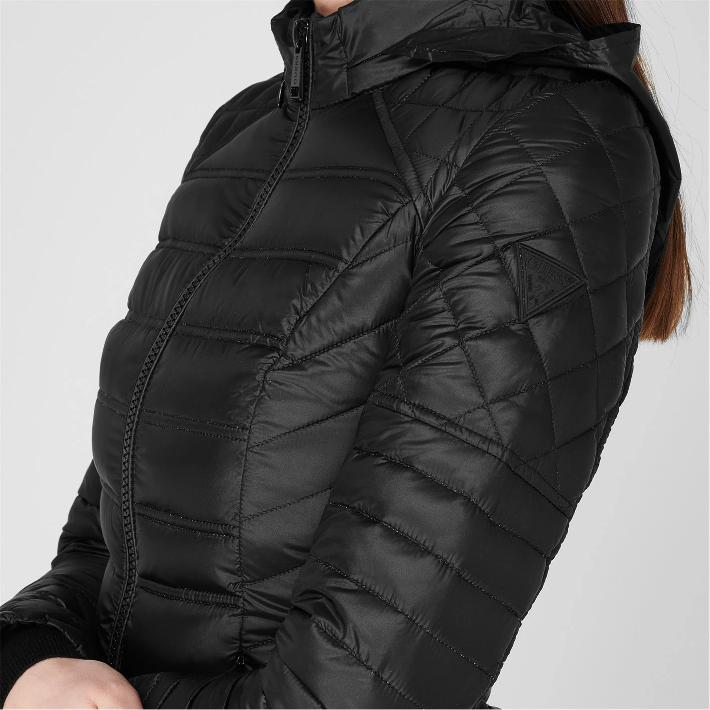 This Guess Orsola Jacket will keep you warm during the colder nights. Crafted with a polyamide material in a regular fit, this piece features feather down padding to retain your body heat whilst a water repellent construction keeps you dry. Designed with a packable feature, full frontal zip fastening, a raised neck with a hidden hood revealable by a zipline, two zip pockets and long sleeves with open trims. Decorated with a padded design in a solid block colour throughout, the jacket is finished with the Guess branding for instant recognition.