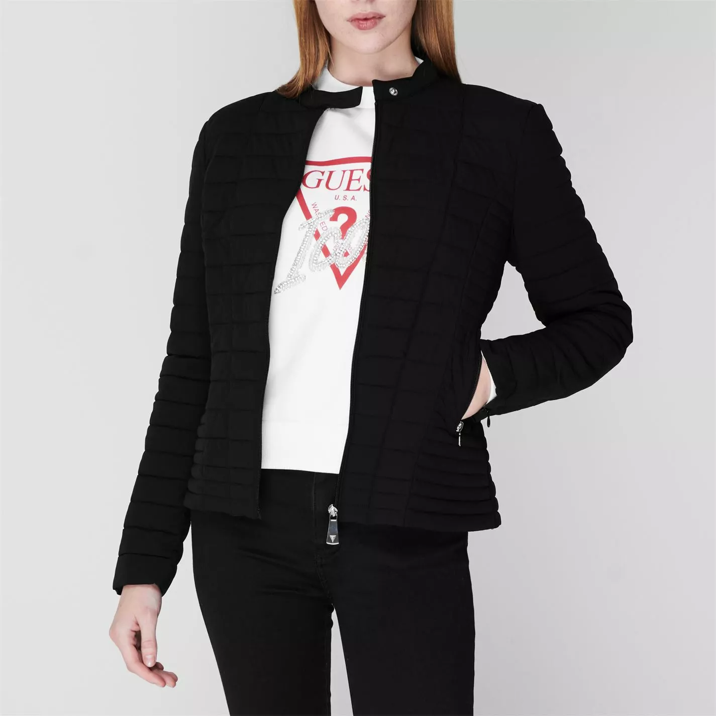 ThisVona Jacket by Guess is perfect for all seasons, places and times. Its lightweight construction means it is perfect for travelling and layering and is crafted with a rounded neckline, long sleeves and central popper fastenings. Featuring two side zip pockets for essentials this piece is finished with Guess branding for a designer touch.