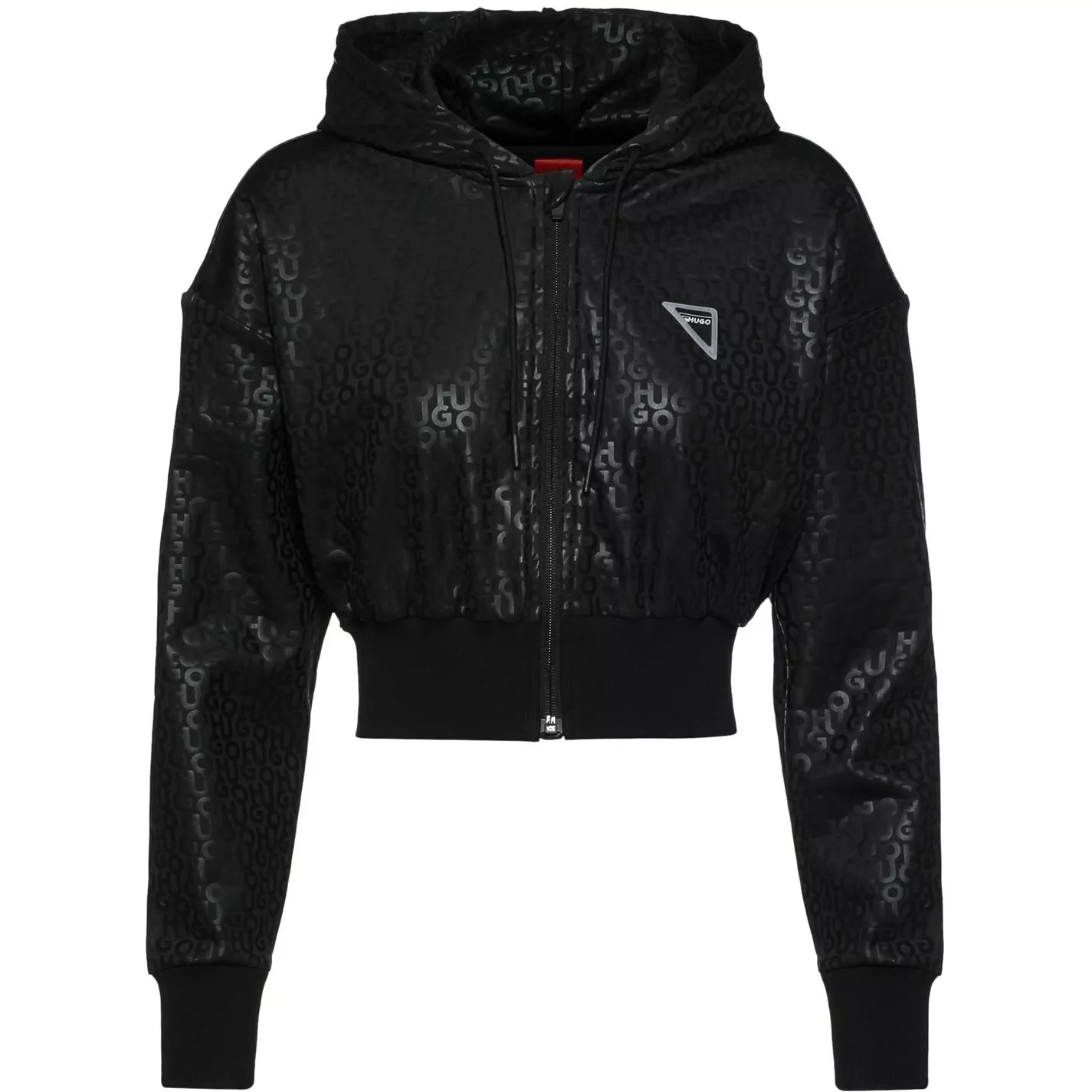 Combining casual styles with contemporary on-trend finishes, the boss Drunella Cropped Bomber Jacket is perfect for daily styling. Crafted from a lightweight fabrication, this cropped silhouette is defined with a thick ribbed hemline for a flattering fit while the staple block colourway is adorned with subtle Hugo branding repeated all-over in a tonal colourway for a minimal aesthetic. Styled with a drawstring adjustable hood and full zip fastening, thick ribbed cuffs are adorned to the long sleeves while the look is signed off with a Hugo embellished logo accented to the chest for a designer stamp.