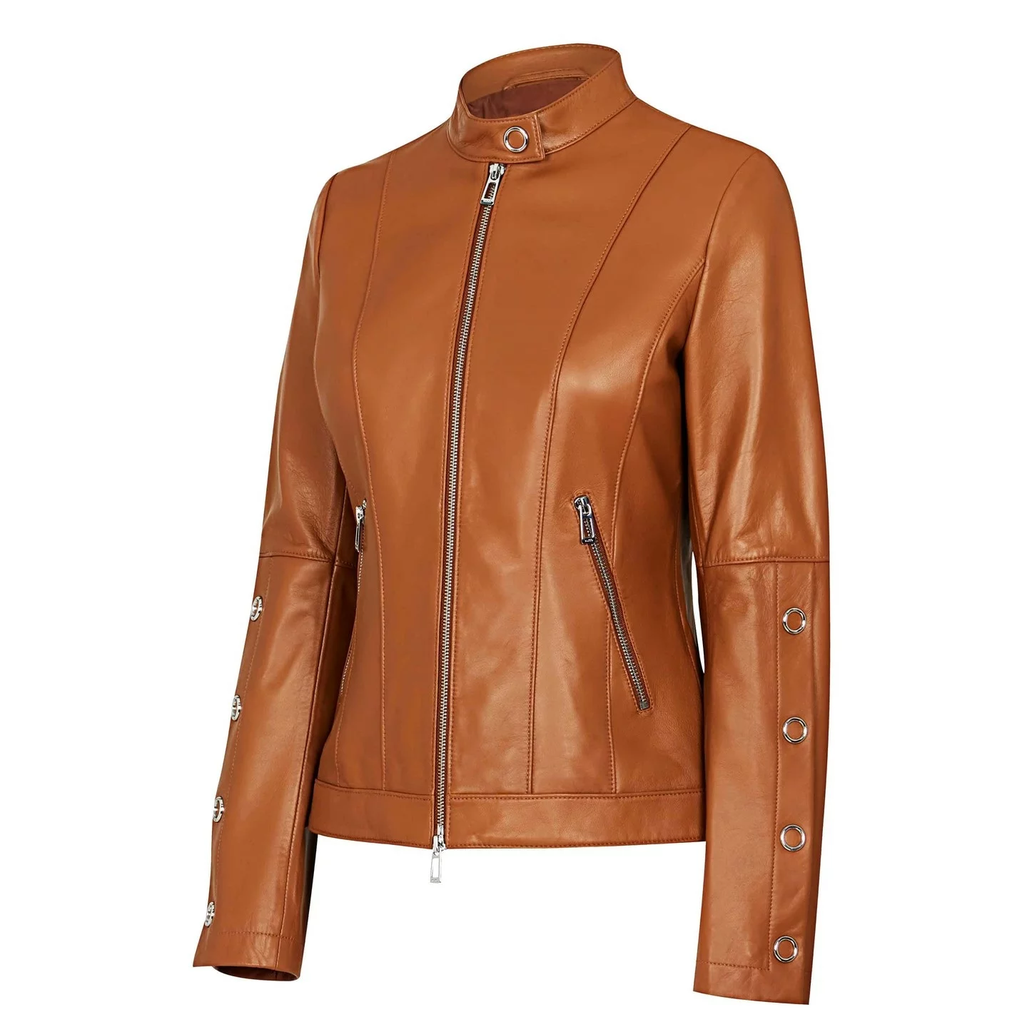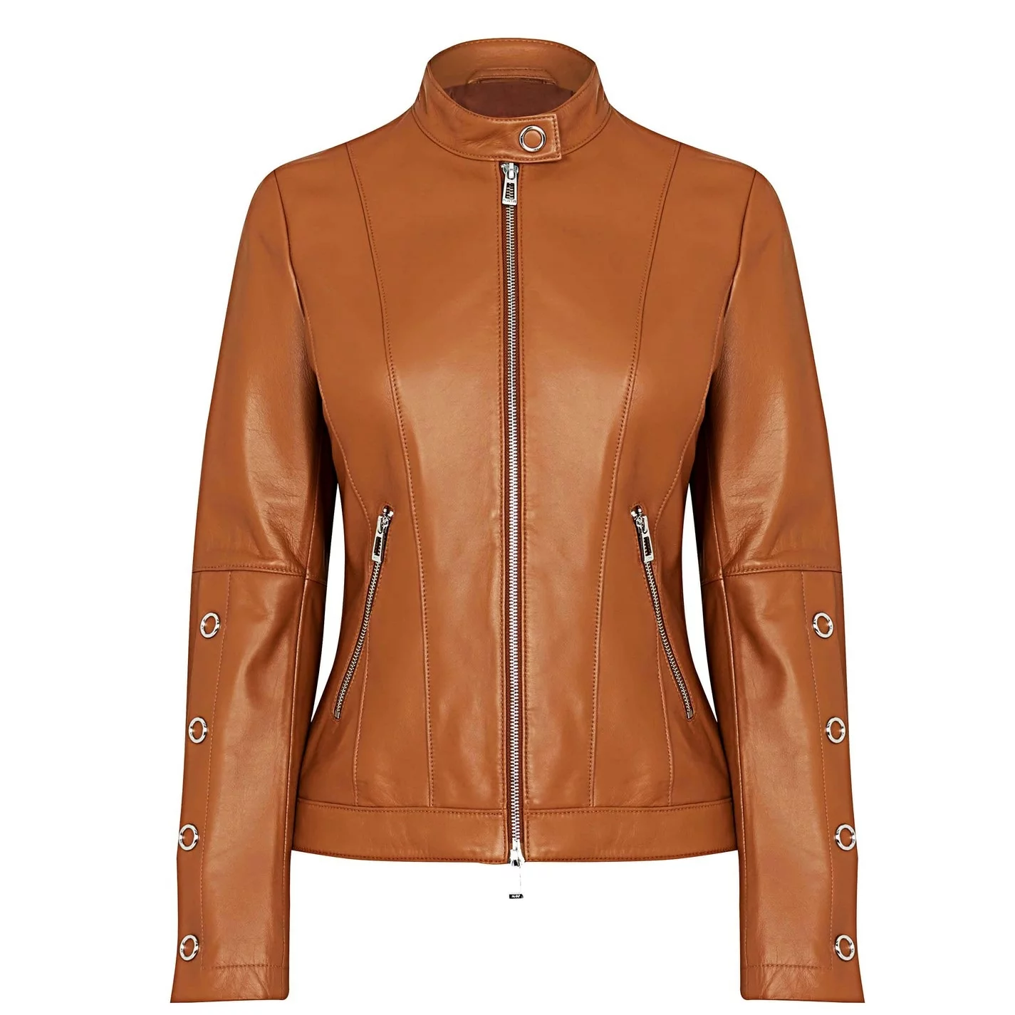 Update your everyday attire with the Lisaka Leather Jacket from Hugo Boss. Crafted with a premium Leather fabrication to the regular fit silhouette, this jacket styles a mandarin button collar, full zip fastening, long sleeves with button closure up the lower half and is finished with two zipped pockets. With a full Polyester lining, this jacket is perfect to style with jeans and a t-shirt for a smart-casual look.