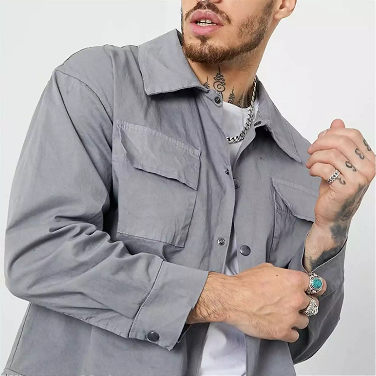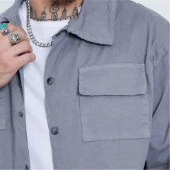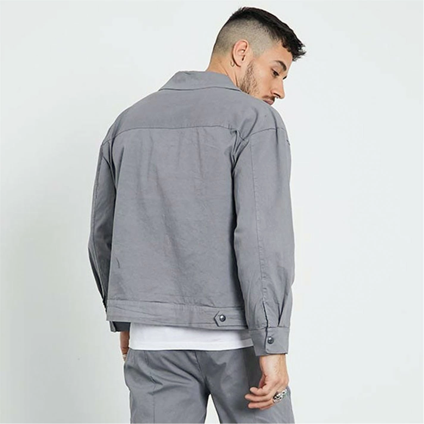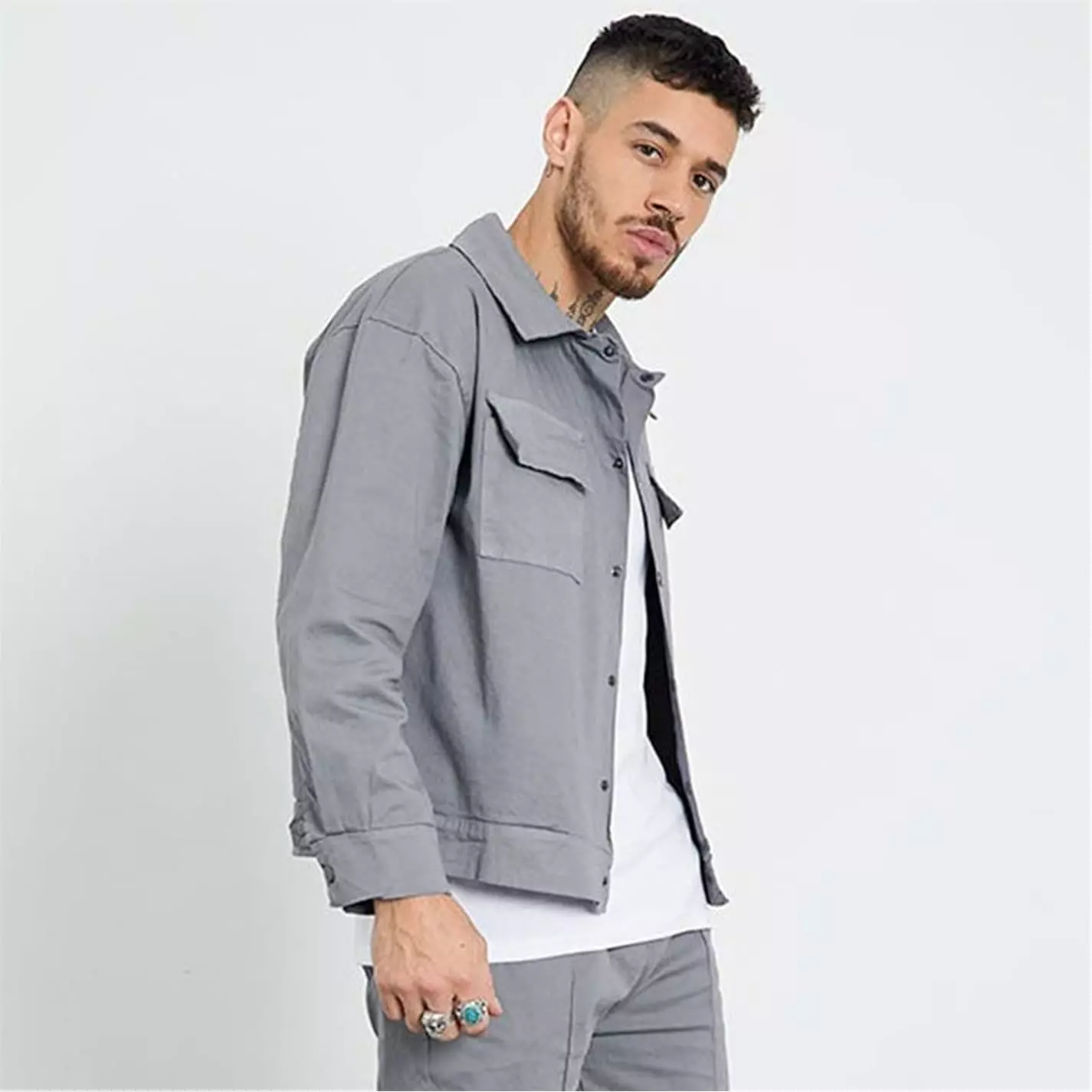 Men’s jacket in a boxy trucker style with chest pockets, a collar neckline and button up fastening.