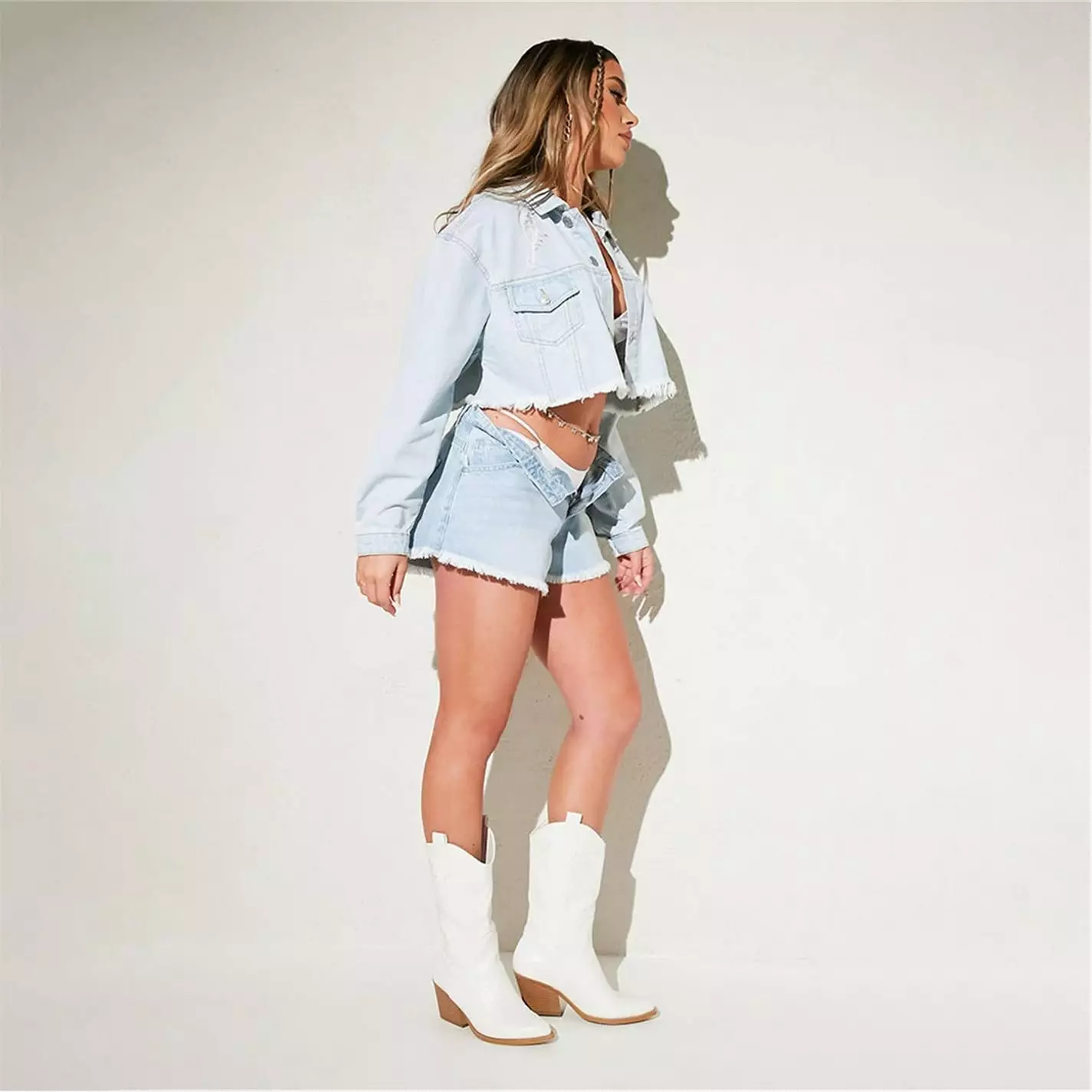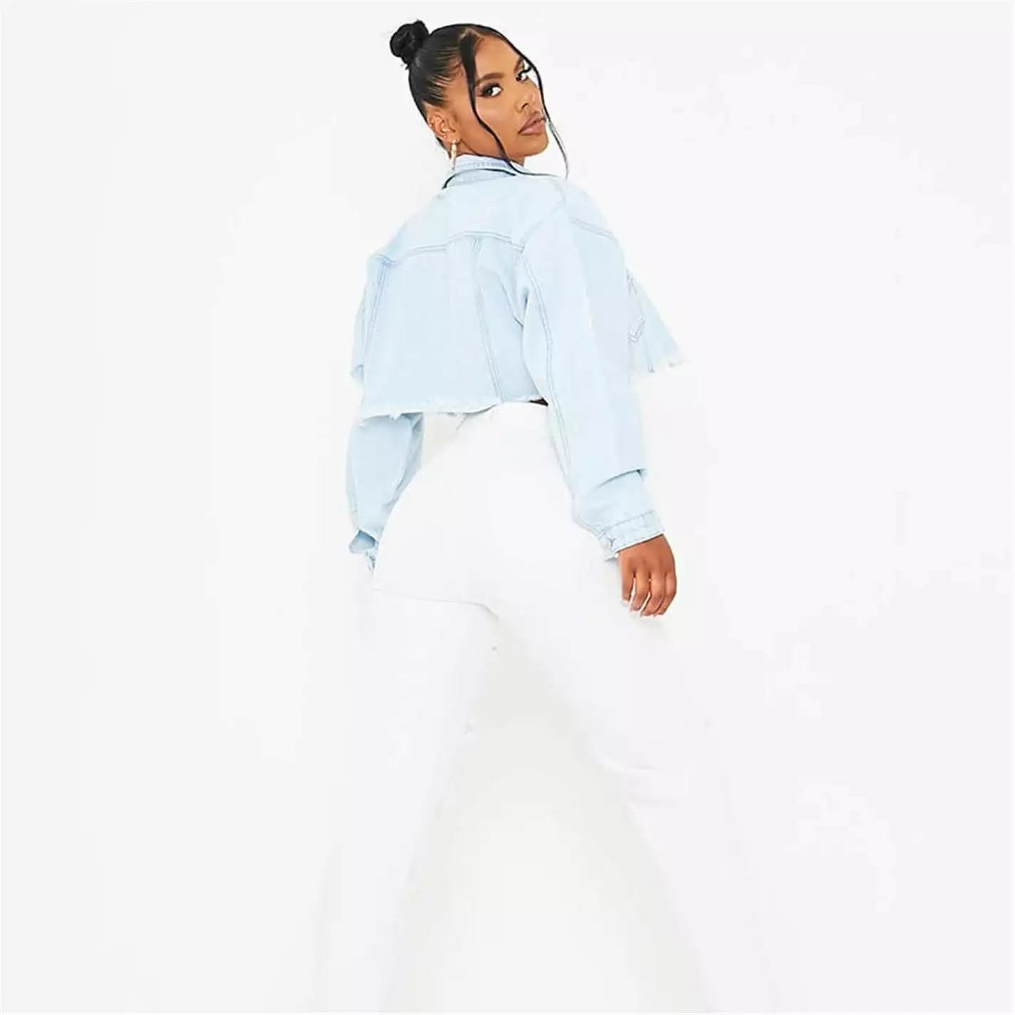 denim jacket in a cropped fit with batwing style sleeves and distressed detail.