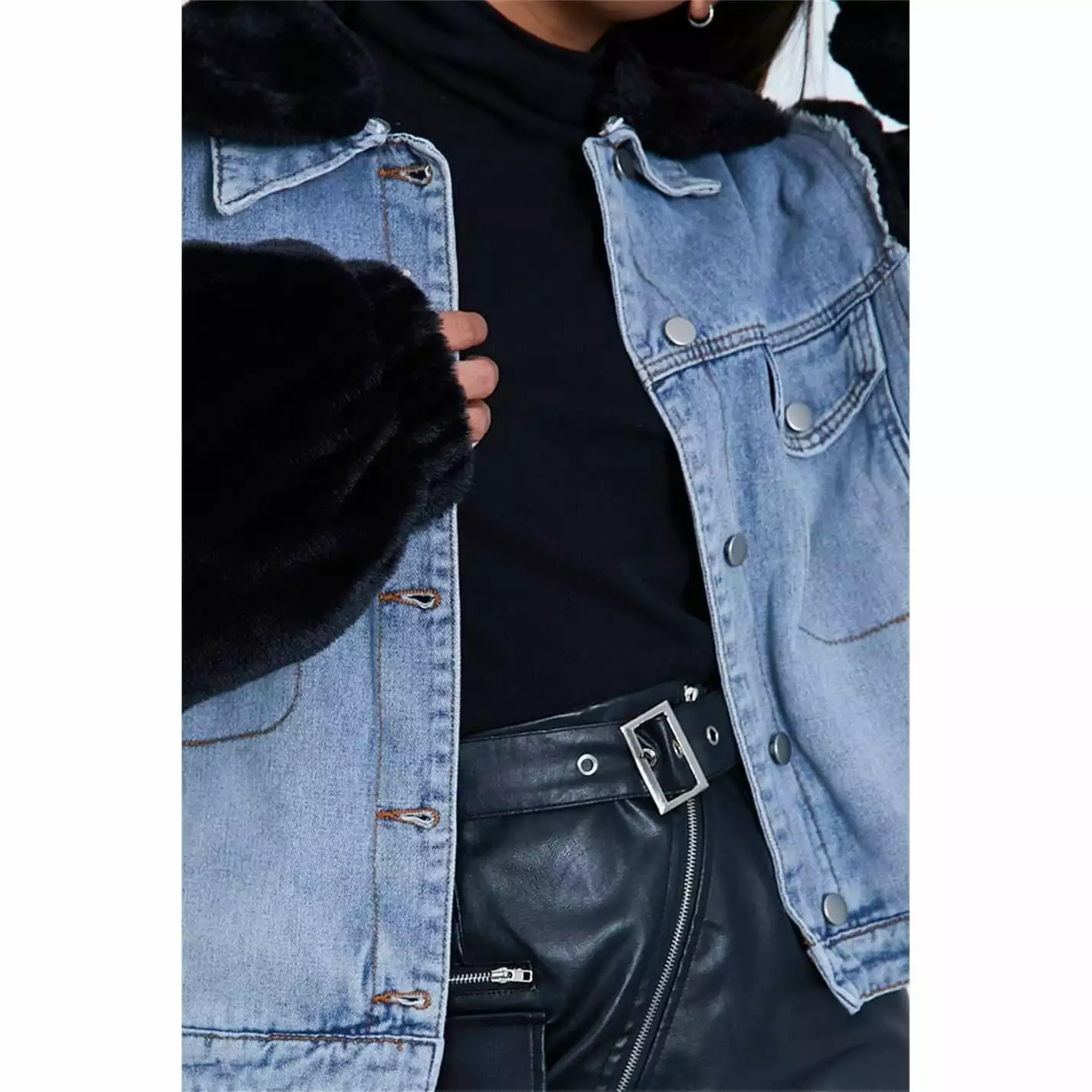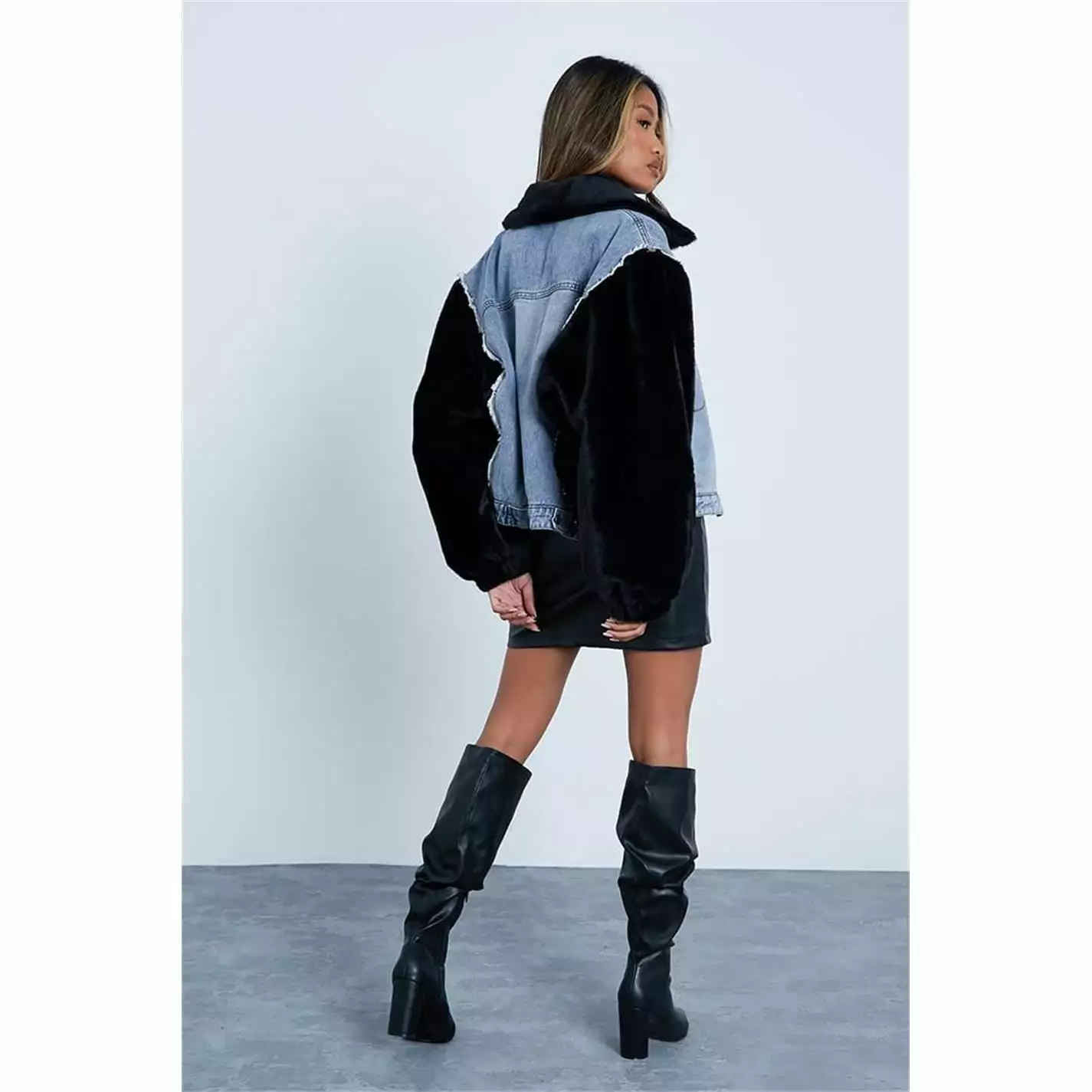denim jacket in an oversized fit with front button fasten and faux fur sleeve and collar detail.