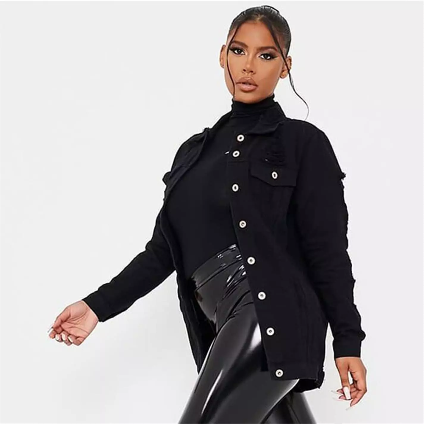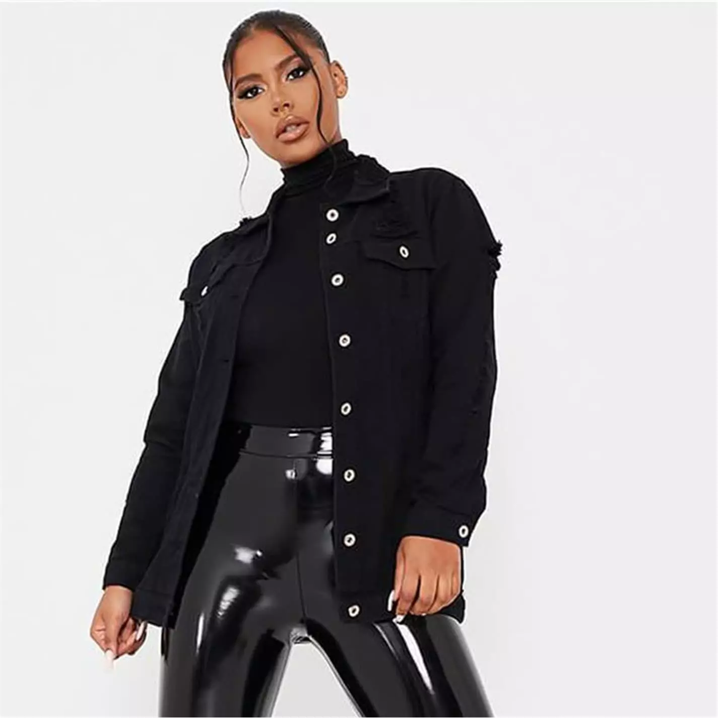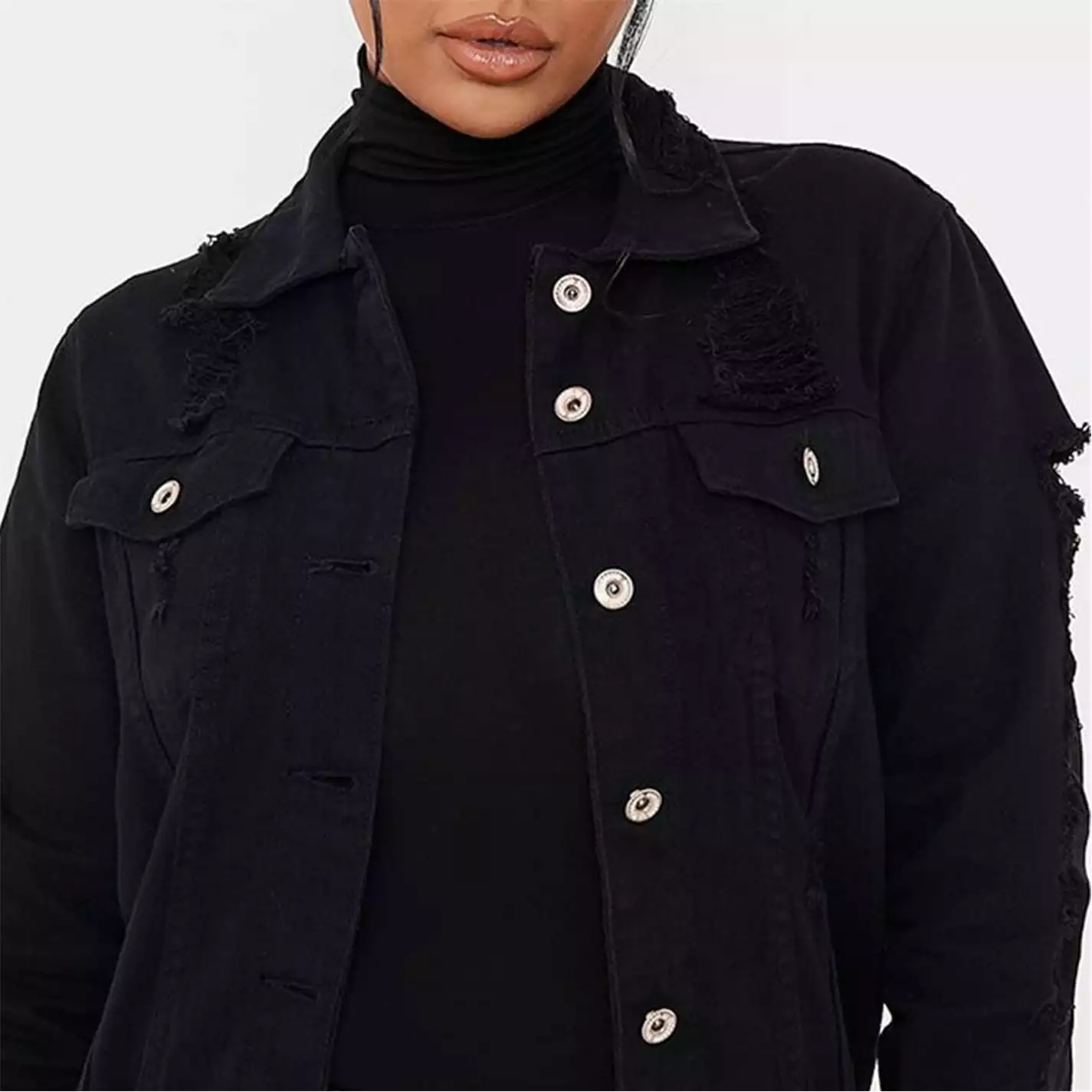 Denim jacket in a long line length and relaxed fit with distressed details, button front fastening and chest pockets.
